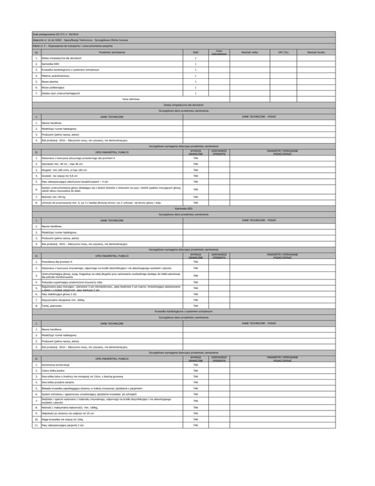Znak postępowania DZ-271-1- 45/2016 Załącznik nr 1A do SIWZ - Specyfikacja Techniczna - Szczegółowa Oferta Cenowa Pakiet nr 4 – Wyposażenie do transportu i unieruchomienia pacjenta Lp. Przedmiot zamówienia Ilość 1. Deska ortopedyczna dla dorosłych 1 2. Kamizelka KED 1 3. Krzesełko kardiologiczne z systemem schodowym 1 4. Materac podciśnieniowy 1 5. Nosze płachta 1 6. Nosze podbierające 1 7. Zestaw szyn unieruchamiających Cena jednostkowa Wartość netto VAT (%) 1 Cena ofertowa Deska ortopedyczna dla dorosłych Szczegółowe dane przedmiotu zamówienia I. DANE TECHNICZNE - PODAĆ DANE TECHNICZNE 1. Nazwa handlowa 2. Model/typ/ numer katalogowy 3. Producent (pełna nazwa, adres) 4. Rok produkcji 2016 – fabrycznie nowy, nie używany, nie demonstracyjny Szczegółowe wymagania dotyczące przedmiotu zamówienia II. WYMOGI GRANICZNE OPIS PARAMETRU, FUNKCJI 1. Wykonana z tworzywa sztucznego przeziernego dla promieni X TAK 2. Szerokość min. 40 cm , max 46 cm TAK 3. Długość- min.180 cmm, a max 183 cm TAK 4. Grubość nie więcej niż 4,8 cm TAK 5. Pasy zabezpieczające zakończone karabińczykami – 4 szt. TAK 6. System unieruchomienia głowy składający się z dwóch klocków z otworami na uszy i dwóch pasków mocujących głowę, całość łatwo mocowalna do deski TAK 7. Nośność min 150 kg TAK 8. Uchwyty do przenoszenia min. 6, po 3 z każdej dłuższej strony i po 2 uchwyty od strony głowy i stóp. ODPOWIEDŹ OFERENTA PARAMETRY OFEROWANE PODAĆ/OPISAĆ TAK Kamizelka KED Szczegółowe dane przedmiotu zamówienia I. DANE TECHNICZNE - PODAĆ DANE TECHNICZNE 1. Nazwa handlowa 2. Model/typ/ numer katalogowy 3. Producent (pełna nazwa, adres) 4. Rok produkcji 2016 – fabrycznie nowy, nie używany, nie demonstracyjny Szczegółowe wymagania dotyczące przedmiotu zamówienia II. WYMOGI GRANICZNE OPIS PARAMETRU, FUNKCJI 1. Przenikliwa dla promieni X TAK 2. Wykonana z tworzywa zmywalnego, odpornego na środki dezynfekujące i nie absorbującego wydzielin i płynów TAK 3. Unieruchamiająca głowę, szyję, kręgosłup na całej długości przy zachowaniu swobodnego dostępu do klatki piersiowej dla potrzeb monitorowania TAK 4. Poduszka wypełniająca anatomiczne krzywizny ciała TAK 5. Regulowane pasy mocujące : piersiowe 3 szt różnokolorowe., pasy biodrowe 2 szt czarne. Umożliwiające zastosowanie u dzieci i u kobiet ciężarnych, pasy barkowe 2 szt. TAK 6. Pasy stabilizujące głowę 2 szt. TAK 7. Dopuszczalne obciążenie min. 200kg TAK 8. Torba, pokrowiec ODPOWIEDŹ OFERENTA PARAMETRY OFEROWANE PODAĆ/OPISAĆ TAK Krzesełko kardiologiczne z systemem schodowym Szczegółowe dane przedmiotu zamówienia I. DANE TECHNICZNE - PODAĆ DANE TECHNICZNE 1. Nazwa handlowa 2. Model/typ/ numer katalogowy 3. Producent (pełna nazwa, adres) 4. Rok produkcji 2016 – fabrycznie nowy, nie używany, nie demonstracyjny Szczegółowe wymagania dotyczące przedmiotu zamówienia II. OPIS PARAMETRU, FUNKCJI WYMOGI GRANICZNE 1. Aluminiowa konstrukcja TAK 2. Cztery kółka jezdne TAK 3. Dwa kółka tylne o średnicy nie mniejszej niż 15cm, z bieżnią gumową TAK 4. Dwa kółka przednie skrętne TAK 5. Blokada krzesełka zapobiegająca złożeniu w trakcie znoszenia/ zjeżdżania z pacjentem TAK 6. System schodowy / gąsienicowy umożliwiający zjeżdżanie krzesełka po schodach TAK 7. Siedzisko i oparcie wykonane z materiału zmywalnego, odpornego na środki dezynfekujące i nie absorbującego wydzielin i płynów TAK 8. Nośność ( maksymalna ładowność) min. 180kg, TAK 9. Głębokość po złożeniu nie większa niż 25 cm TAK 10. Waga krzesełka nie więcej niż 12kg TAK 11. Pasy zabezpieczające pacjenta 2 szt. TAK ODPOWIEDŹ OFERENTA PARAMETRY OFEROWANE PODAĆ/OPISAĆ Wartość brutto Materac podciśnieniowy Szczegółowe dane przedmiotu zamówienia I. DANE TECHNICZNE - PODAĆ DANE TECHNICZNE 1. Nazwa handlowa 2. Model/typ/ numer katalogowy 3. Producent (pełna nazwa, adres) 4. Rok produkcji 2016 – fabrycznie nowy, nie używany, nie demonstracyjny Szczegółowe wymagania dotyczące przedmiotu zamówienia II. WYMOGI GRANICZNE OPIS PARAMETRU, FUNKCJI 1. Przenikliwy dla promieni X TAK 2. Poszycie zewnętrzne wykonane z tworzywa zmywalnego, odpornego na środki dezynfekujące i nie absorbującego wydzielin i płynów TAK 3. Wypełnienie w systemie pikowanych komór, uniemożliwiających przesuwanie się granulatu wypełniającego pod ciężarem pacjenta TAK 4. Bez dodatkowo dopinanej podłogi ochronnej TAK 5. Pasy zabezpieczające pacjenta 3 szt. TAK 6. Min. 4 uchwyty umożliwiające przenoszenie TAK 7. Pompka do odciągania powietrza TAK 8. Torba transportowa na całość TAK 9. Wymiary w przedziale 200-210 cm x 80-90 cm TAK 10. Nośność nie mniejsza niż 150 kg ODPOWIEDŹ OFERENTA PARAMETRY OFEROWANE PODAĆ/OPISAĆ TAK Nosze płachta Szczegółowe dane przedmiotu zamówienia I. DANE TECHNICZNE - PODAĆ DANE TECHNICZNE 1. Nazwa handlowa 2. Model/typ/ numer katalogowy 3. Producent (pełna nazwa, adres) 4. Rok produkcji 2016 – fabrycznie nowy, nie używany, nie demonstracyjny Szczegółowe wymagania dotyczące przedmiotu zamówienia II. OPIS PARAMETRU, FUNKCJI WYMOGI GRANICZNE 1. Część do leżenia wykonana z materiału zmywalnego odpornego na środki dezynfekujące i nie absorbującego wydzielin i płynów TAK 2. Nośność min. 150 kg. TAK 3. Wymiary min. 1900- 2000mm x700-750 mm TAK 4. Min. po 3 uchwyty do przenoszenia umieszczone na każdym z wzdłużnych boków ODPOWIEDŹ OFERENTA PARAMETRY OFEROWANE PODAĆ/OPISAĆ TAK Nosze podbierające Szczegółowe dane przedmiotu zamówienia I. DANE TECHNICZNE - PODAĆ DANE TECHNICZNE 1. Nazwa handlowa 2. Model/typ/ numer katalogowy 3. Producent (pełna nazwa, adres) 4. Rok produkcji 2016 – fabrycznie nowy, nie używany, nie demonstracyjny Szczegółowe wymagania dotyczące przedmiotu zamówienia II. WYMOGI GRANICZNE OPIS PARAMETRU, FUNKCJI 1. Konstrukcja wykonana ze stopów aluminium TAK 2. Budowa umożliwiająca regulację dł
