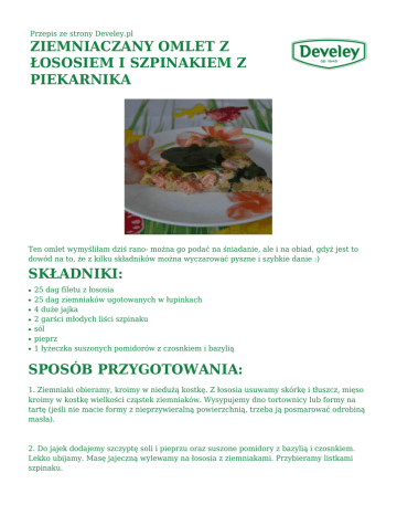 Przepis ze strony Develey.pl ZIEMNIACZANY OMLET Z ŁOSOSIEM I SZPINAKIEM Z PIEKARNIKA Ten omlet wymyśliłam dziś rano- można go podać na śniadanie, ale i na obiad, gdyż jest to dowód na to, że z kilku składników można wyczarować pyszne i szybkie danie :) SKŁADNIKI: ● ● ● ● ● ● ● 25 dag filetu z łososia 25 dag ziemniaków ugotowanych w łupinkach 4 duże jajka 2 garści młodych liści szpinaku sól pieprz 1 łyżeczka suszonych pomidorów z czosnkiem i bazylią SPOSÓB PRZYGOTOWANIA: 1. Ziemniaki obieramy, kroimy w niedużą kostkę. Z łososia usuwamy skórkę i tłuszcz, mięso kroimy w kostkę wielkości cząstek ziemniaków. Wysypujemy dno tortownicy lub formy na tartę (jeśli nie macie formy z nieprzywieralną powierzchnią, trzeba ją posmarować odrobiną masła). 2. Do jajek dodajemy szczyptę soli i pieprzu oraz suszone pomidory z bazylią i czosnkiem. Lekko ubijamy. Masę jajeczną wylewamy na łososia z ziemniakami. Przybieramy listkami szpinaku. 3. Pieczemy w piekarniku nagrzanym do 180 stopni do czasu aż jajka ładnie się zetną. Przed podaniem przybieramy pozostałymi listkami szpinaku.