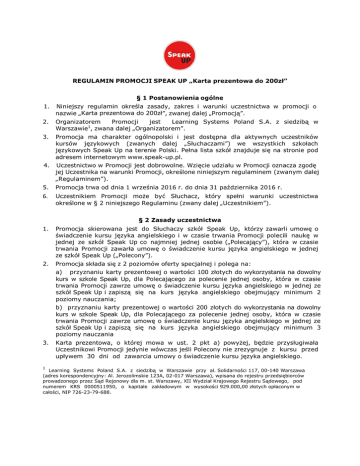 REGULAMIN PROMOCJI SPEAK UP „Karta prezentowa do 200zł” § 1 Postanowienia ogólne 1. Niniejszy regulamin określa zasady, zakres i warunki uczestnictwa w promocji o nazwie „Karta prezentowa do 200zł”, zwanej dalej „Promocją”. 2. Organizatorem Promocji jest Learning Systems Poland S.A. z siedzibą w Warszawie1, zwana dalej „Organizatorem”. 3. Promocja ma charakter ogólnopolski i jest dostępna dla aktywnych uczestników kursów językowych (zwanych dalej „Słuchaczami”) we wszystkich szkołach językowych Speak Up na terenie Polski. Pełna lista szkół znajduje się na stronie pod adresem internetowym www.speak-up.pl. 4. Uczestnictwo w Promocji jest dobrowolne. Wzięcie udziału w Promocji oznacza zgodę jej Uczestnika na warunki Promocji, określone niniejszym regulaminem (zwanym dalej „Regulaminem”). 5. Promocja trwa od dnia 1 września 2016 r. do dnia 31 października 2016 r. 6. Uczestnikiem Promocji może być Słuchacz, który spełni warunki uczestnictwa określone w § 2 niniejszego Regulaminu (zwany dalej „Uczestnikiem”). § 2 Zasady uczestnictwa 1. Promocja skierowana jest do Słuchaczy szkół Speak Up, którzy zawarli umowę o świadczenie kursu języka angielskiego i w czasie trwania Promocji polecili naukę w jednej ze szkół Speak Up co najmniej jednej osobie („Polecający”), która w czasie trwania Promocji zawarła umowę o świadczenie kursu języka angielskiego w jednej ze szkół Speak Up („Polecony”). 2. Promocja składa się z 2 poziomów oferty specjalnej i polega na: a) przyznaniu karty prezentowej o wartości 100 złotych do wykorzystania na dowolny kurs w szkole Speak Up, dla Polecającego za polecenie jednej osoby, która w czasie trwania Promocji zawrze umowę o świadczenie kursu języka angielskiego w jednej ze szkół Speak Up i zapiszą się na kurs języka angielskiego obejmujący minimum 2 poziomy nauczania; b) przyznaniu karty prezentowej o wartości 200 złotych do wykorzystania na dowolny kurs w szkole Speak Up, dla Polecającego za polecenie jednej osoby, która w czasie trwania Promocji zawrze umowę o świadczenie kursu języka angielskiego w jednej ze szkół Speak Up i zapiszą się na kurs języka angielskiego obejmujący minimum 3 poziomy nauczania 3. 1 Karta prezentowa, o której mowa w ust. 2 pkt a) powyżej, będzie przysługiwała Uczestnikowi Promocji jedynie wówczas jeśli Polecony nie zrezygnuje z kursu przed upływem 30 dni od zawarcia umowy o świadczenie kursu języka angielskiego. Learning Systems Poland S.A. z siedzibą w Warszawie przy al. Solidarności 117, 00-140 Warszawa (adres korespondencyjny: Al. Jerozolimskie 123A, 02-017 Warszawa), wpisana do rejestru przedsiębiorców prowadzonego przez Sąd Rejonowy dla m. st. Warszawy, XII Wydział Krajowego Rejestru Sądowego, pod numerem KRS 0000511950, o kapitale zakładowym w wysokości 929.000,00 złotych opłaconym w całości, NIP 726-23-79-688. 4. Karta prezentowa, o której mowa w ust. 2 pkt. b) powyżej, Uczestnik Promocji otrzyma jeśli spełni wymóg wymieniony w tymże ustępie oraz jeśli Polecony nie zrezygnuje z kursu przed upływem 30 dni od zawarcia umowy o świadczenie kursu języka angielskiego. 5. Karta prezentowa, o której mowa w ust. 2 pkt. c) powyżej, Uczestnik Promocji otrzyma jeśli spełni wymóg wymieniony w tymże ustępie oraz jeśli Polecony nie zrezygnuje z kursu przed upływem 30 dni od zawarcia umowy o świadczenie kursu języka angielskiego. 6. Uczestnikami Promocji nie mogą być pracownicy Organizatora, ich współmałżonkowie i dzieci, jak też osoby pozostające z nimi we wspólnym gospodarstwie domowym oraz współpracownicy Organizatora, ani osoby pozostające z nim w stosunku zlecenia lub innym stosunki prawnym, do którego stosuje się przepisy o zleceniu, współmałżonkowie i dzieci takich osób, jak też osoby pozostające z nimi we wspólnym gospodarstwie domowym. § 3 Przebieg Promocji 1. Nad prawidłowym przebiegiem Promocji czuwają pracownicy Organizatora przez niego powołani, którzy w razie potrzeby będą pomagać w rozstrzygnięciu wątpliwości dotyczących zasad Promocji, postanowień i interpretacji jej Regulaminu. 2. Lista punktów, w których można zrealizować karty prezentowe, o których mowa w § 2 ust. 2 pkt. a), b ) i c ) niniejszego Regulaminu, dostępna jest w recepcji każdej szkoły Speak Up oraz na dedykowanej komunikacji marketingowej. 3. Odbiór karty prezentowej, o której mowa w § 2 ust. 2 pkt. a), b) i c) niniejszego Regulaminu, nastąpi w szkole Speak Up, do której zapisany jest Uczestnik po uiszczeniu przez niego opłaty w wysokości 1 zł netto. § 4 Postępowanie reklamacyjne 1. Reklamacje dotyczące przebiegu Promocji mogą być zgłaszane wyłącznie pisemnie na adres Organizatora. 2. Prawo złożenia reklamacji przysługuje jedynie Uczestnikowi Promocji przez okres trwania Promocji oraz w ciągu 45 dni po upływie jej trwania. W przypadku przesłania reklamacji drogą pocztową o zachowaniu terminu składania reklamacji decyduje data stempla pocztowego. 3. Pisemna reklamacja powinna zawierać imię, nazwisko, dokładny adres osoby uczestniczącej w Promocji, jak również dokładny opis i wskazanie przyczyny reklamacji. 4. Reklamacje rozpatrywane będą w terminie 14 dni od dnia otrzymania reklamacji przez Organizatora. 5. Decyzja w przedmiocie reklamacji jest ostatecznym i wiążącym stanowiskiem Organizatora. 1. 2. § 5 Postanowienia końcowe Regulamin Promocji dostępny jest w szkołach Speak Up na terenie Polski oraz pod adresem internetowym http://lp.empikschool.com/document/SU_POLEC_WRZES_2016.pdf Organizator zastrzega sobie prawo do zmiany Regulaminu, pod warunkiem, że taka zmiana nie naruszy praw nabytych Uczestników Promocji. Informacje o zmianie Regulaminu podane będą pod adresem internetowym wskazanym w ust. 1 powyżej ze stosownym wyprzedzeniem. 3. Akceptacja Regulaminu jest jednoznaczna z wyrażeniem zgody na wykorzystanie i przetwarzanie d