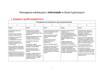 Wymagania edukacyjne z informatyki w klasie I gimnazjum 1. Komputer i grafika komputerowa Posługiwanie się komputerem i jego oprogramowaniem 2 3 4 5 Uczeń: Uczeń: Uczeń: podaje kilka zastosowań komputera; wskazuje kilka przykładów zastosowania komputera, np. w szkole, zakładach pracy i życiu społecznym; omawia zastosowanie komputera omawia schemat działania w różnych dziedzinach życia, komputera, m.in. nauki i gospodarki; przekształcanie informacji w dane, przetwarzanie danych omawia podstawowe układy oraz wyjaśnia funkcje procesora mieszczące się na płycie odpowiedzialnego za te głównej; procesy; wyjaśnia, czym jest BIOS; potrafi przeliczać liczby z systemu binarnego na podaje przykłady kart dziesiątkowy; rozszerzeń, które można wymienia części składowe zestawu komputerowego; posługuje się komputerem i urządzeniami TI w podstawowym zakresie; podaje kilka przykładów urządzeń współpracujących z komputerem; wie, że nadmierna ilość czasu spędzonego przy komputerze zagraża zdrowiu psychicznemu i fizycznemu; zdaje sobie sprawę, że można uzależnić się od komputera; zna i stosuje sposoby zapobiegania uzależnianiu się od komputera definiuje komputer jako zestaw urządzeń elektronicznych i określa ich przeznaczenie; zna jednostki pojemności pamięci; zna pojęcia: program komputerowy, pamięć, system dwójkowy, bit, bajt, RAM; potrafi przeliczać liczby z systemu dziesiątkowego na binarny; wymienia i omawia różne typy komputerów oraz budowę i działanie wybranych urządzeń peryferyjnych oraz urządzeń techniki użytkowej Uczeń: przelicza jednostki pamięci; zainstalować w komputerze; wymienia i omawia różne typy komputerów oraz budowę i działanie wybranych urządzeń peryferyjnych oraz urządzeń techniki użytkowej, np. drukarki, skanera omawia różne typy komputerów oraz budowę i działanie urządzeń peryferyjnych oraz urządzeń techniki użytkowej, np. tablicy interaktywnej, kamery cyfrowej i internetowej 6 Uczeń: potrafi określić podstawowe parametry części składowych komputera i urządzeń peryferyjnych oraz urządzeń techniki użytkowej; opisuje wybrane zastosowania informatyki, z uwzględnieniem swoich zainteresowań, oraz ich wpływ na osobisty rozwój, rynek pracy i rozwój ekonomiczny; wie czym jest kod ASCII i szesnastkowy system liczenia samodzielnie wyszukuje w Internecie informacje o nowych urządzeniach peryferyjnych oraz urządzeniach techniki użytkowej; korzysta z dokumentacji urządzeń elektronicznych 1 zna podstawowe zasady pracy z programem komputerowym (uruchamianie, wybór opcji z menu, kończenie pracy z programem) omawia przeznaczenie poszczególnych rodzajów programów użytkowych, podając przykłady konkretnych programów; wie, na czym polega uruchamianie i instalowanie programów; umieszcza skrót programu na pulpicie; podaje przykłady nośników pamięci wybiórczo korzysta z Pomocy do programów; wyjaśnia rolę pamięci operacyjnej w czasie uruchamiania wyjaśnia procesy zachodzące programu; w czasie uruchamiania i instalowania programu; wie, jak odinstalować program komputerowy potrafi zainstalować i odinstalować prosty program, np. edukacyjny, grę; potrafi pobrać program, np. darmowy, z Internetu i zainstalować go wie, jaka jest rola systemu operacyjnego zna podstawowe funkcje systemu podaje przykłady systemów operacyjnego operacyjnych wie, że należy posiadać licencję na używany program komputerowy; wie, czym jest licencja na program, i wymienia jej rodzaje; wie, na czym polega piractwo komputerowe i jakie grożą sankcje za nielegalne uzyskanie programu komputerowego w celu osiągnięcia korzyści majątkowych wymienia przykłady przestępczości komputerowej potrafi skorzystać w razie potrzeby z Pomocy do programu; zna pojęcie: prawo autorskie; omawia przykładowe rodzaje darmowych licencji; omawia przejawy przestępczości komputerowej 2 określa pojemność pamięci, ilość wolnego i zajętego miejsca na dysku; wyszukuje w Internecie lub innych źródłach informacje na temat nowych programów użytkowych i nośników pamięci omawia cechy wybranych systemów operacyjnych, m.in.: Windows, Linux, Mac OS porównuje wybrane systemy operacyjne, podając różnice wyjaśnia różnice między różnymi rodzajami licencji; korzystając z Internetu lub innych źródeł, odszukuje więcej informacji na temat darmowych licencji rozumie zasady licencji na używany program Opracowywanie za pomocą komputera obrazów (rysunków, zdjęć) 2 3 4 5 6 Uczeń: Uczeń: Uczeń: Uczeń: Uczeń: przy użyciu wybranego edytora grafiki tworzy prosty rysunek, używając podstawowych narzędzi graficznych; zna i omawia zasady tworzenia dokumentu komputerowego na przykładzie tworzenia rysunku w programie graficznym; zna podstawowe formaty plików graficznych; przekształca formaty plików graficznych; potrafi zapisać dokument komputerowy w pliku w określonym miejscu (dysku, folderze); odczytuje rysunek zapisany w pliku, wprowadza zmiany i zapisuje ponownie plik rozumie, dlaczego należy zapisać dokument na wybranym nośniku pamięci masowej; wykonuje operacje na obrazie i jego fragmentach, m.in.: zaznacza, kopiuje i wkleja fragmenty rysunku i zdjęcia, stosując wybrane programy graficzne; umieszcza napisy na obrazie, porównując możliwości dwóch wybranych programów graficznych; samodzielnie wyszukuje możliwości wybranego programu graficznego; przy użyciu wybranego edytora grafiki tworzy rysunki, stosując operacje na obrazie i jego fragmentach, przekształca obrazy; umieszcza napisy na obrazie; wie, czym są warstwy obrazu; tworzy obraz z wykorzystaniem pracy na warstwach; korzysta z różnych narzędzi selekcji; wykonuje fotomontaż, korzystając z możliwości pracy na warstwach obrazu; tworzy animacje komputerowe; drukuje rysunek tworzy rozbudowane animacje komputerowe; zmienia kolory i inne efekty na zdjęciu, stosując wybrane programy graficzne; tworzy animacje, 
