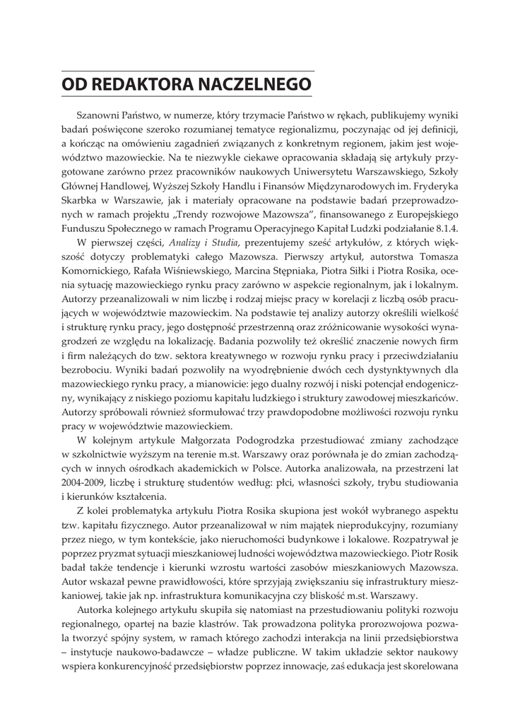 OD REDAKTORA NACZELNEGO Szanowni Państwo, w numerze, który trzymacie Państwo w rękach, publikujemy wyniki badań poświęcone szeroko rozumianej tematyce regionalizmu, poczynając od jej definicji, a kończąc na omówieniu zagadnień związanych z konkretnym regionem, jakim jest województwo mazowieckie. Na te niezwykle ciekawe opracowania składają się artykuły przygotowane zarówno przez pracowników naukowych Uniwersytetu Warszawskiego, Szkoły Głównej Handlowej, Wyższej Szkoły Handlu i Finansów Międzynarodowych im. Fryderyka Skarbka w Warszawie, jak i materiały opracowane na podstawie badań przeprowadzonych w ramach projektu „Trendy rozwojowe Mazowsza”, finansowanego z Europejskiego Funduszu Społecznego w ramach Programu Operacyjnego Kapitał Ludzki podziałanie 8.1.4. W pierwszej części, Analizy i Studia, prezentujemy sześć artykułów, z których większość dotyczy problematyki całego Mazowsza. Pierwszy artykuł, autorstwa Tomasza Komornickiego, Rafała Wiśniewskiego, Marcina Stępniaka, Piotra Siłki i Piotra Rosika, ocenia sytuację mazowieckiego rynku pracy zarówno w aspekcie regionalnym, jak i lokalnym. Autorzy przeanalizowali w nim liczbę i rodzaj miejsc pracy w korelacji z liczbą osób pracujących w województwie mazowieckim. Na podstawie tej analizy autorzy określili wielkość i strukturę rynku pracy, jego dostępność przestrzenną oraz zróżnicowanie wysokości wynagrodzeń ze względu na lokalizację. Badania pozwoliły też określić znaczenie nowych firm i firm należących do tzw. sektora kreatywnego w rozwoju rynku pracy i przeciwdziałaniu bezrobociu. Wyniki badań pozwoliły na wyodrębnienie dwóch cech dystynktywnych dla mazowieckiego rynku pracy, a mianowicie: jego dualny rozwój i niski potencjał endogeniczny, wynikający z niskiego poziomu kapitału ludzkiego i struktury zawodowej mieszkańców. Autorzy spróbowali również sformułować trzy prawdopodobne możliwości rozwoju rynku pracy w województwie mazowieckiem. W kolejnym artykule Małgorzata Podogrodzka przestudiować zmiany zachodzące w szkolnictwie wyższym na terenie m.st. Warszawy oraz porównała je do zmian zachodzących w innych ośrodkach akademickich w Polsce. Autorka analizowała, na przestrzeni lat 2004-2009, liczbę i strukturę studentów według: płci, własności szkoły, trybu studiowania i kierunków kształcenia. Z kolei problematyka artykułu Piotra Rosika skupiona jest wokół wybranego aspektu tzw. kapitału fizycznego. Autor przeanalizował w nim majątek nieprodukcyjny, rozumiany przez niego, w tym kontekście, jako nieruchomości budynkowe i lokalowe. Rozpatrywał je poprzez pryzmat sytuacji mieszkaniowej ludności województwa mazowieckiego. Piotr Rosik badał także tendencje i kierunki wzrostu wartości zasobów mieszkaniowych Mazowsza. Autor wskazał pewne prawidłowości, które sprzyjają zwiększaniu się infrastruktury mieszkaniowej, takie jak np. infrastruktura komunikacyjna czy bliskość m.st. Warszawy. Autorka kolejnego artykułu skupiła się natomiast na przestudiowaniu polityki rozwoju regionalnego, opartej na bazie klastrów. Tak prowadzona polityka prorozwojowa pozwala tworzyć spójny system, w ramach którego zachodzi interakcja na linii przedsiębiorstwa – instytucje naukowo-badawcze – władze publiczne. W takim układzie sektor naukowy wspiera konkurencyjność przedsiębiorstw poprzez innowacje, zaś edukacja jest skorelowana z potrzebami rynku pracy, co z kolei podnosi konkurencyjność regionu i przyciąga nowych inwestorów. W swoich badaniach Wanda Pełka przeanalizowała budowę klastrów na ternie województwa mazowieckiego, co pozwoliło wykazać jej przeszkody, jakie występowały przy wdrażaniu i kontynuowaniu tego typu inicjatyw na Mazowszu. Autorka następnego artykułu, Małgorzata Sulmicka, skoncentrowała się na zmianach w strukturze rolnictwa oraz przemysłu rolniczego na terenie województwa mazowieckiego. Zbadała zmiany w strukturze agralnej Mazowsza, jakie nastąpiły po wstąpieniu Polski do Unii Europejskiej. Wynikiem tych badań jest wskazanie trendów rozwojowych, widocznych w strukturze mazowieckich gospodarstw rolnych. Ostatni artykuł w tej części, autorstwa Romana Szula, jest analizą pojęcia „regionalizm”, które można badać poprzez pryzmat dwóch, jakże odmiennych od siebie, definicji: według jednej z nich regionalizm to współpraca państw położonych w jakimś regionie świata, zaś według drugiej – ruch na rzecz obrony interesów gospodarczych, kulturowych lub politycznych regionów, rozumianych jako części oddzielnych państw. Autor skupił się na badaniu regionalizmu rozumianego jako region, czyli część kraju/państwa, przy czym w analizie zagadnienia wyszedł on od definicji samego pojęcia, przez jego klasyfikację, a skończył na omówieniu jego znaczenia we współczesnej Europie. W artykule przebadane zostały także czynniki kształtujące cechy dystynktywne dla regionów, w których może pojawić się regionalizm. Autor zauważył, że regionalizm jest tym silniejszy, im więcej czynników składa się na specyfikę regionu i im bardziej pozytywnie są one ocenianie przez jego mieszkańców. Na koniec autor omówił wpływ Unii Europejskiej na stymulowanie regionalizmu, jako czynnika sprzyjającego akcesji i korzystaniu z funduszy unijnych. W części drugiej, Samorząd, publikujemy artykuł autorstwa Michała Hackiewicza, który powstał m.in. dzięki doświadczeniom międzynarodowym autora w zakresie wymiany wyników prac dotyczących planowania przestrzennego i rozwoju regionalnego, realizowanych przez Samorząd Województwa Mazowieckiego w ramach projektów międzynarodowych, takich jak np.: Rail Baltica Growth Corridor. W materiale przestudiowano potencjalne korzyści dla Polski i województwa mazowieckiego, jakie powstaną w wyniku budowy na tym terenie dwóch transportowych korytarzy transeuropejskich – Rail Baltica i Baltic-Adriatic. W 
