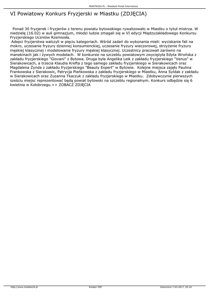 MIASTKO24.PL - Miastecki Portal Internetowy VI Powiatowy Konkurs Fryzjerski w Miastku (ZDJĘCIA) Ponad 30 fryzjerek i fryzjerów z terenu powiatu bytowskiego rywalizowało w Miastku o tytuł mistrza. W niedzielę (16.02) w auli gimnazjum, młodzi ludzie zmagali się w VI edycji Międzyzakładowego Konkursu Fryzjerskiego Uczniów Rzemiosła. Adepci fryzjerstwa walczyli w pięciu kategoriach. Wśród zadań do wykonania mieli: wyciskanie fali na mokro, uczesanie fryzury dziennej konsumenckiej, uczesanie fryzury wieczorowej, strzyżenie fryzury męskiej klasycznej i modelowanie fryzury męskiej klasycznej. Uczestnicy pracowali zarówno na manekinach jak i żywych modelach. W konkursie na szczeblu powiatowym zwyciężyła Edyta Wrońska z zakładu fryzjerskiego "Giovani" z Bytowa. Druga była Angelika Leik z zakładu fryzjerskiego "Venus" w Sierakowicach, a trzecia Klaudia Krefta z tego samego zakładu fryzjerskiego w Sierakowicach oraz Magdalena Żynda z zakładu fryzjerskiego "Beauty Expert" w Bytowie. Kolejne miejsca zajęły Paulina Frankowska z Sierakowic, Patrycja Pieńkowska z zakładu fryzjerskiego w Miastku, Anna Syldak z zakładu w Sierakowicach oraz Zuzanna Tkaczuk z zakładu fryzjerskiego w Miastku. Zdobywczynie pierwszych sześciu miejsc reprezentować będą powiat bytowski na szczeblu regionalnym. Konkurs odbędzie się 6 kwietnia w Kołobrzegu.>> ZOBACZ ZDJĘCIA http://www.miastko24.pl Kreator PDF Utworzono 7-03-2017, 05:24