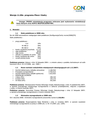 Wersja 11.00a programu Płace i Kadry Uwaga: PRZED reinstalacją programu zalecane jest wykonanie reindeksacji bazy danych oraz KOPII BEZPIECZEŃSTWA. 1. Nowości 1.1 Stałe podatkowe w 2008 roku Na rok 2008 wprowadzono następujące stałe podatkowe (Konfiguracja/Cechy roczne/2008/[F5] Stałe podatkowe) : progi podatkowe : 0 zł 19% 44 490 zł 30% 85 528 zł 40% koszty uzyskania przychodu 111,25 ulga podatkowa 48,90 ulga roczna 586,85 zaliczka na podatek od umów 19% koszty uzyskania dla umów 20% ryczałt poniŜej kwoty 0.00 Podstawa prawna: Ustawa z dnia 16 listopada 2006 r. o zmianie ustawy o podatku dochodowym od osób fizycznych (Dz.U. Nr 217/2006, poz. 1588 ). 1.2 Nowe wartości wskaźników miesięcznych obowiązujących od 1.12.2007r. Dochód deklarowany (składka zdrowotna) Przeciętne wynagrodzenie Dochód deklarowany (składki społeczne) MINIMALNE UCZNIÓW I klasa (4%) II klasa (5%) III klasa (6%) 2.168,30zł 2.703,41zł 1.622,05zł 108,14zł 135,17zł 162,20zł Podstawa prawna: Obwieszczenie Prezesa Głównego Urzędu Statystycznego z dnia 15 października 2007r. w sprawie przeciętnego miesięcznego wynagrodzenia w sektorze przedsiębiorstw, włącznie z wypłatami z zysku, w trzecim kwartale 2007r. Podstawa prawna: Komunikat Prezesa Głównego Urzędu Statystycznego z dnia 12 listopada 2007r. w sprawie przeciętnego wynagrodzenia w trzecim kwartale 2007r. 1.3 Minimalne wynagrodzenie w 2008 roku Od 1 stycznia 2008r. minimalne wynagrodzenie pracownika wynosi 1.126,00zł. Podstawa prawna: Rozporządzenie Rady Ministrów z dnia 11 września 2007r. w sprawie wysokości minimalnego wynagrodzenia za pracę w 2008r.(Dz. U. Nr 171/2007, poz. 1209). 1 1.4 Wskaźnik waloryzacji świadczenia rehabilitacyjnego w I kwartale 2008 roku. Wskaźnik waloryzacji w I kwartale 2008 - wynosi 99,8%. Oznacza to, Ŝe podstawa świadczenia rehabilitacyjnego nie zostanie zwaloryzowana. Podstawa prawna: Obwieszczenie Prezesa Zakładu Ubezpieczeń Społecznych z dnia 20 listopada 2007r. w sprawie wskaźnika waloryzacji podstawy wymiaru zasiłku chorobowego przyjętej do obliczenia świadczenia rehabilitacyjnego w I kwartale 2008r. 1.5 Zmiana składki rentowej w 2008 roku. Od 1 stycznia 2008r. obowiązuje nowy procent składki rentowej: Ubezpieczony – 1,5% Płatnik – 4,5%. 1.6 Roczna podstawa składek emerytalno-rentowych w 2008 roku W momencie udostępniania wersji PIK 11.00a nie zostało opublikowane Obwieszczenie Ministra Pracy i Polityki Społecznej w sprawie rocznej wartości 30-krotności przeciętnego miesięcznego wynagrodzenia. Po jej opublikowaniu wartość będzie moŜna: Samodzielnie uzupełnić, Zaimportować z poziomu Cech roczne (Konfiguracja – Cechy roczne – F10 Pobierz z Internetu). 1.7 Konfiguracja / Kalendarze / Dni wolne / Świąteczne Dodano święta ruchome występujące w 2008r. Są to: 23 marca 2008 – Wielkanoc 24 marca 2008 - Poniedziałek Wielkanocny 22 maja 2008 - BoŜe Ciało 1.8 Nazwa skrócona a system SOD OffLine Dla firm generujących deklaracje do systemu SOD OffLine wprowadzono moŜliwość wpisanie nazwy skróconej firmy. Nazwa ta wykazywana jest na deklaracji infd (PFRON). W związku z tym, w Konfiguracji / Firma / Nazwa i adres dodano pole Nazwa skrócona SOD. Odpowiada jej nowa zmienna lokalna FIR:SKRSOD. Jeśli pole Nazwa skrócona SOD jest: puste – odczytuje wartość z cechy FIR:SKROCONA (działanie jak dotychczas), wypełnione – nazwa skrócona pobierana jest na deklarację z tego pola. 1.9 Pobieranie wskaźników z Internetu UmoŜliwiono pobieranie wskaźników z Internetu. Funkcja dostępna jest z poziomu Konfiguracja \ Cechy roczne lub Cechy miesięczne \ F10\ Pobierz z Internetu. Funkcjonalność dostępna jest tylko dla UŜytkowników posiadających aktualną gwarancję (asystę CDN). W przypadku pobierania z Internetu cech rocznych program dokonuje importu następujących wartości: Stałe podatkowe (progi, procent podatku, koszty uzyskania, ulgę podatkową, roczne koszty uzyskania, zaliczkę podatku od umów), Wskaźniki (roczna postawa składek emerytalno-rentowych). W przypadku pobierania z Internetu cech miesięcznych program dokonuje importu następujących wartości: 2 Wskaźniki (przeciętne wynagrodzenie, dochód deklarowany (skł. społeczne), dochód deklarowany (skł. zdrowotne), minimalne wynagrodzenie pracownika, uczniów I, II, III klasy, podstawa emerytalno-rentowa dla wychowawczych, wskaźnik waloryzacji podstawy zas. chorobowych), Składki ZUS (emerytalne, rentowa firmy i pracownika, chorobowa, FP, FGŚP, składka zdrowotna pobrana i odliczona). Import dokonywany jest dla wybranego miesiąca. Polega na nadpisaniu istniejących wartości. W celu rozpropagowania tych wartości na kolejne miesiące moŜna: Wykonać import dla kolejnych, wybranych miesięcy (F3 wybierz miesiąc i rok – F10 Pobierz z Internetu), Skopiować zaimportowaną wartość na kolejne miesiące (stojąc na danej wartości – F5 skopiuj) 1.10 Informacje o programie - www strona Klienta W aktualnej wersji programu PIK 11.00a wprowadzono moŜliwość automatycznego logowania się do Indywidualnej strony UŜytkownika systemu. Funkcjonalność ta dostępna jest z poziomu Informacji o programie (Menu główne – Ctrl+F1 – F10). Wywołana strona zawiera: Informacje o zainstalowanym programie (nazwa programu, numer seryjny, dane właściciela programu, termin waŜności), Dane teleadresowe Partnera, Informacje o działalności firmy Comarch, Formularza zgłoszenia sugestii do programu, WaŜne linki do stron www. W związku z moŜliwością logowania się do indywidualnej strony Klienta rozszerzono blokady do programu. Na liście Ogólnych praw do programu pojawia się nowa pozycja: Strona www Klienta. Standardowo wszyscy UŜytkownicy mają ustawiony zakaz do logowania się do strony www. Przyznanie prawa do logowania się do strony moŜe dokonać Operator mający status administratora i pełne prawa do programu. Uwaga: Przy wywoływaniu strony www program C