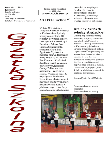 KWIECIEŃ 2013 Kociszew Gazetka wydawana od 1990 roku przez Samorząd Uczniowski Szkoły Podstawowej w Kociszewie Szkolna strona internetowa od 1995 roku: www.kociszew.pl 40 LECIE SZKOŁY W dniu 30 kwietnia w Wiejskim Centrum rekreacji w Kociszewie odbyła się uroczystość z okazji 40 rocznicy powstania szkoły. Uroczystości uczestniczyli Burmistrz Zelowa Pani Urszula Świerczyńska, sekretarz Miasta Pani Agnieszka Mysłowska, zastępca przewodniczącego Rady Miejskiej w Zelowie Pan Krzysztof Kryściński, dyrektorzy wieli palcówek oświatowych, jednostek Gminy Zelów, rodzice, absolwenci i uczniowie szkoły. Wręczono nagrody zwycięzcom konkursów literackiego, plastycznego i zawodów sportowych, które zorganizowane zostały w jubileuszowym roku. Były podziękowania kilkadziesiąt ostatnich lat wspólnych działań dla rozwoju społeczności szkolnej Kociszewa, prezentacje wierszy i piosenek oraz występ teatrzyku szkolnego. Gminny konkurs wiedzy strażackiej Gminny etap konkursu wiedzy strażackiej odbył się 20 marca w budynku Straży Pożarnej w Zelowie. Ze Szkoły Podstawowej w Kociszewie pojechali tam: Szymon Tyluś i Dominik Solecki. O godzinie 1000 rozpoczął się test, a potem była dogrywka, gdyż 4 uczniów (w tym dwóch z Kociszewa) miało po 40 punktów. Każdy z uczestników musiał odpowiedzieć ustnie na 3 pytania. Ostatecznie zwyciężył Szymon Tyluś i to właśnie on przeszedł do konkursu powiatowego. Szymon Tyluś i Dawid Hańczka Powiatowy konkurs wiedzy strażackiej Powiatowy konkurs wiedzy strażackiej odbył się 27 marca w Bełchatowie. Reprezentantem gminy Zelów w kategorii szkół podstawowych był Szymon Tyluś. O godzinie 1030 rozpoczął się test. Po jego napisaniu wszyscy uczestnicy zostali zaproszeni przez strażaków na pokaz sprzętu. W tym czasie jurorzy sprawdzali wyniki sprawdzianów. Wkrótce potem zostały ogłoszone wyniki. Niestety Szymon zajął tym razem 4 miejsce i nie dostał się do dalszej części konkursu. Szymon Tyluś i Dawid Hańczka Filharmonia W tym roku szkolnym kontynuowane są spotkania z muzyką, jakie organizuje dla dzieci Towarzystwo Muzyczne im. Karola Szymanowskiego w Łodzi. Koncerty odbywają się raz w miesiącu i są one dla wszystkich wielką atrakcją. Oczywiście nie tylko dlatego, że przepadają wtedy lekcje (choć dla nas to jest też przyjemne), ale choćby dzięki niespodziankom, jakie przygotowują muzycy. 9 kwietnia 2013 w naszej szkole odbył się kolejny koncert, tym razem pt . ,,Muzyka z daleka”. Pan Paweł i pan Mariusz przywieźli do nas wspaniałego Gościa - panią Małgorzatę, która grała na oboju. Zagrała nam m.in.: muzykę z serialu pt . ,,Na Wspólnej”, poloneza z filmu „Pan Tadeusz” oraz utwór ,, Cztery pory roku”. Jak co miesiąc pan Paweł wybrał dwie osoby, aby spróbowały zagrać na tym instrumencie. Byli to Kacper Karbownik i Dominika Łuczak. Cieszymy się z dzisiejszego spotkania i dostarczenia nam dobrej zabawy. Już nie możemy doczekać się kolejnego spotkania. Bardzo nam się podobają te comiesięczne spotkania. Gdyby nie te koncerty, może nigdy nie przeżylibyśmy tak wspaniałych chwil z muzyką! Kamila Książczyk i Paulina Kaczmarek Konkurs „Matematyczne zabawy” 9 kwietnia 2013 roku w Szkole Podstawowej nr 4 w Zelowie odbył się konkurs matematyczny pod hasłem „Matematyczne zabawy”. Uczestniczyły w nim trzyosobowe reprezentacje szkół podstawowych z terenu Gminy Zelów. Naszą szkołę reprezentowali: Oskar Kaliszuk, Hubert Rysz i Mateusz Małecki. Uczniowie rozwiązywali różnego typu zadania matematyczne wymagające od nich nie tylko wiadomości, ale także umiejętności logicznego myślenia. Nasi uczniowie Zajęli 5 miejsce. Jesteśmy z nich bardzo dumni, ponieważ chodzą oni do czwartej klasy, a ich przeciwnikami byli głównie szóstoklasiści. Julia Ton i Lidia Chrzanowska Sprawdzian szóstoklasisty 2013 4 kwietnia uczniowie klasy VI naszej szkoły, podobnie jak ich rówieśnicy w całej Polsce, pisali sprawdzian wiedzy i umiejętności z zakresu szkoły podstawowej. Sprawdzian ten ma za zadanie zbadać umiejętności uczniów z zakresu umiejętność czytania, pisania, rozumowania, korzystania z informacji oraz wykorzystania wiedzy w praktyce. Maksymalnie na sprawdzianie można uzyskać 40 punktów. W tym roku zestaw egzaminacyjny składał się z 26 zadań. Pierwsze 20 zadań to tzw. zadania zamknięte, czyli takie, w których uczeń wskazywał tylko jedną prawidłową odpowiedź. Pozostałe, to tzw. zadania otwarte, czyli takie, w których uczeń musiał zapisać wszystkie swoje obliczenia (w zad. matematycznych) lub napisać wypracowanie czy zaprezentować swój warsztat literacki w krótszej formie wypowiedzi. Z matematyki uczniowie musieli umieć porównać pola i objętości oraz zamienić złotówki na grosze i zaokrąglić liczby, natomiast z języka polskiego - napisać argumentację, dlaczego warto poprawnie mówić i pisać w języku polskim oraz w liście polecić swojemu koledze ulubioną książkę. Sprawdzian rozpoczął się o godz. 900 i trwał równo godzinę. Wszyscy nasi uczniowie przystąpili do tego sprawdzianu, zatem nie było konieczności korzystania z terminów dodatkowych. Wyniki sprawdzianu będą znane pod koniec czerwca. Uczniowie otrzymają zaświadczania wraz ze świadectwami ukończenia szkoły podstawowej podczas uroczystości zakończenia roku szkolnego. Będą one dla nauczycieli podstawą oceny efektów pracy i pomogą zaplanować działania w dziedzinie nauczania w następnym roku. Paulina Kaczmarek „Stokrotki” zatańczyły na ludowo 13 marca 2013 r. „Stokrotki” z naszej zerówki po raz kolejny wzięły udział w X Gminnym Konkursie Tańca Ludowego i Nowoczesnego, zorganizowanym w Domu Kultury przez Przedszkole Samorządowe nr 1 w Zelowie. Tradycyjnie konkurs odbył się w dwóch kategoriach – tańca ludowego i nowoczesnego. Podczas prezentacji tanecznych uczestnikom bacznie przygląd