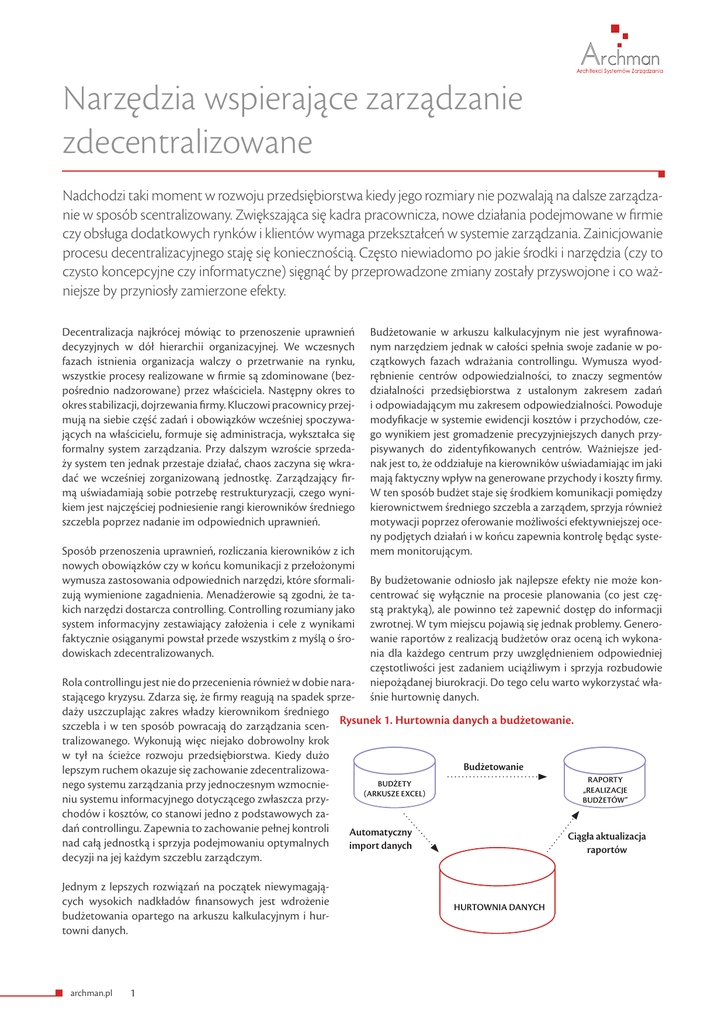 Narzędzia wspierające zarządzanie zdecentralizowane Nadchodzi taki moment w rozwoju przedsiębiorstwa kiedy jego rozmiary nie pozwalają na dalsze zarządzanie w sposób scentralizowany. Zwiększająca się kadra pracownicza, nowe działania podejmowane w firmie czy obsługa dodatkowych rynków i klientów wymaga przekształceń w systemie zarządzania. Zainicjowanie procesu decentralizacyjnego staję się koniecznością. Często niewiadomo po jakie środki i narzędzia (czy to czysto koncepcyjne czy informatyczne) sięgnąć by przeprowadzone zmiany zostały przyswojone i co ważniejsze by przyniosły zamierzone efekty. Decentralizacja najkrócej mówiąc to przenoszenie uprawnień decyzyjnych w dół hierarchii organizacyjnej. We wczesnych fazach istnienia organizacja walczy o przetrwanie na rynku, wszystkie procesy realizowane w firmie są zdominowane (bezpośrednio nadzorowane) przez właściciela. Następny okres to okres stabilizacji, dojrzewania firmy. Kluczowi pracownicy przejmują na siebie część zadań i obowiązków wcześniej spoczywających na właścicielu, formuje się administracja, wykształca się formalny system zarządzania. Przy dalszym wzroście sprzedaży system ten jednak przestaje działać, chaos zaczyna się wkradać we wcześniej zorganizowaną jednostkę. Zarządzający firmą uświadamiają sobie potrzebę restrukturyzacji, czego wynikiem jest najczęściej podniesienie rangi kierowników średniego szczebla poprzez nadanie im odpowiednich uprawnień. Sposób przenoszenia uprawnień, rozliczania kierowników z ich nowych obowiązków czy w końcu komunikacji z przełożonymi wymusza zastosowania odpowiednich narzędzi, które sformalizują wymienione zagadnienia. Menadżerowie są zgodni, że takich narzędzi dostarcza controlling. Controlling rozumiany jako system informacyjny zestawiający założenia i cele z wynikami faktycznie osiąganymi powstał przede wszystkim z myślą o środowiskach zdecentralizowanych. Budżetowanie w arkuszu kalkulacyjnym nie jest wyrafinowanym narzędziem jednak w całości spełnia swoje zadanie w początkowych fazach wdrażania controllingu. Wymusza wyodrębnienie centrów odpowiedzialności, to znaczy segmentów działalności przedsiębiorstwa z ustalonym zakresem zadań i odpowiadającym mu zakresem odpowiedzialności. Powoduje modyfikacje w systemie ewidencji kosztów i przychodów, czego wynikiem jest gromadzenie precyzyjniejszych danych przypisywanych do zidentyfikowanych centrów. Ważniejsze jednak jest to, że oddziałuje na kierowników uświadamiając im jaki mają faktyczny wpływ na generowane przychody i koszty firmy. W ten sposób budżet staje się środkiem komunikacji pomiędzy kierownictwem średniego szczebla a zarządem, sprzyja również motywacji poprzez oferowanie możliwości efektywniejszej oceny podjętych działań i w końcu zapewnia kontrolę będąc systemem monitorującym. By budżetowanie odniosło jak najlepsze efekty nie może koncentrować się wyłącznie na procesie planowania (co jest częstą praktyką), ale powinno też zapewnić dostęp do informacji zwrotnej. W tym miejscu pojawią się jednak problemy. Generowanie raportów z realizacją budżetów oraz oceną ich wykonania dla każdego centrum przy uwzględnieniem odpowiedniej częstotliwości jest zadaniem uciążliwym i sprzyja rozbudowie niepożądanej biurokracji. Do tego celu warto wykorzystać właśnie hurtownię danych. Rola controllingu jest nie do przecenienia również w dobie narastającego kryzysu. Zdarza się, że firmy reagują na spadek sprzedaży uszczuplając zakres władzy kierownikom średniego szczebla i w ten sposób powracają do zarządzania scen- Rysunek 1. Hurtownia danych a budżetowanie. tralizowanego. Wykonują więc niejako dobrowolny krok w tył na ścieżce rozwoju przedsiębiorstwa. Kiedy dużo Budżetowanie lepszym ruchem okazuje się zachowanie zdecentralizowaRAPORTY BUDŻETY nego systemu zarządzania przy jednoczesnym wzmocnie„REALIZACJE (ARKUSZE EXCEL) niu systemu informacyjnego dotyczącego zwłaszcza przyBUDŻETÓW” chodów i kosztów, co stanowi jedno z podstawowych zadań controllingu. Zapewnia to zachowanie pełnej kontroli Automatyczny Ciągła aktualizacja nad całą jednostką i sprzyja podejmowaniu optymalnych import danych raportów decyzji na jej każdym szczeblu zarządczym. Jednym z lepszych rozwiązań na początek niewymagających wysokich nadkładów finansowych jest wdrożenie budżetowania opartego na arkuszu kalkulacyjnym i hurtowni danych. archman.pl 1 HURTOWNIA DANYCH Panuje przekonanie, że hurtownia danych przeznaczona jest dla dużych firm, co wynika głównie z jej ceny. W rzeczywistości jednak cena hurtowni danych jest bardzo różna gdyż zależy od wielu czynników, takich jak m.in.: liczba użytkowników, liczba obsługiwanych raportów, poziom rozproszenia źródeł importu danych czy lokalizacji serwera (własny lub dzierżawiony). Wdrożenie hurtowni danych na potrzeby budżetowania w dużej mierze minimalizuje jej koszt będąc w zasięgu firm średnich. Hurtownia w budżetowaniu spełni wiele funkcji, przede wszystkim zagwarantuje prosty, przejrzysty i ciągły dostęp (np. przez stronę internetową) do danych na temat realizacji budżetów nie tylko zarządowi, ale każdemu kierownikowi ośrodka odpowiedzialności. Wszystko z uwzględnieniem określonych uprawnień dla każdego użytkownika. Ponadto budżety (plany) z arkuszy kalkulacyjnych mogą zostać z łatwością zaczytane do hurtowni, gdzie ich dalsza obróbka: agregacja, scalanie, czy sprawdzanie poprawności danych dokonywane jest automatycznie. Taki mechanizm działania zwalnia firmę z opracowywania zbiorczych arkuszy budżetowych, tworzenia skomplikowanych połączeń między nimi i przygotowywania dla nich specjalnych uprawnień dostępowych, które w przypadku Excela będą stanowiły nie lada wyzwanie. Ostatecznie na poziomie hurtowni nastąpi zestawienie planowanych wartości z war