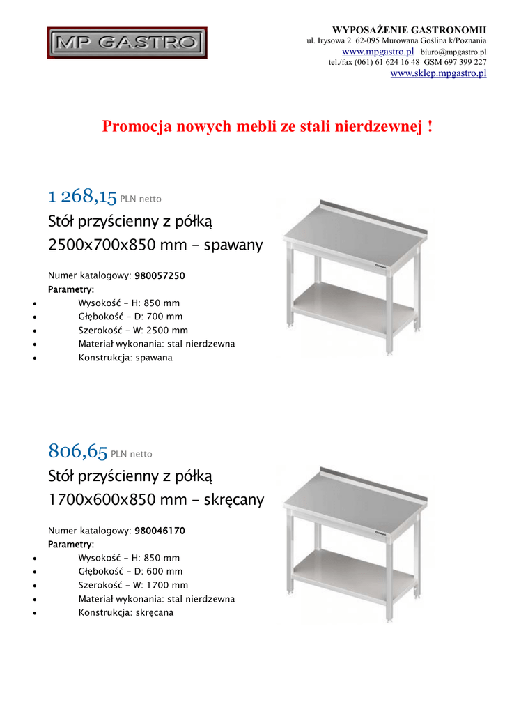 WYPOSAŻENIE GASTRONOMII ul. Irysowa 2 62-095 Murowana Goślina k/Poznania www.mpgastro.pl [email protected] tel./fax (061) 61 624 16 48 GSM 697 399 227 www.sklep.mpgastro.pl Promocja nowych mebli ze stali nierdzewnej ! 1 268,15 PLN netto Stół przyścienny z półką 2500x700x850 mm - spawany Numer katalogowy: 980057250 Parametry: Wysokość - H: 850 mm Głębokość - D: 700 mm Szerokość - W: 2500 mm Materiał wykonania: stal nierdzewna Konstrukcja: spawana 806,65 PLN netto Stół przyścienny z półką 1700x600x850 mm - skręcany Numer katalogowy: 980046170 Parametry: Wysokość - H: 850 mm Głębokość - D: 600 mm Szerokość - W: 1700 mm Materiał wykonania: stal nierdzewna Konstrukcja: skręcana 741,65 PLN netto Stół przyścienny z półką 1500x600x850 mm - skręcany Numer katalogowy: 980046150 Parametry: Wysokość - H: 850 mm Głębokość - D: 600 mm Szerokość - W: 1500 mm Materiał wykonania: stal nierdzewna Konstrukcja: skręcana 931,45 PLN netto Stół ze zlewem 1-kom.(l), z półką 1200x600x850 mm - skręcany Numer katalogowy: 980706120 Parametry: Wysokość - H: 850 mm Głębokość - D: 600 mm Szerokość - W: 1200 mm Materiał wykonania: stal nierdzewna Konstrukcja: skręcana 828,10 PLN netto Stół ze zlewem 1-kom.(l), z półką 800x700x850 mm - skręcany Numer katalogowy: 980707080 Parametry: Wysokość - H: 850 mm Głębokość - D: 700 mm Szerokość - W: 800 mm Materiał wykonania: stal nierdzewna Konstrukcja: skręcana 1 175,20 PLN netto Stół ze zlewem 2-kom.(l), z półką 1200x600x850 mm - skręcany Numer katalogowy: 980846120 Parametry: Wysokość - H: 850 mm Głębokość - D: 600 mm Szerokość - W: 1200 mm Materiał wykonania: stal nierdzewna Konstrukcja: skręcana 1 751,75 PLN netto Stół przyścienny z szafką i drzwiami skrzydłowymi 1200x700x850 mm spawany Numer katalogowy: 980547120 Parametry: Wysokość - H: 850 mm Głębokość - D: 700 mm Szerokość - W: 1200 mm Materiał wykonania: stal nierdzewna Konstrukcja: spawana 2 135,25 PLN netto Szafa porządkowa z umywalką 1000x500x2000 mm - spawana Numer katalogowy: 981475100 Parametry: Wysokość - H: 2000 mm Głębokość - D: 500 mm Szerokość - W: 1000 mm Materiał wykonania: stal nierdzewna Konstrukcja: spawana 1 242,80 PLN netto Szafa magazynowa, drzwi skrzydłowe 500x500x1800 mm - spawana Numer katalogowy: 981485050 Parametry: Wysokość - H: 1800 mm Głębokość - D: 500 mm Szerokość - W: 500 mm Materiał wykonania: stal nierdzewna Konstrukcja: spawana 684,45 PLN netto Regał magazynowy, półki pełne 1000x600x1800 - skręcany Numer katalogowy: 981886100 Parametry: Wysokość - H: 1800 mm Głębokość - D: 600 mm Szerokość - W: 1000 mm Materiał wykonania: stal nierdzewna Konstrukcja: skręcana Zapraszamy do współpracy Zespół MP Gastro Tel. 61 624 16 48, 697 399 227 E-mail: [email protected]