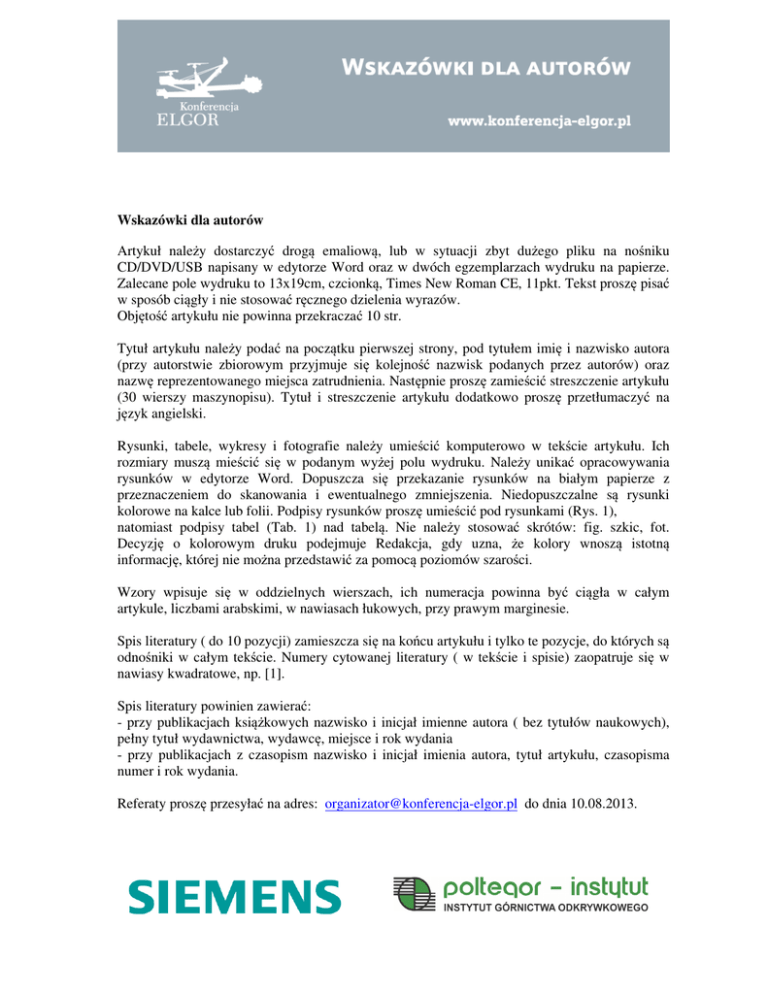 Wskazówki dla autorów Artykuł należy dostarczyć drogą emaliową, lub w sytuacji zbyt dużego pliku na nośniku CD/DVD/USB napisany w edytorze Word oraz w dwóch egzemplarzach wydruku na papierze. Zalecane pole wydruku to 13x19cm, czcionką, Times New Roman CE, 11pkt. Tekst proszę pisać w sposób ciągły i nie stosować ręcznego dzielenia wyrazów. Objętość artykułu nie powinna przekraczać 10 str. Tytuł artykułu należy podać na początku pierwszej strony, pod tytułem imię i nazwisko autora (przy autorstwie zbiorowym przyjmuje się kolejność nazwisk podanych przez autorów) oraz nazwę reprezentowanego miejsca zatrudnienia. Następnie proszę zamieścić streszczenie artykułu (30 wierszy maszynopisu). Tytuł i streszczenie artykułu dodatkowo proszę przetłumaczyć na język angielski. Rysunki, tabele, wykresy i fotografie należy umieścić komputerowo w tekście artykułu. Ich rozmiary muszą mieścić się w podanym wyżej polu wydruku. Należy unikać opracowywania rysunków w edytorze Word. Dopuszcza się przekazanie rysunków na białym papierze z przeznaczeniem do skanowania i ewentualnego zmniejszenia. Niedopuszczalne są rysunki kolorowe na kalce lub folii. Podpisy rysunków proszę umieścić pod rysunkami (Rys. 1), natomiast podpisy tabel (Tab. 1) nad tabelą. Nie należy stosować skrótów: fig. szkic, fot. Decyzję o kolorowym druku podejmuje Redakcja, gdy uzna, że kolory wnoszą istotną informację, której nie można przedstawić za pomocą poziomów szarości. Wzory wpisuje się w oddzielnych wierszach, ich numeracja powinna być ciągła w całym artykule, liczbami arabskimi, w nawiasach łukowych, przy prawym marginesie. Spis literatury ( do 10 pozycji) zamieszcza się na końcu artykułu i tylko te pozycje, do których są odnośniki w całym tekście. Numery cytowanej literatury ( w tekście i spisie) zaopatruje się w nawiasy kwadratowe, np. [1]. Spis literatury powinien zawierać: - przy publikacjach książkowych nazwisko i inicjał imienne autora ( bez tytułów naukowych), pełny tytuł wydawnictwa, wydawcę, miejsce i rok wydania - przy publikacjach z czasopism nazwisko i inicjał imienia autora, tytuł artykułu, czasopisma numer i rok wydania. Referaty proszę przesyłać na adres: [email protected] do dnia 10.08.2013.