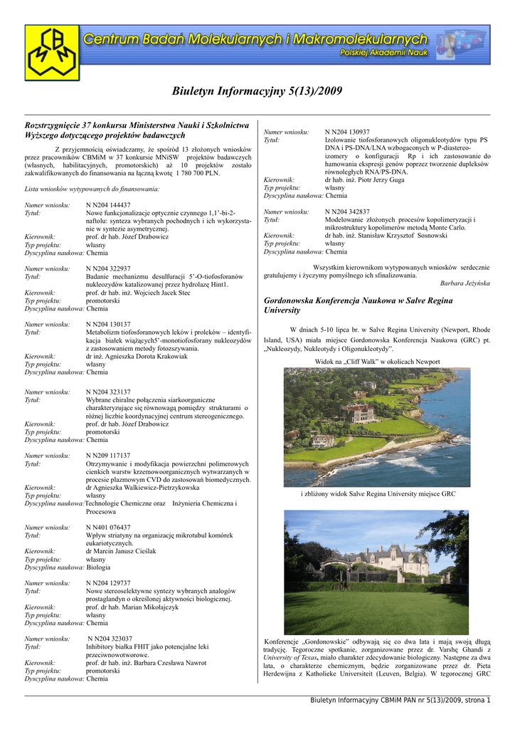 Biuletyn Informacyjny 5(13)/2009 Rozstrzygnięcie 37 konkursu Ministerstwa Nauki i Szkolnictwa Wyższego dotyczącego projektów badawczych Z przyjemnością oświadczamy, że spośród 13 złożonych wniosków przez pracowników CBMiM w 37 konkursie MNiSW projektów badawczych (własnych, habilitacyjnych, promotorskich) aż 10 projektów zostało zakwalifikowanych do finansowania na łączną kwotę 1 780 700 PLN. Lista wniosków wytypowanych do finansowania: Numer wniosku: Tytuł: N N204 144437 Nowe funkcjonalizacje optycznie czynnego 1,1’-bi-2naftolu: synteza wybranych pochodnych i ich wykorzystanie w syntezie asymetrycznej. Kierownik: prof. dr hab. Józef Drabowicz Typ projektu: własny Dyscyplina naukowa: Chemia Numer wniosku: Tytuł: N N204 322937 Badanie mechanizmu desulfuracji 5’-O-tiofosforanów nukleozydów katalizowanej przez hydrolazę Hint1. Kierownik: prof. dr hab. inż. Wojciech Jacek Stec Typ projektu: promotorski Dyscyplina naukowa: Chemia Numer wniosku: Tytuł: N N204 130137 Metabolizm tiofosforanowych leków i proleków – identyfikacja białek wiążących5’-monotiofosforany nukleozydów z zastosowaniem metody fotozszywania. Kierownik: dr inż. Agnieszka Dorota Krakowiak Typ projektu: własny Dyscyplina naukowa: Chemia Numer wniosku: Tytuł: N N204 130937 Izolowanie tiofosforanowych oligonukleotydów typu PS DNA i PS-DNA/LNA wzbogaconych w P-diastereoizomery o konfiguracji Rp i ich zastosowanie do hamowania ekspresji genów poprzez tworzenie dupleksów równoległych RNA/PS-DNA. Kierownik: dr hab. inż. Piotr Jerzy Guga Typ projektu: własny Dyscyplina naukowa: Chemia Numer wniosku: Tytuł: N N204 342837 Modelowanie złożonych procesów kopolimeryzacji i mikrostruktury kopolimerów metodą Monte Carlo. Kierownik: dr hab. inż. Stanisław Krzysztof Sosnowski Typ projektu: własny Dyscyplina naukowa: Chemia Wszystkim kierownikom wytypowanych wniosków serdecznie gratulujemy i życzymy pomyślnego ich sfinalizowania. Barbara Jeżyńska Gordonowska Konferencja Naukowa w Salve Regina University W dniach 5-10 lipca br. w Salve Regina University (Newport, Rhode Island, USA) miała miejsce Gordonowska Konferencja Naukowa (GRC) pt. „Nukleozydy, Nukleotydy i Oligonukleotydy”. Widok na „Cliff Walk” w okolicach Newport Numer wniosku: Tytuł: N N204 323137 Wybrane chiralne połączenia siarkoorganiczne charakteryzujące się równowagą pomiędzy strukturami o różnej liczbie koordynacyjnej centrum stereogenicznego. Kierownik: prof. dr hab. Józef Drabowicz Typ projektu: promotorski Dyscyplina naukowa: Chemia Numer wniosku: Tytuł: N N209 117137 Otrzymywanie i modyfikacja powierzchni polimerowych cienkich warstw krzemowoorganicznych wytwarzanych w procesie plazmowym CVD do zastosowań biomedycznych. Kierownik: dr Agnieszka Walkiewicz-Pietrzykowska Typ projektu: własny Dyscyplina naukowa:Technologie Chemiczne oraz Inżynieria Chemiczna i Procesowa i zbliżony widok Salve Regina University miejsce GRC Numer wniosku: Tytuł: N N401 076437 Wpływ striatyny na organizację mikrotubul komórek eukariotycznych. Kierownik: dr Marcin Janusz Cieślak Typ projektu: własny Dyscyplina naukowa: Biologia Numer wniosku: Tytuł: N N204 129737 Nowe stereoselektywne syntezy wybranych analogów prostaglandyn o określonej aktywności biologicznej. Kierownik: prof. dr hab. Marian Mikołajczyk Typ projektu: własny Dyscyplina naukowa: Chemia Numer wniosku: Tytuł: N N204 323037 Inhibitory białka FHIT jako potencjalne leki przeciwnowotworowe. Kierownik: prof. dr hab. inż. Barbara Czesława Nawrot Typ projektu: promotorski Dyscyplina naukowa: Chemia Konferencje „Gordonowskie” odbywają się co dwa lata i mają swoją długą tradycję. Tegoroczne spotkanie, zorganizowane przez dr. Varshę Ghandi z University of Texas, miało charakter zdecydowanie biologiczny. Następne za dwa lata, o charakterze chemicznym, będzie zorganizowane przez dr. Pieta Herdewijna z Katholieke Universiteit (Leuven, Belgia). W tegorocznej GRC Biuletyn Informacyjny CBMiM PAN nr 5(13)/2009, strona 1 uczestniczyły trzy osoby z Polski: prof. Barbara Nawrot, dr Małgorzata Sierant oraz pisząca te słowa. Tematyka konferencji związana była z zastosowaniem nukleozydów i nukleotydów jako inhibitorów enzymów, zarówno w badaniach mechanistycznych, strukturalnych, jak i jako związków o działaniu terapeutycznym. Szeroko dyskutowano zagadnienia związane z metabolizmem nukleozydów. Oddzielna sesja poświęcona była aktualnym zagadnieniom związanym z zastosowaniem modyfikowanych oligonukleotydów do wyciszania genów z wykorzystaniem zjawiska interferencji RNA. Prezentowano niepublikowane wyniki w zakresie biologicznych zastosowań fragmentów kwasów nukleinowych. Po raz pierwszy uczestniczyłam w tak prestiżowej konferencji i cieszyłam się z danej mi możliwości poznania wielu znakomitych badaczy. Słuchałam ich wykładów i brałam udział w dyskusjach, prowadzonych nie tylko podczas sesji, ale również w czasie wolnym, gdy wszyscy uczestnicy późnym wieczorem (po 22.00) spotykali się przy lampce wina. Wrażenia z konferencji są tym przyjemniejsze, że doceniono fakt obecności dwóch młodych pracowników naukowych z Polski (przyznano nam zwrot kosztów uczestnictwa). Ponadto, otrzymałam nagrodę za „The Best Poster Presentation”, wiążącą się z gratyfikacją finansową w wysokości 600$. Nagrodę tę przeznaczam na następne konferencje naukowe. Alina Paduszyńska przy plakacie nagrodzonym nagrodą „The Best Poster Presentation” Jak wspomniałam, GRC ma swoją tradycję, której częścią jest „Lobster Dinner”, na którym serwowane są typowe dla Wschodniego Wybrzeża Stanów Zjednoczonych homary (zdjęcie w załączeniu). Wyzwaniem było skonsumowanie różowego skorupiaka, zwłaszcza, że doświadczenia w spożywaniu tego dania miałyśmy niewielkie! Oprócz aspektów naukowych dużym plusem było umiejscowienie konferencji w atrakcyjnym nadmorskim Newport. Miejsce to je