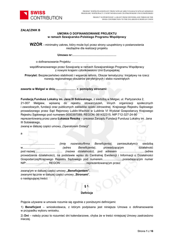 PROJEKT WSPÓŁFINANSOWANY PRZEZ SZWAJCARIĘ W RAMACH SZWAJCARSKIEGO PROGRAMU WSPÓŁPRACY Z NOWYMI KRAJAMI CZŁONKOWSKIMI UNII EUROPEJSKIEJ PROJECT SUPPORTED BY A GRANT FROM SWITZERLAND THROUGH THE SWISS CONTRIBUTION TO THE ENLARGED EUROPEAN UNION ZAŁĄCZNIK B UMOWA O DOFINANSOWANIE PROJEKTU w ramach Szwajcarsko-Polskiego Programu Współpracy WZÓR - minimalny zakres, który może być przez strony uzupełniony o postanowienia niezbędne dla realizacji projektu Umowa nr:……………………………………… o dofinansowanie Projektu: ………………………………………………………….. współfinansowanego przez Szwajcarię w ramach Szwajcarskiego Programu Współpracy z nowymi krajami członkowskimi Unii Europejskiej Priorytet: Bezpieczeństwo stabilność i wsparcie reform, Obszar tematyczny: Inicjatywy na rzecz rozwoju regionalnego obszarów peryferyjnych i słabo rozwiniętych zawarta w Mełgwi w dniu ......................... r. pomiędzy stronami: Fundacją Fundusz Lokalny im. Jana III Sobieskiego, z siedzibą w Mełgwi, ul. Partyzancka 2, 21-007 Mełgiew, wpisaną do rejestru stowarzyszeń, innych organizacji społecznych i zawodowych, fundacji oraz publicznych zakładów opieki zdrowotnej Krajowego Rejestru Sądowego prowadzonego przez Sąd Rejonowy Lublin-Wschód w Lublinie VI Wydział Gospodarczy Krajowego Rejestru Sądowego pod numerem 0000397089; REGON: 061432315, NIP:712-327-24-90 reprezentowaną przez pana Łukasza Reszkę – prezesa Zarządu Fundacji Fundusz Lokalny im. Jana III Sobieskiego, zwaną w dalszej części umowy „Operatorem Dotacji” a .......................................... (imię nazwisko/firma Beneficjenta), zamieszkałym/z siedzibą w........................................ (adres Beneficjenta), prowadzącą/ym działalność pod nazwą.................................. (nazwa działalności), pod adresem ...............................(adres prowadzenia działalności), na podstawie wpisu do Centralnej Ewidencji i Informacji o Działalności Gospodarczej/Krajowego Rejestru Sądowego pod numerem........................,posiadającą/ym numer NIP:.........................., REGON:................................reprezentowaną/ym przez: .................................................................................... zwaną/ym w dalszej części umowy „Beneficjentem”, zwanymi łącznie w dalszej części umowy „Stronami”, o następującej treści: § 1. Definicje Pojęcia używane w umowie rozumie się zgodnie z poniższymi definicjami: 1) Beneficjent – wnioskodawca, z którym podpisana jest niniejsza Umowa o dofinansowanie w przypadku wyboru wniosku. 2) Dni – należy przez to rozumieć dni kalendarzowe, chyba że w treści niniejszej Umowy zastrzeżono inaczej. Strona 1 z 16 PROJEKT WSPÓŁFINANSOWANY PRZEZ SZWAJCARIĘ W RAMACH SZWAJCARSKIEGO PROGRAMU WSPÓŁPRACY Z NOWYMI KRAJAMI CZŁONKOWSKIMI UNII EUROPEJSKIEJ PROJECT SUPPORTED BY A GRANT FROM SWITZERLAND THROUGH THE SWISS CONTRIBUTION TO THE ENLARGED EUROPEAN UNION 3) Dokumenty elektroniczne – wszelkie dokumenty zapisane w wersji elektronicznej, posiadane przez Beneficjenta, związane z realizacją Projektu i mogące świadczyć o jego prawidłowej realizacji. 4) Dotacja (dofinansowanie) – wsparcie udzielone Beneficjentowi na podstawie niniejszej Umowy, na realizację Projektu, współfinansowanego przez Szwajcarię w ramach Szwajcarskiego Programu Współpracy z nowymi krajami członkowskimi Unii Europejskiej. 5) Kategorie wydatków kwalifikowalnych – pozycje kosztów wyszczególnione w budżecie i harmonogramie realizacji Projektu stanowiącym załącznik do niniejszej Umowy. 6) Operator Dotacji (OD) – Fundacja Fundusz Lokalnym im. Jana III Sobieskiego, uczestnicząca w realizacji projektu „Marka lokalna szansą rozwoju przedsiębiorczości na Szlacheckim Szlaku w województwie lubelskim” współfinansowanego przez Szwajcarię w ramach Szwajcarskiego Programu Współpracy z nowymi krajami członkowskimi Unii Europejskiej. 7) Poprawny wniosek o płatność – wniosek spełniający wymogi formalne, to jest złożony na obowiązującym formularzu, zawierający wszystkie wymagane załączniki, uzupełniony zgodnie z pismem/emailem przekazanym przez pracowników Fundacji Funduszu Lokalnego im. Jana III Sobieskiego. W przypadku, gdy Projekt podlega kontroli za poprawny wniosek o płatność uznaje się wniosek, do którego Beneficjent dostarczył oprócz wyżej wymienionych załączników i uzupełnień podpisaną informację pokontrolną. W przypadku podpisywania aneksu za poprawny wniosek o płatność uznaje się wniosek, do którego Beneficjent dostarczył oprócz wyżej wymienionych załączników i uzupełnień podpisany aneks. 8) Produkt – bezpośredni, materialny efekt realizacji Projektu mierzony konkretnymi wielkościami. 9) Program - Szwajcarsko - Polski Program Współpracy (SPPW) – Szwajcarsko - Polski Program Współpracy, współfinansowany przez Szwajcarię, który ma przyczynić się do zmniejszenia różnic gospodarczych i społecznych, pomiędzy Polską a bardziej rozwiniętymi państwami rozszerzonej Unii Europejskiej, oraz przyczynić się w Polsce do zmniejszenia różnic gospodarczych i społecznych pomiędzy dynamicznymi ośrodkami miejskimi i słabymi strukturalnie regionami peryferyjnymi, określonymi jako obszar koncentracji geograficznej (województwo lubelskie, województwo podkarpackie, województwo świętokrzyskie i województwo małopolskie). 10) Projekt – przedsięwzięcie będące przedmiotem Umowy, opisane we wniosku i biznesplanie lub planie projektu, współfinansowane przez Szwajcarię w ramach Szwajcarskiego Programu Współpracy z nowymi krajami członkowskimi Unii Europejskiej. 11) Rachunek bankowy – odrębny rachunek bankowy Beneficjenta wyłącznie do obsługi płatności projektowych na podstawie Umowy. 12) Rezultat – wpływ zrealizowanego Projektu uzyskany w trakcie lub po zakończeniu realiz