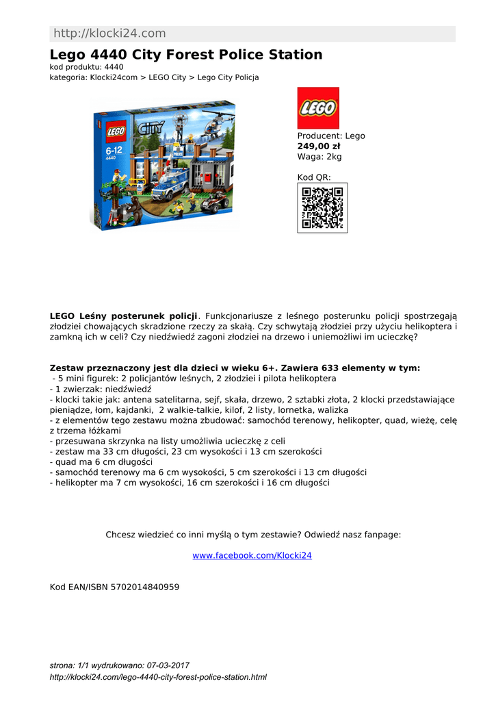 http://klocki24.com Lego 4440 City Forest Police Station kod produktu: 4440 kategoria: Klocki24com > LEGO City > Lego City Policja Producent: Lego 249,00 zł Waga: 2kg Kod QR: LEGO Leśny posterunek policji. Funkcjonariusze z leśnego posterunku policji spostrzegają złodziei chowających skradzione rzeczy za skałą. Czy schwytają złodziei przy użyciu helikoptera i zamkną ich w celi? Czy niedźwiedź zagoni złodziei na drzewo i uniemożliwi im ucieczkę? Zestaw przeznaczony jest dla dzieci w wieku 6+. Zawiera 633 elementy w tym: - 5 mini figurek: 2 policjantów leśnych, 2 złodziei i pilota helikoptera - 1 zwierzak: niedźwiedź - klocki takie jak: antena satelitarna, sejf, skała, drzewo, 2 sztabki złota, 2 klocki przedstawiające pieniądze, łom, kajdanki, 2 walkie-talkie, kilof, 2 listy, lornetka, walizka - z elementów tego zestawu można zbudować: samochód terenowy, helikopter, quad, wieżę, celę z trzema łóżkami - przesuwana skrzynka na listy umożliwia ucieczkę z celi - zestaw ma 33 cm długości, 23 cm wysokości i 13 cm szerokości - quad ma 6 cm długości - samochód terenowy ma 6 cm wysokości, 5 cm szerokości i 13 cm długości - helikopter ma 7 cm wysokości, 16 cm szerokości i 16 cm długości Chcesz wiedzieć co inni myślą o tym zestawie? Odwiedź nasz fanpage: www.facebook.com/Klocki24 Kod EAN/ISBN 5702014840959 strona: 1/1 wydrukowano: 07-03-2017 http://klocki24.com/lego-4440-city-forest-police-station.html