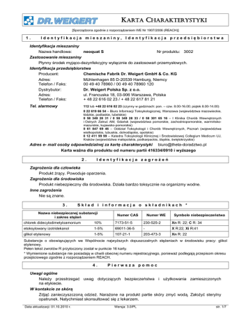 KARTA CHARAKTERYSTYKI [Sporządzona zgodnie z rozporządzeniem WE Nr 1907/2006 (REACH)] 1. Identyfikacja mieszaniny, Identyfikacja przedsiębiorstwa Identyfikacja mieszaniny Nazwa handlowa: neoquat S Nr produktu: 3002 Zastosowanie mieszaniny Płynny środek myjąco-dezynfekcyjny wyłącznie do zastosowań przemysłowych. Identyfikacja przedsiębiorstwa Producent: Chemische Fabrik Dr. Weigert GmbH & Co. KG Adres: Mühlenhagen 85 D-20539 Hamburg, Niemcy Telefon / Faks: 00 49 40 78960 / 00 49 40 78960 120 Dystrybutor: Dr. Weigert Polska Sp. z o.o. Adres: ul. Francuska 18, 03-906 Warszawa, Polska Telefon / Faks: + 48 22 616 02 23 / + 48 22 617 81 21 Tel. alarmowy 112 lub +48 22 616 02 23 (czynny w godzinach: pon. – czw. 8.00-16.00; piątek 8.00-14.00) 0 22 619 66 54 – Biuro Informacji Toksykologicznej, Warszawa (województwa mazowieckie, łódzkie, podlaskie, lubelskie) 0 58 349 28 31 / 0 58 349 28 33 / 0 58 301 65 16 – I Klinika Chorób Wewnętrznych i Ostrych Zatruć AM, Gdańsk (województwa pomorskie, zachodniopomorskie, warmińskomazurskie, kujawsko-pomorskie) 0 61 847 69 46 – Oddział Toksykologii i Chorób Wewnętrznych, Poznań (województwa wielkopolskie, lubuskie, dolnośląskie, opolskie) 0 12 411 99 99 – Katedra Toksykologii Klinicznej i Środowiskowej Collegium Medicum UJ, Kraków (województwa małopolskie, podkarpackie, śląskie, świętokrzyskie) Adres e- mail osoby odpowiedzialnej za kartę charakterystyki [email protected] Karta ważna dla produktu od numeru partii 416334/0910 i wyższego 2. Identyfikacja zagrożeń Zagrożenia dla człowieka Produkt żrący. Powoduje oparzenia. Zagrożenia dla środowiska Produkt niebezpieczny dla środowiska. Działa bardzo toksycznie na organizmy wodne. Inne zagrożenia Nie są znane. 3. Skład i informacja o składnikach * Nazwa niebezpiecznej substancji i zakres stężeń Numer CAS Numer WE Symbole niebezpieczeństwa chlorek didecylodimetyloamonium 10% 7173-51-5 230-525-2 Xn R: 22; C R: 34 etoksylowany izotridekanol 1-5% 69011-36-5 - X R:22, Xi R:41 glikol etylenowy 1-5% 107-21-1 203-473-3 Xn R: 22 Substancje o obowiązujących we Wspólnocie najwyższych dopuszczalnych stężeniach w środowisku pracy: glikol etylenowy. Pełen tekst zwrotów R przytoczony został w punkcie 16 karty. * Wymienione substancje nie posiadają w chwili obecnej numeru rejestracyjnego, ponieważ podlegają przepisom okresu przejściowego zgodnie z rozporządzeniem REACH. 4. Pierwsza pomoc Uwagi ogólne Należy przestrzegać uwag dotyczących bezpieczeństwa i użytkowania zamieszczonych na etykiecie. W kontakcie ze skórą Zdjąć zanieczyszczoną odzież. Narażone na produkt partie skóry zmyć wodą. Założyć sterylny opatrunek. Natychmiast skonsultować się z lekarzem. Data aktualizacji: 01.10.2010 r. Wersja: 3.0/PL str. 1/7 KARTA CHARAKTERYSTYKI Nazwa handlowa: Producent: Adres: Telefon/Faks: neoquat S DR. WEIGERT GMBH & CO. KG Mühlenhagen 85, D-20539 Hamburg, Niemcy 0049 40 78960 0 / 0049 40 78960 120 Dystrybutor: Adres: Telefon/Faks: Nr katalogowy: 3002 DR. WEIGERT POLSKA Sp. z o.o. ul. Francuska 18, 03-906 Warszawa, Polska 022 616 02 23 / 022 617 81 21 W kontakcie z oczami Zanieczyszczone oczy przepłukiwać wodą przez ok. 5 min. Chronić niepodrażnione oko, zdjąć szkła kontaktowe. Założyć sterylny opatrunek. Natychmiast wezwać lekarza okulistę. W przypadku spożycia Wypłukać usta wodą a następnie popić dużą ilością wody. Wezwać lekarza, pokazać opakowanie lub etykietę. Nie wywoływać wymiotów! Po narażeniu drogą oddechową W przypadku narażenia przenieść poszkodowanego na świeże powietrze. Zapewnić ciepło i spokój. W razie wystąpienia niepokojących dolegliwości skonsultować się z lekarzem. 5. Postępowanie w przypadku pożaru Odpowiednie środki gaśnicze Piana gaśnicza, rozpylony strumień wody. Nieodpowiednie środki gaśnicze Zwarty strumień wody – ryzyko rozprzestrzenienia pożaru. Szczególne wyposażenie podczas walki z ogniem Środki ochrony ogólnej typowe w przypadku pożaru. Nie należy przebywać w zagrożonej ogniem strefie bez odpowiedniego ubrania odpornego na chemikalia i aparatu do oddychania z niezależnym obiegiem powietrza. Uwagi dodatkowe Produkt sam nie jest palny. Zagrożone ogniem pojemniki polewać z bezpiecznej odległości rozpylonym strumieniem wody. P o stę pow a n ie w prz yp a d ku n iez a m ierz on eg o uw oln i en i a do ś ro dow iska 6. Indywidualne środki ostrożności Unikać kontaktu ze skórą i oczami. Zadbać o właściwą wentylację. Stosować środki ochrony indywidualnej zgodne z punktem 8 karty. Niezbędne środki w zakresie ochrony środowiska Nie wprowadzać do kanalizacji, wód powierzchniowych i gruntowych. W przypadku zanieczyszczenia gleby, rzek, jezior albo ujęć wody należy niezwłocznie powiadomić odpowiednie służby. W przypadku uwolnienia większych ilości produktu należy poczynić odpowiednie kroki w celu niedopuszczenia do rozprzestrzenienia się w środowisku naturalnym. Metody oczyszczania/wchłaniania Zebrać materiałami wchłaniającymi ciecze (np. piasek, ziemia, uniwersalne substancje wiążące, krzemionka, trociny itp.). Zebrany materiał potraktować jak odpady i dalej postępować wg pkt 13. Oczyścić skażone miejsce, pozostałość zmyć dużą ilością wody. 7. Postępowanie z mieszaniną i jej magazynowanie Postępowanie z mieszaniną Przestrzegać przepisów prawnych w zakresie higieny i bezpieczeństwa. Unikać kontaktu ze skórą i oczami. Zadbać o właściwą wentylację. Magazynowanie Przechowywać tylko w oryginalnych, szczelnie zamkniętych opakowaniach. Przechowywać w chłodnych pomieszczeniach, dobrze wentylowanych. Chronić przed bezpośrednim nasłonecznieniem. Nie przechowywać razem z artykułami żywnościowymi. Specyficzne zastosowania Produkt do zastosowania we wszystkich metodach ręcznej, natryskowej i zanurzeniowej dezynfekcji w całym przemyśle spożywczym; szczególnie w kuchniach oraz in