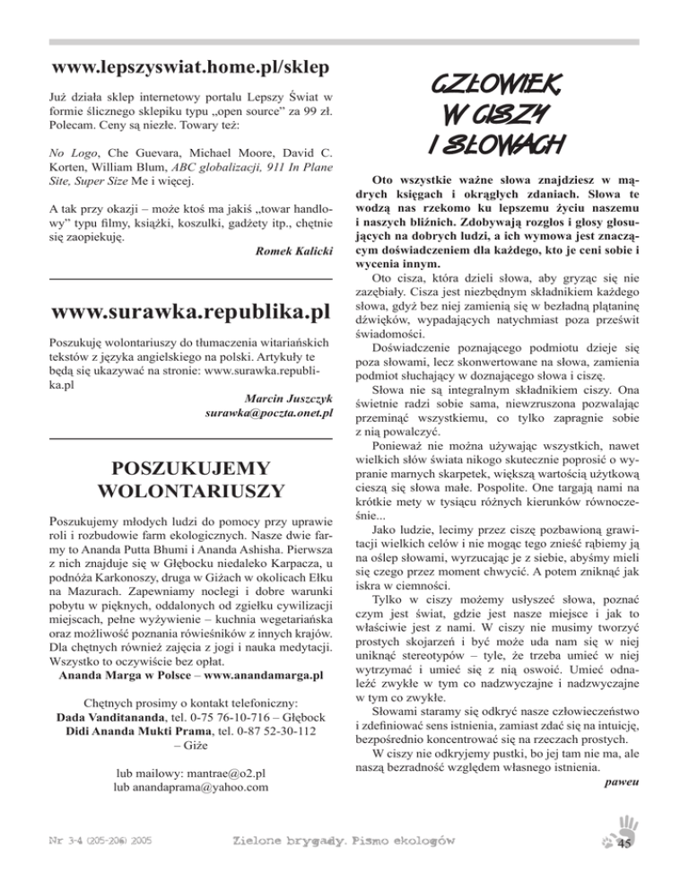 www.lepszyswiat.home.pl/sklep Już działa sklep internetowy portalu Lepszy Świat w formie ślicznego sklepiku typu „open source” za 99 zł. Polecam. Ceny są niezłe. Towary też: No Logo, Che Guevara, Michael Moore, David C. Korten, William Blum, ABC globalizacji, 911 In Plane Site, Super Size Me i więcej. A tak przy okazji – może ktoś ma jakiś „towar handlowy” typu filmy, książki, koszulki, gadżety itp., chętnie się zaopiekuję. Romek Kalicki www.surawka.republika.pl Poszukuję wolontariuszy do tłumaczenia witariańskich tekstów z języka angielskiego na polski. Artykuły te będą się ukazywać na stronie: www.surawka.republika.pl Marcin Juszczyk [email protected] POSZUKUJEMY WOLONTARIUSZY Poszukujemy młodych ludzi do pomocy przy uprawie roli i rozbudowie farm ekologicznych. Nasze dwie farmy to Ananda Putta Bhumi i Ananda Ashisha. Pierwsza z nich znajduje się w Głębocku niedaleko Karpacza, u podnóża Karkonoszy, druga w Giżach w okolicach Ełku na Mazurach. Zapewniamy noclegi i dobre warunki pobytu w pięknych, oddalonych od zgiełku cywilizacji miejscach, pełne wyżywienie – kuchnia wegetariańska oraz możliwość poznania rówieśników z innych krajów. Dla chętnych również zajęcia z jogi i nauka medytacji. Wszystko to oczywiście bez opłat. Ananda Marga w Polsce – www.anandamarga.pl Chętnych prosimy o kontakt telefoniczny: Dada Vanditananda, tel. 0-75 76-10-716 – Głębock Didi Ananda Mukti Prama, tel. 0-87 52-30-112 – Giże lub mailowy: [email protected] lub [email protected] Oto wszystkie ważne słowa znajdziesz w mądrych księgach i okrągłych zdaniach. Słowa te wodzą nas rzekomo ku lepszemu życiu naszemu i naszych bliźnich. Zdobywają rozgłos i głosy głosujących na dobrych ludzi, a ich wymowa jest znaczącym doświadczeniem dla każdego, kto je ceni sobie i wycenia innym. Oto cisza, która dzieli słowa, aby gryząc się nie zazębiały. Cisza jest niezbędnym składnikiem każdego słowa, gdyż bez niej zamienią się w bezładną plątaninę dźwięków, wypadających natychmiast poza prześwit świadomości. Doświadczenie poznającego podmiotu dzieje się poza słowami, lecz skonwertowane na słowa, zamienia podmiot słuchający w doznającego słowa i ciszę. Słowa nie są integralnym składnikiem ciszy. Ona świetnie radzi sobie sama, niewzruszona pozwalając przeminąć wszystkiemu, co tylko zapragnie sobie z nią powalczyć. Ponieważ nie można używając wszystkich, nawet wielkich słów świata nikogo skutecznie poprosić o wypranie marnych skarpetek, większą wartością użytkową cieszą się słowa małe. Pospolite. One targają nami na krótkie mety w tysiącu różnych kierunków równocześnie... Jako ludzie, lecimy przez ciszę pozbawioną grawitacji wielkich celów i nie mogąc tego znieść rąbiemy ją na oślep słowami, wyrzucając je z siebie, abyśmy mieli się czego przez moment chwycić. A potem zniknąć jak iskra w ciemności. Tylko w ciszy możemy usłyszeć słowa, poznać czym jest świat, gdzie jest nasze miejsce i jak to właściwie jest z nami. W ciszy nie musimy tworzyć prostych skojarzeń i być może uda nam się w niej uniknąć stereotypów – tyle, że trzeba umieć w niej wytrzymać i umieć się z nią oswoić. Umieć odnaleźć zwykłe w tym co nadzwyczajne i nadzwyczajne w tym co zwykłe. Słowami staramy się odkryć nasze człowieczeństwo i zdefiniować sens istnienia, zamiast zdać się na intuicję, bezpośrednio koncentrować się na rzeczach prostych. W ciszy nie odkryjemy pustki, bo jej tam nie ma, ale naszą bezradność względem własnego istnienia. paweu 45