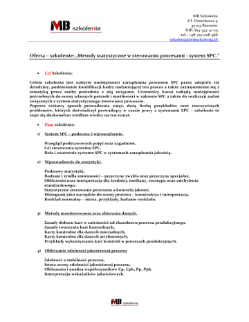 MB Szkolenia Ul. Orzechowa 4 35-113 Rzeszów NIP: 813-322-21-75 tel.: +48 722 008 566 [email protected] Oferta – szkolenie: „Metody statystyczne w sterowaniu procesami - system SPC.” Cel Szkolenia: Celem szkolenia jest nabycie umiejętności zarządzania procesem SPC przez adeptów tej dziedziny, podniesienie kwalifikacji kadry nadzorującej ten proces a także zaznajomienie się z tematyką przez osoby pośrednio z nią związane. Uczestnicy kursu nabędą umiejętności potrzebnych do oceny własnych potrzeb i możliwości w zakresie SPC a także do realizacji zadań związanych z system statystycznego sterowania procesem. Poprzez ciekawy sposób prowadzenia zajęć, dużą liczbę przykładów oraz rzeczywistych problemów, których doświadczył prowadzący w czasie pracy z systemami SPC – szkolenie to staje się doskonałym źródłem wiedzy na ten temat. Plan szkolenia: 1) System SPC – podstawy i wprowadzenie. Przegląd podstawowych pojęć oraz zagadnień, Cel stosowania systemu SPC, Rola i znaczenie systemu SPC w systemach zarządzania jakością. 2) Wprowadzenie do statystyki. Podstawy statystyki, Rodzaje i źródła zmienności – przyczyny zwykła oraz przyczyny specjalne, Obliczenia oraz interpretacja dla średniej, mediany, rozstępu oraz odchylenia standardowego, Statystyczne sterowanie procesem a kontrola jakości, Histogram jako narzędzie do oceny procesu – konstrukcja i interpretacja, Rozkład normalny – istota, przykłady, badanie rozkładu. 3) Metody monitorowania oraz zbierania danych. Zasady doboru kart w zależności od charakteru procesu produkcyjnego, Zasady tworzenia kart kontrolnych, Karty kontrolne dla danych mierzalnych, Karty kontrolne dla danych atrybutowych, Przykłady wykorzystania kart kontroli w procesach produkcyjnych. 4) Obliczanie zdolności jakościowej procesu Zdolność a stabilność procesu, Istota oceny zdolności jakościowej procesu, Obliczenia i analiza współczynników Cp, Cpk, Pp, Ppk. Interpretacja wskaźników jakościowych. MB Szkolenia Ul. Orzechowa 4 35-113 Rzeszów NIP: 813-322-21-75 tel.: +48 722 008 566 [email protected] Cena za udział w szkoleniu wynosi 1300 PLN netto (1599 PLN brutto). Podana cena zawiera: zakwaterowanie (2 noce), pełne wyżywienie, usługę szkoleniową, materiały szkoleniowe, przerwy kawowe. Dla Państwa przygotowane zostały materiały szkoleniowe. Materiały zredagowane są w taki sposób, aby po zakończeniu kursu można było w nie łatwo „zaglądnąć” i odszukać potrzebne informacje. Prowadzący: Mgr inż. MBA, certyfikowany audytor systemów PN-EN ISO 9001:2001, posiadający również certyfikat asystenta zarządzania środowiskowego wg normy ISO14001. Praktyk, trener z zakresu stosowania i wdrażania SPC. Od kilku lat związany z działem konstrukcyjnym, gdzie aktywnie wspiera dostawców krajowych jak i zagranicznych w kierunku systemów SPC i MSA. Szkolenie skierowane jest do personelu związanego z zarządzaniem i zapewnieniem jakości (kontrolerzy, inżynierowie zapewnienia jakości, inżynierowie jakości dostawców), ale także dla szeroko pojętej kadry inżynierskiej (konstruktorzy, technolodzy, analitycy produkcji) oraz kadry zarządzającej. Na szkolenie zapraszamy Państwa do czterogwiazdkowego pensjonatu Gaborek mieszczącego się w Krynicy – Zdroju, przy ulicy Szkolnej 7.