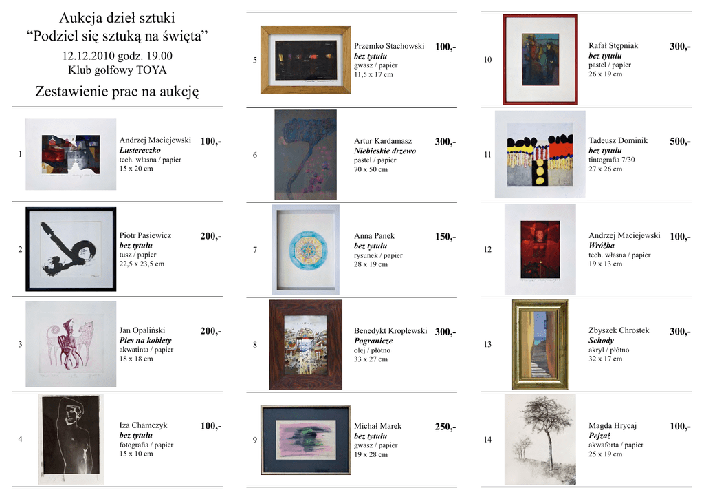 Aukcja dzieł sztuki “Podziel się sztuką na święta” 12.12.2010 godz. 19.00 Klub golfowy TOYA 100,- 5 Przemko Stachowski bez tytułu 300,- 6 Artur Kardamasz Niebieskie drzewo 150,- 7 Anna Panek bez tytułu 300,- 8 Benedykt Kroplewski Pogranicze 250,- 9 Michał Marek bez tytułu gwasz / papier 11,5 x 17 cm 300,- 10 Rafał Stępniak bez tytułu 500,- 11 Tadeusz Dominik bez tytułu 100,- 12 Andrzej Maciejewski Wróżba 300,- 13 Zbyszek Chrostek Schody 100,- 14 Magda Hrycaj Pejzaż pastel / papier 26 x 19 cm Zestawienie prac na aukcję 100,- 1 Andrzej Maciejewski Lustereczko 200,- 2 Piotr Pasiewicz bez tytułu 200,- 3 Jan Opaliński Pies na kobiety 100,- 4 Iza Chamczyk bez tytułu tech. własna / papier 15 x 20 cm tusz / papier 22,5 x 23,5 cm akwatinta / papier 18 x 18 cm fotografia / papier 15 x 10 cm pastel / papier 70 x 50 cm rysunek / papier 28 x 19 cm olej / płótno 33 x 27 cm gwasz / papier 19 x 28 cm tintografia 7/30 27 x 26 cm tech. własna / papier 19 x 13 cm akryl / płótno 32 x 17 cm akwaforta / papier 25 x 19 cm 100,- 15 Iza Chamczyk bez tytułu 500,- 16 Dorian Denes bez tytułu 250,- 17 Ireneusz Walczak Sen 150,- 18 Anna Panek bez tytułu fotografia / papier 15 x 10 cm olej / płótno 65 x 60 cm akwaforta / papier 21,5 x 27 cm rysunek / papier 28 x 19 cm 100,- 20 Przemko Stachowski bez tytułu 500,- 21 Kiejstut Bereźnicki bez tytułu 300,- 22 Rafał Stępniak bez tytułu 250,- 23 Michał Marek bez tytułu gwasz / papier 17 x 12 cm rysunek / papier 70 x 50 cm 200,- 25 Piotr Pasiewicz bez tytułu 500,- 26 Leszek Czajka bez tytułu tusz / papier 22,5 x 23,5 cm gwasz / papier 40 x 29 cm pastel / papier 26 x 19 cm gwasz / papier 23,5 x 31,5 cm wystawa od 30.11.2010 r. do 08.01.2011 r. 19 Jacek Sroka Torpedo 22/100 akwatinta / papier 43 x 10 cm 400,24 Jan Opaliński Bujany dziadek akwaforta / papier 26 x 21 cm 300,- Galeria Arttrakt Wrocław, ul. Ofiar Oświęcimskich 1/1