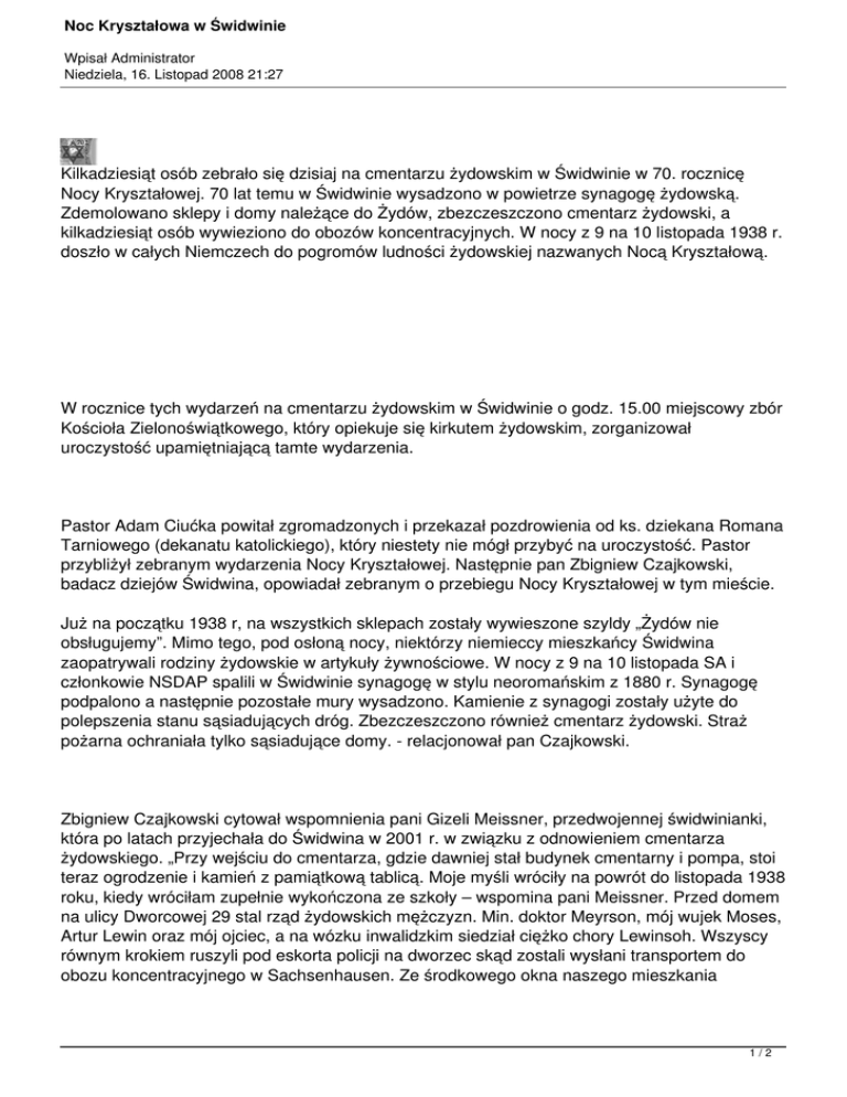 Noc Kryształowa w Świdwinie Wpisał Administrator Niedziela, 16. Listopad 2008 21:27 Kilkadziesiąt osób zebrało się dzisiaj na cmentarzu żydowskim w Świdwinie w 70. rocznicę Nocy Kryształowej. 70 lat temu w Świdwinie wysadzono w powietrze synagogę żydowską. Zdemolowano sklepy i domy należące do Żydów, zbezczeszczono cmentarz żydowski, a kilkadziesiąt osób wywieziono do obozów koncentracyjnych. W nocy z 9 na 10 listopada 1938 r. doszło w całych Niemczech do pogromów ludności żydowskiej nazwanych Nocą Kryształową. W rocznice tych wydarzeń na cmentarzu żydowskim w Świdwinie o godz. 15.00 miejscowy zbór Kościoła Zielonoświątkowego, który opiekuje się kirkutem żydowskim, zorganizował uroczystość upamiętniającą tamte wydarzenia. Pastor Adam Ciućka powitał zgromadzonych i przekazał pozdrowienia od ks. dziekana Romana Tarniowego (dekanatu katolickiego), który niestety nie mógł przybyć na uroczystość. Pastor przybliżył zebranym wydarzenia Nocy Kryształowej. Następnie pan Zbigniew Czajkowski, badacz dziejów Świdwina, opowiadał zebranym o przebiegu Nocy Kryształowej w tym mieście. Już na początku 1938 r, na wszystkich sklepach zostały wywieszone szyldy „Żydów nie obsługujemy”. Mimo tego, pod osłoną nocy, niektórzy niemieccy mieszkańcy Świdwina zaopatrywali rodziny żydowskie w artykuły żywnościowe. W nocy z 9 na 10 listopada SA i członkowie NSDAP spalili w Świdwinie synagogę w stylu neoromańskim z 1880 r. Synagogę podpalono a następnie pozostałe mury wysadzono. Kamienie z synagogi zostały użyte do polepszenia stanu sąsiadujących dróg. Zbezczeszczono również cmentarz żydowski. Straż pożarna ochraniała tylko sąsiadujące domy. - relacjonował pan Czajkowski. Zbigniew Czajkowski cytował wspomnienia pani Gizeli Meissner, przedwojennej świdwinianki, która po latach przyjechała do Świdwina w 2001 r. w związku z odnowieniem cmentarza żydowskiego. „Przy wejściu do cmentarza, gdzie dawniej stał budynek cmentarny i pompa, stoi teraz ogrodzenie i kamień z pamiątkową tablicą. Moje myśli wróciły na powrót do listopada 1938 roku, kiedy wróciłam zupełnie wykończona ze szkoły – wspomina pani Meissner. Przed domem na ulicy Dworcowej 29 stal rząd żydowskich mężczyzn. Min. doktor Meyrson, mój wujek Moses, Artur Lewin oraz mój ojciec, a na wózku inwalidzkim siedział ciężko chory Lewinsoh. Wszyscy równym krokiem ruszyli pod eskorta policji na dworzec skąd zostali wysłani transportem do obozu koncentracyjnego w Sachsenhausen. Ze środkowego okna naszego mieszkania 1/2 Noc Kryształowa w Świdwinie Wpisał Administrator Niedziela, 16. Listopad 2008 21:27 dobiegał głos policjanta ze Świdwina, który mówił – spokojnie koledzy, przypilnuje że zrobimy tu porządek ze wszystkimi Żydami. Po tych słowach przez okno wyleciała menora. Świecznik upadł na bruk i rozbiła się na wiele części. Następnego dnia wraz z matka pojechałyśmy na rowerach na cmentarz, na grób moich dziadków, gdzie długo płakałyśmy". Na świdwińskim cmentarzu zachowała się płyta nagrobna dziadków pani Gizeli. Przedwojenna świdwinianka nie kryła wzruszenia, kiedy ją zobaczyła. Niestety, dwa lata później, w 2003 r. została doszczętnie zniszczona przez nieznanych sprawców. Zastępca Burmistrza Świdwina, pan Krzysztof Wasicionek w swoim wystąpieniu mówił, że dzisiejsza uroczystość to manifestacja tolerancji. „Powinniśmy wziąć lekcje z historii i nigdy już nie dopuścić do przyzwolenia na rasizm czy dyskryminacje” - mówił burmistrz. Zebrani uczcili minutą ciszy pamięć ofiar Nocy Kryształowej, która zakończyła się czytaniem Psalmu, oraz modlitwą pastora Adama Ciućki, który dziękował „Bogu Abrahama, Izaaka, Jakuba, Bogu Jezusa Chrystusa, za żydowskich mieszkańców tej ziemi, którzy żyli tu przed nami.” Pastor modlił się, aby „nigdy już nie zawieść, tak jak zawiódł Kościół siedemdziesiąt lat temu. Chcemy zawsze stawać w obronie słabych i prześladowanych. Panie, zmaż przekleństwo przelanej krwi Twojego umiłowanego narodu na tej ziemi.” - zakończył pastor. Po uroczystości na cmentarzu w zborze zielonoświątkowym odbyła się projekcja filmu dokumentalnego o Holokauście. Po filmie, zebrani mieszkańcy Świdwina mogli porozmawiać przy kawie i herbacie. Fotogaleria z tego wydarzenia w dziale "Galeria" 2/2