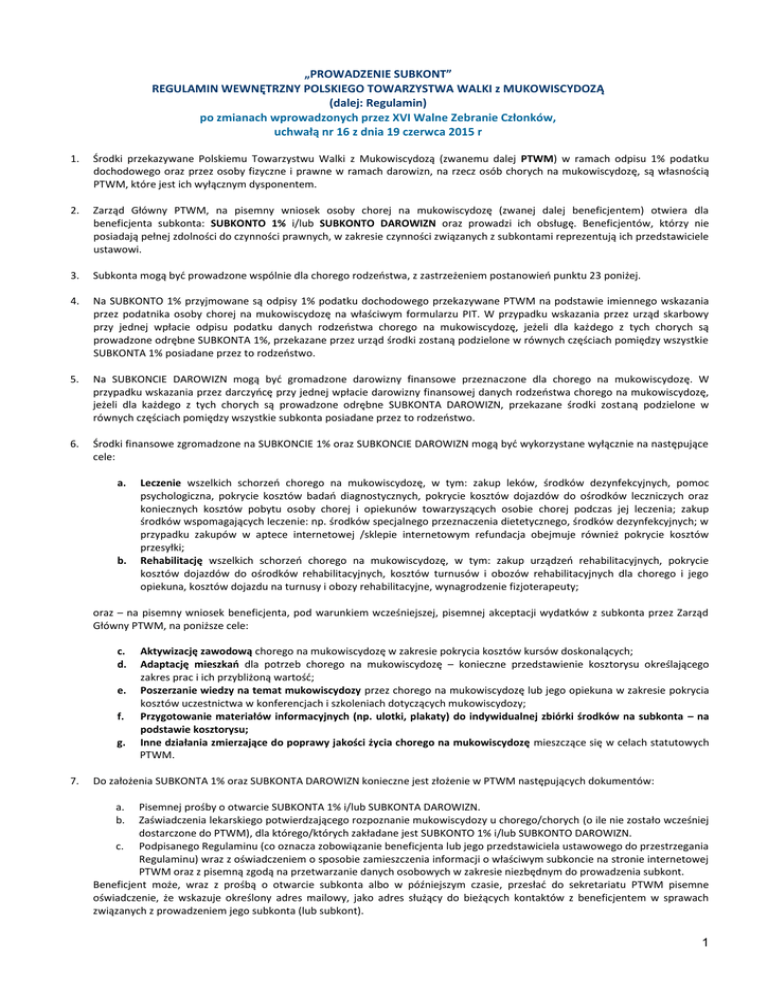„PROWADZENIE SUBKONT” REGULAMIN WEWNĘTRZNY POLSKIEGO TOWARZYSTWA WALKI z MUKOWISCYDOZĄ (dalej: Regulamin) po zmianach wprowadzonych przez XVI Walne Zebranie Członków, uchwałą nr 16 z dnia 19 czerwca 2015 r 1. Środki przekazywane Polskiemu Towarzystwu Walki z Mukowiscydozą (zwanemu dalej PTWM) w ramach odpisu 1% podatku dochodowego oraz przez osoby fizyczne i prawne w ramach darowizn, na rzecz osób chorych na mukowiscydozę, są własnością PTWM, które jest ich wyłącznym dysponentem. 2. Zarząd Główny PTWM, na pisemny wniosek osoby chorej na mukowiscydozę (zwanej dalej beneficjentem) otwiera dla beneficjenta subkonta: SUBKONTO 1% i/lub SUBKONTO DAROWIZN oraz prowadzi ich obsługę. Beneficjentów, którzy nie posiadają pełnej zdolności do czynności prawnych, w zakresie czynności związanych z subkontami reprezentują ich przedstawiciele ustawowi. 3. Subkonta mogą być prowadzone wspólnie dla chorego rodzeństwa, z zastrzeżeniem postanowień punktu 23 poniżej. 4. Na SUBKONTO 1% przyjmowane są odpisy 1% podatku dochodowego przekazywane PTWM na podstawie imiennego wskazania przez podatnika osoby chorej na mukowiscydozę na właściwym formularzu PIT. W przypadku wskazania przez urząd skarbowy przy jednej wpłacie odpisu podatku danych rodzeństwa chorego na mukowiscydozę, jeżeli dla każdego z tych chorych są prowadzone odrębne SUBKONTA 1%, przekazane przez urząd środki zostaną podzielone w równych częściach pomiędzy wszystkie SUBKONTA 1% posiadane przez to rodzeństwo. 5. Na SUBKONCIE DAROWIZN mogą być gromadzone darowizny finansowe przeznaczone dla chorego na mukowiscydozę. W przypadku wskazania przez darczyńcę przy jednej wpłacie darowizny finansowej danych rodzeństwa chorego na mukowiscydozę, jeżeli dla każdego z tych chorych są prowadzone odrębne SUBKONTA DAROWIZN, przekazane środki zostaną podzielone w równych częściach pomiędzy wszystkie subkonta posiadane przez to rodzeństwo. 6. Środki finansowe zgromadzone na SUBKONCIE 1% oraz SUBKONCIE DAROWIZN mogą być wykorzystane wyłącznie na następujące cele: a. b. Leczenie wszelkich schorzeń chorego na mukowiscydozę, w tym: zakup leków, środków dezynfekcyjnych, pomoc psychologiczna, pokrycie kosztów badań diagnostycznych, pokrycie kosztów dojazdów do ośrodków leczniczych oraz koniecznych kosztów pobytu osoby chorej i opiekunów towarzyszących osobie chorej podczas jej leczenia; zakup środków wspomagających leczenie: np. środków specjalnego przeznaczenia dietetycznego, środków dezynfekcyjnych; w przypadku zakupów w aptece internetowej /sklepie internetowym refundacja obejmuje również pokrycie kosztów przesyłki; Rehabilitację wszelkich schorzeń chorego na mukowiscydozę, w tym: zakup urządzeń rehabilitacyjnych, pokrycie kosztów dojazdów do ośrodków rehabilitacyjnych, kosztów turnusów i obozów rehabilitacyjnych dla chorego i jego opiekuna, kosztów dojazdu na turnusy i obozy rehabilitacyjne, wynagrodzenie fizjoterapeuty; oraz – na pisemny wniosek beneficjenta, pod warunkiem wcześniejszej, pisemnej akceptacji wydatków z subkonta przez Zarząd Główny PTWM, na poniższe cele: c. d. e. f. g. 7. Aktywizację zawodową chorego na mukowiscydozę w zakresie pokrycia kosztów kursów doskonalących; Adaptację mieszkań dla potrzeb chorego na mukowiscydozę – konieczne przedstawienie kosztorysu określającego zakres prac i ich przybliżoną wartość; Poszerzanie wiedzy na temat mukowiscydozy przez chorego na mukowiscydozę lub jego opiekuna w zakresie pokrycia kosztów uczestnictwa w konferencjach i szkoleniach dotyczących mukowiscydozy; Przygotowanie materiałów informacyjnych (np. ulotki, plakaty) do indywidualnej zbiórki środków na subkonta – na podstawie kosztorysu; Inne działania zmierzające do poprawy jakości życia chorego na mukowiscydozę mieszczące się w celach statutowych PTWM. Do założenia SUBKONTA 1% oraz SUBKONTA DAROWIZN konieczne jest złożenie w PTWM następujących dokumentów: a. b. Pisemnej prośby o otwarcie SUBKONTA 1% i/lub SUBKONTA DAROWIZN. Zaświadczenia lekarskiego potwierdzającego rozpoznanie mukowiscydozy u chorego/chorych (o ile nie zostało wcześniej dostarczone do PTWM), dla którego/których zakładane jest SUBKONTO 1% i/lub SUBKONTO DAROWIZN. c. Podpisanego Regulaminu (co oznacza zobowiązanie beneficjenta lub jego przedstawiciela ustawowego do przestrzegania Regulaminu) wraz z oświadczeniem o sposobie zamieszczenia informacji o właściwym subkoncie na stronie internetowej PTWM oraz z pisemną zgodą na przetwarzanie danych osobowych w zakresie niezbędnym do prowadzenia subkont. Beneficjent może, wraz z prośbą o otwarcie subkonta albo w późniejszym czasie, przesłać do sekretariatu PTWM pisemne oświadczenie, że wskazuje określony adres mailowy, jako adres służący do bieżących kontaktów z beneficjentem w sprawach związanych z prowadzeniem jego subkonta (lub subkont). 1 8. Zarząd Główny PTWM, po otrzymaniu celowych odpisów 1% podatku dochodowego przeznaczonych dla chorego na mukowiscydozę nieposiadającego dotychczas SUBKONTA 1%, zwróci się listem poleconym wysłanym za potwierdzeniem odbioru do potencjalnego beneficjenta z propozycją założenia subkonta 1%. W piśmie tym Zarząd Główny PTWM prześle Regulamin i poinformuje o konieczności przedstawienia dokumentów, o których mowa w punkcie 7, w terminie miesiąca od dnia otrzymania przez adresata pisma Zarządu Głównego PTWM. Jeżeli we wskazanym terminie potencjalny beneficjent nie dostarczy do PTWM dokumentów wskazanych w punkcie 7 albo odmówi założenia SUBKONTA 1%, odpisy celowe 1% podatku dochodowego, które mogłyby zostać zgromadzone na SUBKONCIE 1% otwartym na wniosek tego beneficjenta, zostaną przeznaczone na realizację celów statutowych PTWM. 9. W przypadku braku możliwości kontaktu z potencjalnym beneficjentem, o którym mowa w punkcie 8 zdanie 1, pomimo udokumentowanych starań podjętych 