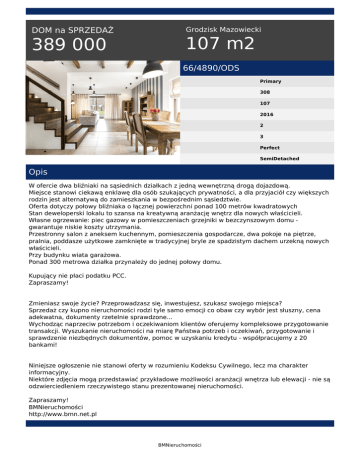 DOM na SPRZEDAŻ 389 000 Grodzisk Mazowiecki 107 m2 66/4890/ODS Primary 308 107 2016 2 3 Perfect SemiDetached Opis W ofercie dwa bliźniaki na sąsiednich działkach z jedną wewnętrzną drogą dojazdową. Miejsce stanowi ciekawą enklawę dla osób szukających prywatności, a dla przyjaciół czy większych rodzin jest alternatywą do zamieszkania w bezpośrednim sąsiedztwie. Oferta dotyczy połowy bliźniaka o łącznej powierzchni ponad 100 metrów kwadratowych Stan deweloperski lokalu to szansa na kreatywną aranżację wnętrz dla nowych właścicieli. Własne ogrzewanie: piec gazowy w pomieszczeniach grzejniki w bezczynszowym domu gwarantuje niskie koszty utrzymania. Przestronny salon z aneksem kuchennym, pomieszczenia gospodarcze, dwa pokoje na piętrze, pralnia, poddasze użytkowe zamknięte w tradycyjnej bryle ze spadzistym dachem urzekną nowych właścicieli. Przy budynku wiata garażowa. Ponad 300 metrowa działka przynależy do jednej połowy domu. Kupujący nie płaci podatku PCC. Zapraszamy! Zmieniasz swoje życie? Przeprowadzasz się, inwestujesz, szukasz swojego miejsca? Sprzedaż czy kupno nieruchomości rodzi tyle samo emocji co obaw czy wybór jest słuszny, cena adekwatna, dokumenty rzetelnie sprawdzone... Wychodząc naprzeciw potrzebom i oczekiwaniom klientów oferujemy kompleksowe przygotowanie transakcji. Wyszukanie nieruchomości na miarę Państwa potrzeb i oczekiwań, przygotowanie i sprawdzenie niezbędnych dokumentów, pomoc w uzyskaniu kredytu - współpracujemy z 20 bankami! Niniejsze ogłoszenie nie stanowi oferty w rozumieniu Kodeksu Cywilnego, lecz ma charakter informacyjny. Niektóre zdjęcia mogą przedstawiać przykładowe możliwości aranżacji wnętrza lub elewacji - nie są odzwierciedleniem rzeczywistego stanu prezentowanej nieruchomości. Zapraszamy! BMNieruchomości http://www.bmn.net.pl BMNieruchomości Jacek Milewski tel. 503065167 tel. 22 3337383 email: [email protected] BMNieruchomości Powered by TCPDF (www.tcpdf.org)