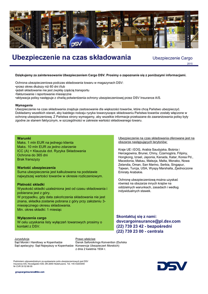 Ubezpieczenie na czas składowania Ubezpieczenie Cargo 2015 Dziękujemy za zainteresowanie Ubezpieczeniem Cargo DSV. Prosimy o zapoznanie się z poniższymi informacjami. Ochrona ubezpieczeniowa podczas składowania towaru w magazynach DSV: •przez okres dłuższy niż 60 dni i/lub •jeżeli składowanie nie jest zwykłą częścią transportu •fakturowanie i raportowanie miesięczne •aktywacja polisy następuje z chwilą potwierdzenia ochrony ubezpieczeniowej przez DSV Insurance A/S. Wymagania Ubezpieczenie na czas składowania znajduje zastosowanie dla większości towarów, które chcą Państwo ubezpieczyć. Dokładamy wszelkich starań, aby każdego rodzaju ryzyka towarzyszące składowaniu Państwa towarów zostały włączone w ochronę ubezpieczeniową. Z Państwa strony wymagamy, aby wszelkie informacje przekazane do zaaranżowania polisy były zgodne ze stanem faktycznym, w szczególności w zakresie wartości składowanego towaru. Warunki Maks. 1 mln EUR na jednego klienta Maks. 10 mln EUR za jedno zdarzenie ICC (A) + Klauzula dot. Ryzyka Składowania Ochrona do 365 dni Brak franszyzy Wartość ubezpieczenia Suma ubezpieczenia jest kalkulowana na podstawie najwyższej wartości towarów w okresie rozliczeniowym. Płatność składki Wysokość składki uzależniona jest od czasu składowania i pobierana jest z góry. W przypadku, gdy data zakończenia składowania nie jest znana, składka zostanie pobrana z góry przy założeniu 3miesięcznego okresu składowania. Min. okres składki: 1 miesiąc Wyłączenia cargo W celu uzyskania listy wyłączeń towarowych prosimy o kontakt z DSV. Ubezpieczenie na czas składowania oferowane jest na obszarze następujących terytoriów: Kraje UE i EOG, Arabia Saudyjska, Bośnia i Hercegowina, Brunei, Chiny, Czarnogóra, Filipiny, Hongkong, Izrael, Japonia, Kanada, Katar, Korea Pd., Macedonia, Makau, Malezja, Malta, Monako, Nowa Zelandia, Oman, San Marino, Serbia, Singapur, Tajwan, Turcja, USA, Wyspy Marshalla, Zjednoczone Emiraty Arabskie. Ochronę ubezpieczeniową można uzyskać również na obszarze innych krajów na oddzielnych warunkach, zasadach i według indywidualnych stawek. Skontaktuj się z nami: [email protected] (22) 739 23 42 - bezpośredni (22) 739 23 00 - centrala Jurysdykcja Prawo właściwe Sąd Morski i Handlowy w Kopenhadze Dansk Søforsikrings Konvention (Duńska Sąd apelacyjny: Sąd Najwyższy w Kopenhadze Konwencja Ubezpieczeń Morskich) z dnia 2 kwietnia 1934 r. Podmiotem odpowiedzialnym za wystawianie polis ubezpieczeniowych jest DSV Insurance A/S,policies Hovedgaden 630, DK-2640 +45 43203040 All insurance are ultimately issued byHedehusene. DSV InsuranceTel. A/S, NrHovedgaden CVR 30 52 630, 68 05DK-2640 Hedehusene. Tel. + 45 43203040 CVR no. 30 52 68 05. [email protected]