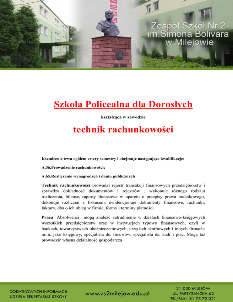 Szkoła Policealna dla Dorosłych kształcąca w zawodzie technik rachunkowości Kształcenie trwa ogółem cztery semestry i obejmuje następujące kwalifikacje: A.36.Prowadzenie rachunkowości; A.65.Rozliczanie wynagrodzeń i danin publicznych Technik rachunkowości prowadzi rejestr transakcji finansowych przedsiębiorstw i sprawdza dokładność dokumentów i rejestrów , wykonuje różnego rodzaju rozliczenia, bilanse, raporty finansowe w oparciu o przepisy prawa podatkowego, dokonuje rozliczeń z fiskusem, ewidencjonuje dokumenty finansowe, rachunki, faktury, dba o ich obieg w firmie, formy i terminy płatności. Praca: Absolwenci mogą znaleźć zatrudnienie w działach finansowo-księgowych wszystkich przedsiębiorstw oraz w instytucjach typowo finansowych, czyli w bankach, towarzystwach ubezpieczeniowych, urzędach skarbowych i innych firmach: m.in. jako księgowy, specjalista ds. finansów, specjalista ds. kadr i płac. Mogą też prowadzić własną działalność gospodarczą