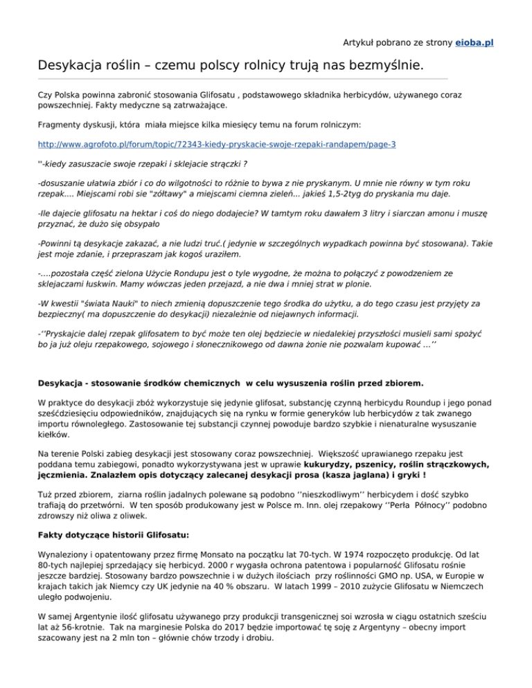 Artykuł pobrano ze strony eioba.pl Desykacja roślin – czemu polscy rolnicy trują nas bezmyślnie. Czy Polska powinna zabronić stosowania Glifosatu , podstawowego składnika herbicydów, używanego coraz powszechniej. Fakty medyczne są zatrważające. Fragmenty dyskusji, która miała miejsce kilka miesięcy temu na forum rolniczym: http://www.agrofoto.pl/forum/topic/72343-kiedy-pryskacie-swoje-rzepaki-randapem/page-3 ''-kiedy zasuszacie swoje rzepaki i sklejacie strączki ? -dosuszanie ułatwia zbiór i co do wilgotności to różnie to bywa z nie pryskanym. U mnie nie równy w tym roku rzepak.... Miejscami robi sie "zółtawy" a miejscami ciemna zieleń... jakieś 1,5-2tyg do pryskania mu daje. -Ile dajecie glifosatu na hektar i coś do niego dodajecie? W tamtym roku dawałem 3 litry i siarczan amonu i muszę przyznać, że dużo się obsypało -Powinni tą desykacje zakazać, a nie ludzi truć.( jedynie w szczególnych wypadkach powinna być stosowana). Takie jest moje zdanie, i przepraszam jak kogoś uraziłem. -….pozostała część zielona Użycie Rondupu jest o tyle wygodne, że można to połączyć z powodzeniem ze sklejaczami łuskwin. Mamy wówczas jeden przejazd, a nie dwa i mniej strat w plonie. -W kwestii "świata Nauki" to niech zmienią dopuszczenie tego środka do użytku, a do tego czasu jest przyjęty za bezpieczny( ma dopuszczenie do desykacji) niezależnie od niejawnych informacji. -‘’Pryskajcie dalej rzepak glifosatem to być może ten olej będziecie w niedalekiej przyszłości musieli sami spożyć bo ja już oleju rzepakowego, sojowego i słonecznikowego od dawna żonie nie pozwalam kupować …’’ Desykacja - stosowanie środków chemicznych w celu wysuszenia roślin przed zbiorem. W praktyce do desykacji zbóż wykorzystuje się jedynie glifosat, substancję czynną herbicydu Roundup i jego ponad sześćdziesięciu odpowiedników, znajdujących się na rynku w formie generyków lub herbicydów z tak zwanego importu równoległego. Zastosowanie tej substancji czynnej powoduje bardzo szybkie i nienaturalne wysuszanie kiełków. Na terenie Polski zabieg desykacji jest stosowany coraz powszechniej. Większość uprawianego rzepaku jest poddana temu zabiegowi, ponadto wykorzystywana jest w uprawie kukurydzy, pszenicy, roślin strączkowych, jęczmienia. Znalazłem opis dotyczący zalecanej desykacji prosa (kasza jaglana) i gryki ! Tuż przed zbiorem, ziarna roślin jadalnych polewane są podobno ‘’nieszkodliwym’’ herbicydem i dość szybko trafiają do przetwórni. W ten sposób produkowany jest w Polsce m. Inn. olej rzepakowy ‘’Perła Północy’’ podobno zdrowszy niż oliwa z oliwek. Fakty dotyczące historii Glifosatu: Wynaleziony i opatentowany przez firmę Monsato na początku lat 70-tych. W 1974 rozpoczęto produkcję. Od lat 80-tych najlepiej sprzedający się herbicyd. 2000 r wygasła ochrona patentowa i popularność Glifosatu rośnie jeszcze bardziej. Stosowany bardzo powszechnie i w dużych ilościach przy roślinności GMO np. USA, w Europie w krajach takich jak Niemcy czy UK jedynie na 40 % obszaru. W latach 1999 – 2010 zużycie Glifosatu w Niemczech uległo podwojeniu. W samej Argentynie ilość glifosatu używanego przy produkcji transgenicznej soi wzrosła w ciągu ostatnich sześciu lat aż 56-krotnie. Tak na marginesie Polska do 2017 będzie importować tę soję z Argentyny – obecny import szacowany jest na 2 mln ton – głównie chów trzody i drobiu. Pozostałość Glifosatu w tej soi można szacować na 6 -17 mg/kg. Unia Europejska po dopuszczeniu do stosowania kukurydzy GMO – MON 810 podniosła dopuszczalny poziom pozostałości Glifosatu w roślinach z 0,1 mg/kg do 20 mg/kg (200 razy) Fakty medyczne – polecam zapoznanie się z publikacjami Stephanii Seneff: http://people.csail.mit.edu/seneff/ - Glifosat został wykryty w mleku matek w USA – 3 próby na 10 zawierały ponad 75 ug/l (99, 76, 166 ug/l), przekroczona europejska norma na wodę 100 ug/l - norma amerykańska 700 ug/l -Glifosat wykryto w moczu mieszkańców Uni Europejskiej – Polacy są tu w ścisłej czołówce - w 70 % próbek naszych rodaków udaje się wykryć . -W moczu w USA zawartość Glifosatu waha się od 18,8 do 8 ug/l i jest 10 razy wyższa niż w Europie. Sekret ludzkiego zdrowia tkwi w trawieniu przyjmowanej żywności – stanie jelit. Co się dzieje gdy aktywny składnik - Glifosat, którego zadaniem jest sianie spustoszenia wśród żywych roślin dostaje się do naszych jelit, zasiedlonych miliardami pożytecznych bakterii ? Zaburza się dosłownie wszystko. Przyładowy opis (wg Anthony Samsel - emerytowanego współpracownika rządu US ds. środowiska) ''Każdy kto je zachodni typ żywności, pryskanej i suszonej przez herbicyd Monsanto – Roundup, może się spodziewać znalezienia aktywnego składnika tego herbicydu – Glifosatu w swoim ciele. Glifosat chelatuje różne składniki chemiczne istotne dla naszego istnienia, zaburza syntezę witamin i enzymy detoksykacyjne takie jak Glutation i CYP 450, jak również wiele istotnych amino kwasów. Glifosat jest antybiotykiem zdolnym zabijać setki rodzajów bakterii odpowiedzialnych za funkcjonowanie naszego systemu immunologicznego i całego zdrowia. To jest chroniczna toksyna, broń chemiczna jak żadna inna, zdolna zabijać organizm w sposób zarówno bezpośredni jak i pośredni. Herbicydy oparte na Roundupie firmy Monsanto mogą być najbardziej niszczącymi związkami dla naszej biologii i naszego środowiska. Próbki mleka zawierające od 76 do 166 ug/l Glifosatu stanowią zagrożenie dla zdrowia niemowląt. Myśl, że niemowlęta otrzymują dawki glifosatu przez mleko matek jest przerażająca i pokazuje , że praktycznie nie ma ucieczki od tego antybiotyku chemicznego.'' Glifosat zaburza syntezę siarki i jej transport, przez co pogarsza przyswajanie Tryptofanu w jelitach, aminokwasu odpowiedzialnego za produkcję serotoniny. Serotonina jest odpowiedzialna za regul