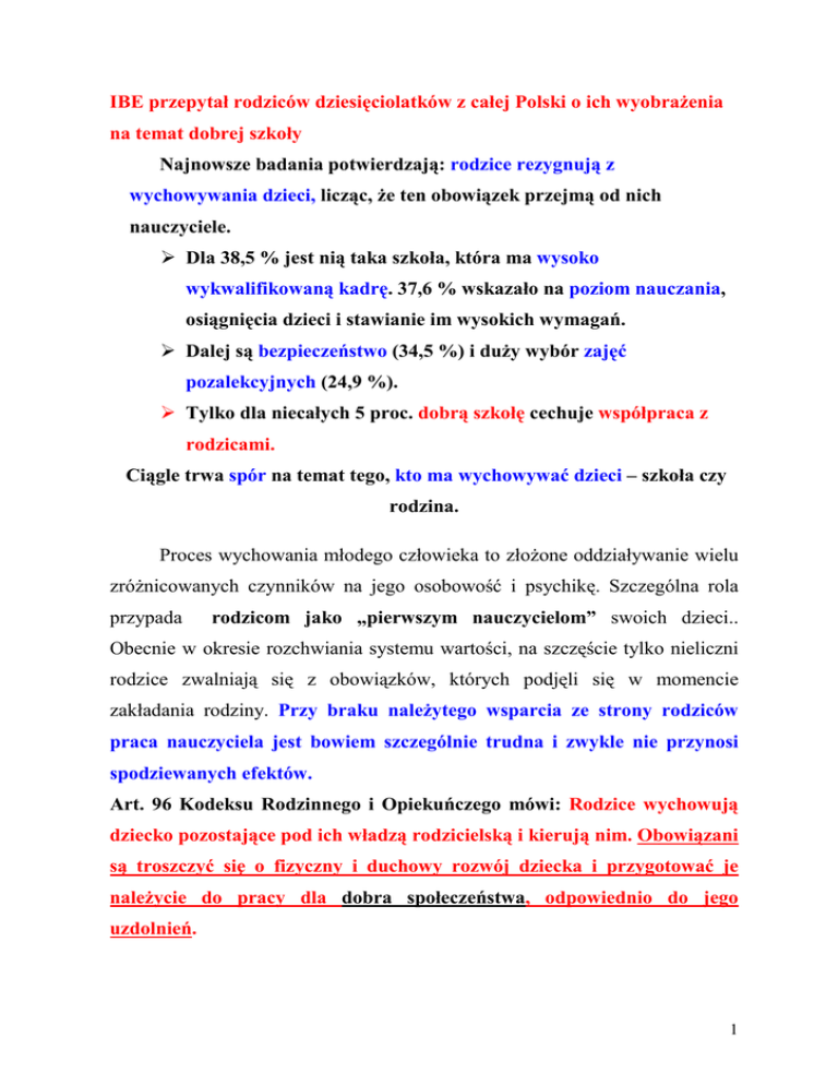 IBE przepytał rodziców dziesięciolatków z całej Polski o ich wyobrażenia na temat dobrej szkoły Najnowsze badania potwierdzają: rodzice rezygnują z wychowywania dzieci, licząc, że ten obowiązek przejmą od nich nauczyciele. Dla 38,5 % jest nią taka szkoła, która ma wysoko wykwalifikowaną kadrę. 37,6 % wskazało na poziom nauczania, osiągnięcia dzieci i stawianie im wysokich wymagań. Dalej są bezpieczeństwo (34,5 %) i duży wybór zajęć pozalekcyjnych (24,9 %). Tylko dla niecałych 5 proc. dobrą szkołę cechuje współpraca z rodzicami. Ciągle trwa spór na temat tego, kto ma wychowywać dzieci – szkoła czy rodzina. Proces wychowania młodego człowieka to złożone oddziaływanie wielu zróżnicowanych czynników na jego osobowość i psychikę. Szczególna rola przypada rodzicom jako „pierwszym nauczycielom” swoich dzieci.. Obecnie w okresie rozchwiania systemu wartości, na szczęście tylko nieliczni rodzice zwalniają się z obowiązków, których podjęli się w momencie zakładania rodziny. Przy braku należytego wsparcia ze strony rodziców praca nauczyciela jest bowiem szczególnie trudna i zwykle nie przynosi spodziewanych efektów. Art. 96 Kodeksu Rodzinnego i Opiekuńczego mówi: Rodzice wychowują dziecko pozostające pod ich władzą rodzicielską i kierują nim. Obowiązani są troszczyć się o fizyczny i duchowy rozwój dziecka i przygotować je należycie do pracy dla dobra społeczeństwa, odpowiednio do jego uzdolnień. 1 „Inteligencja emocjonalna ma większy wi kszy wpływ wp yw na losy człowieka cz owieka niż ni inteligencja intelektualna” intelektualna” Daniel Goleman Uwzględnienie interesu społecznego oznacza m.in. niedziałanie na szkodę osób trzecich np. przez kradzież, pobicie, wymuszanie, obmowę, poniżanie innej osoby, utrudnianie pracy, niszczenie efektów pracy. Prawa i obowiązki rodziców Rodzice mają prawo do: 1) uznania ich prymatu jako „pierwszych nauczycieli” swoich dzieci 2) dostępu do wszelkich informacji dotyczących kształcenia i wychowania ich dzieci 3) rzetelnej informacji o postępach i ocenach nauki i zachowania dziecka 4) wsparcia ze strony szkoły w razie problemów wychowawczych 5) informowania dyrektora szkoły o realizowaniu przez dziecko obowiązku szkolnego poza szkołą rejonową 6) występowania do dyrektora z wnioskiem o odroczenie spełniania przez dziecko obowiązku przedszkolnego/szkolnego 7) partnerskiego współdziałania i aktywnego wpływania, poprzez swoich przedstawicieli na sprawy szkoły. Rodzice mają obowiązek: 1) dopełnienia wszelkich czynności do zgłoszenia dziecka do szkoły 2) zapewnienia systematycznego uczęszczania na zajęcia edukacyjne 3) informowania wychowawcę klasowego o przyczynach nieobecności dziecka na zajęciach szkolnych, usprawiedliwiania nieobecności dziecka 2 4) zapewnienia dziecku takich warunków, aby umożliwić mu przygotowanie się do zajęć 5) wychowywać swoje dziecko w sposób odpowiedzialny, z poszanowaniem godności dziecka i nie zaniedbywać je 6) poświęcać swój czas i uwagę nauce dzieci tak, aby wzmacniać wysiłki szkoły skierowane na osiągnięcie celów nauczania i wychowania 7) naprawy zniszczeń dokonanych przez dziecko 8) angażować się jako partnerzy w działania szkoły, brać aktywny udział w wyborach i współdziałać w organach szkoły 9) brać udział w zebraniach szkolnych, informować wychowawcę o sprawach mogących mieć wpływ na naukę i zachowanie dziecka 10) w przypadku wyjazdu za granicę, rodzic składa pisemne oświadczenie do dyrektora szkoły, zawierające termin przesłania dokumentów świadczących o realizowaniu przez dziecko obowiązku szkolnego poza granicami szkoły. W przypadku niedotrzymania terminu określonego przez rodzica, dyrektor szkoły występuje na piśmie, w terminie trzech tygodni od przekroczenia wyznaczonego terminu, do policji o ustalenie miejsca pobytu dziecka. W przypadku gdy nieusprawiedliwionych dziecko/uczeń nieobecności w miesiącu ma 50% szkoła sporządza upomnienie kierowane do rodziców o niespełnieniu przez dziecko obowiązku szkolnego. Niespełnienie wymienionego obowiązku skutkuje skierowaniem sprawy na drogę postępowania egzekucyjnego. 3 Dokumenty mówiące o prawach i obowiązkach rodziców to m. in.: - Europejska Karta Praw i Obowiązków Rodziców - Kodeks Rodzinny i Opiekuńczy Zawarcie małżeństwa i powstanie rodziny wiąże się z nawiązaniem między osobami tworzącymi rodzinę bogatych i bardzo zróżnicowanych powiązań: uczuciowych, emocjonalnych, osobistych, materialnych. Z powstania, a następnie funkcjonowania tych powiązań – zwanych stosunkami rodzinnymi – wynikają określone prawa i obowiązki wzajemne między członkami rodziny, głównie między małżonkami oraz między rodzicami i dziećmi. Stosunki między rodzicami a dziećmi W regulacjach przyjętych w Kodeksie Rodzinnym i Opiekuńczym (KRiO) na szczególną uwagę zasługuje art. 87, który mówi, że Rodzice i dzieci obowiązani są wspierać się wzajemnie. Obowiązek ten i wynikające z niego prawo dotyczy całej sfery powiązań niematerialnych i materialnych między członkami rodziny i oznacza np. opiekę nad chorym, pomoc w nauce, pomoc w prowadzeniu gospodarstwa domowego, wsparcie psychiczne i pomoc w niepowodzeniach itd. Obowiązek ten jest wzajemny, tzn. dotyczy zarówno dzieci, jak i rodziców. Wiele niedomówień między dorastającymi dziećmi a rodzicami wyjaśnia art.91 KRiO. Par. 2 tego artykułu stanowi, że: Dziecko, które pozostaje na utrzymaniu rodziców i mieszka u nich jest obowiązane pomagać im we wspólnym gospodarstwie. Powyższe zapisy oprócz unormowań prawnych mają bardzo duże znaczenie wychowawcze i wpływają na prawidłowe kształtowanie postaw rodzinnych i społecznych młodego człowieka. Władza rodzicielska Zagadnienia dotyczące sprawowania władzy rodzicielskiej znajdują się w tytule II: Pokrewieństwo, dział I, rozdział 