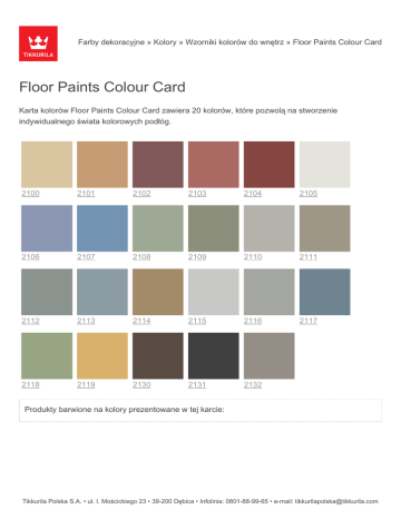 Farby dekoracyjne » Kolory » Wzorniki kolorów do wnętrz » Floor Paints Colour Card Floor Paints Colour Card Karta kolorów Floor Paints Colour Card zawiera 20 kolorów, które pozwolą na stworzenie indywidualnego świata kolorowych podłóg. 2100 2101 2102 2103 2104 2105 2106 2107 2108 2109 2110 2111 2112 2113 2114 2115 2116 2117 2118 2119 2130 2131 2132 Produkty barwione na kolory prezentowane w tej karcie: Tikkurila Polska S.A. • ul. I. Mościckiego 23 • 39-200 Dębica • Infolinia: 0801-88-99-65 • e-mail: [email protected] Farby dekoracyjne » Kolory » Wzorniki kolorów do wnętrz » Floor Paints Colour Card Tikkurila Betolux UWAGA! Kolory widoczne na ekranie monitora zostały wygenerowane elektronicznie. Mogą one różnić się od rzeczywistych kolorów wymalowań, jako że na odbiór koloru mają wpływ takie czynniki jak wykończenie i połysk materiału czy oświetlenie. Przed zakupem i użyciem danej farby prosimy zawsze sprawdzać wybrany kolor w karcie kolorów Tikkurila lub na próbkach kolorów.