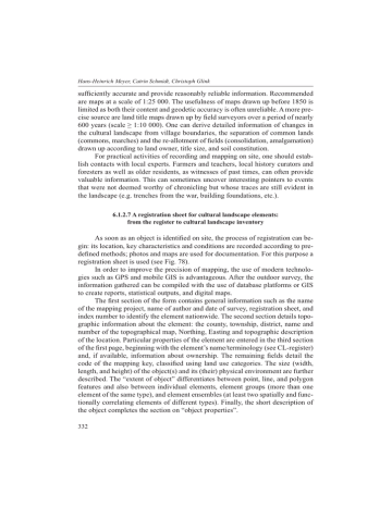 Hans-Heinrich Meyer, Catrin Schmidt, Christoph Glink VXI¿FLHQWO\DFFXUDWHDQGSURYLGHUHDVRQDEO\UHOLDEOHLQIRUPDWLRQ5HFRPPHQGHG DUHPDSVDWDVFDOHRI7KHXVHIXOQHVVRIPDSVGUDZQXSEHIRUHLV OLPLWHGDVERWKWKHLUFRQWHQWDQGJHRGHWLFDFFXUDF\LVRIWHQXQUHOLDEOH$PRUHSUHFLVHVRXUFHDUHODQGWLWOHPDSVGUDZQXSE\¿HOGVXUYH\RUVRYHUDSHULRGRIQHDUO\ \HDUVVFDOH2QHFDQGHULYHGHWDLOHGLQIRUPDWLRQRIFKDQJHVLQ WKHFXOWXUDOODQGVFDSHIURPYLOODJHERXQGDULHVWKHVHSDUDWLRQRIFRPPRQODQGV FRPPRQVPDUFKHVDQGWKHUHDOORWPHQWRI¿HOGVFRQVROLGDWLRQDPDOJDPDWLRQ GUDZQXSDFFRUGLQJWRODQGRZQHUWLWOHVL]HDQGVRLOFRQVWLWXWLRQ )RUSUDFWLFDODFWLYLWLHVRIUHFRUGLQJDQGPDSSLQJRQVLWHRQHVKRXOGHVWDEOLVKFRQWDFWVZLWKORFDOH[SHUWV)DUPHUVDQGWHDFKHUVORFDOKLVWRU\FXUDWRUVDQG IRUHVWHUVDVZHOODVROGHUUHVLGHQWVDVZLWQHVVHVRISDVWWLPHVFDQRIWHQSURYLGH YDOXDEOHLQIRUPDWLRQ7KLVFDQVRPHWLPHVXQFRYHULQWHUHVWLQJSRLQWHUVWRHYHQWV WKDWZHUHQRWGHHPHGZRUWK\RIFKURQLFOLQJEXWZKRVHWUDFHVDUHVWLOOHYLGHQWLQ WKHODQGVFDSHHJWUHQFKHVIURPWKHZDUEXLOGLQJIRXQGDWLRQVHWF 6.1.2.7 A registration sheet for cultural landscape elements: from the register to cultural landscape inventory $VVRRQDVDQREMHFWLVLGHQWL¿HGRQVLWHWKHSURFHVVRIUHJLVWUDWLRQFDQEHJLQLWVORFDWLRQNH\FKDUDFWHULVWLFVDQGFRQGLWLRQVDUHUHFRUGHGDFFRUGLQJWRSUHGH¿QHGPHWKRGVSKRWRVDQGPDSVDUHXVHGIRUGRFXPHQWDWLRQ)RUWKLVSXUSRVHD UHJLVWUDWLRQVKHHWLVXVHGVHH)LJ ,QRUGHUWRLPSURYHWKHSUHFLVLRQRIPDSSLQJWKHXVHRIPRGHUQWHFKQRORJLHVVXFKDV*36DQGPRELOH*,6LVDGYDQWDJHRXV$IWHUWKHRXWGRRUVXUYH\WKH LQIRUPDWLRQJDWKHUHGFDQEHFRPSLOHGZLWKWKHXVHRIGDWDEDVHSODWIRUPVRU*,6 WRFUHDWHUHSRUWVVWDWLVWLFDORXWSXWVDQGGLJLWDOPDSV 7KH¿UVWVHFWLRQRIWKHIRUPFRQWDLQVJHQHUDOLQIRUPDWLRQVXFKDVWKHQDPH RIWKHPDSSLQJSURMHFWQDPHRIDXWKRUDQGGDWHRIVXUYH\UHJLVWUDWLRQVKHHWDQG LQGH[QXPEHUWRLGHQWLI\WKHHOHPHQWQDWLRQZLGH7KHVHFRQGVHFWLRQGHWDLOVWRSRJUDSKLFLQIRUPDWLRQDERXWWKHHOHPHQWWKHFRXQW\WRZQVKLSGLVWULFWQDPHDQG QXPEHURIWKHWRSRJUDSKLFDOPDS1RUWKLQJ(DVWLQJDQGWRSRJUDSKLFGHVFULSWLRQ RIWKHORFDWLRQ3DUWLFXODUSURSHUWLHVRIWKHHOHPHQWDUHHQWHUHGLQWKHWKLUGVHFWLRQ RIWKH¿UVWSDJHEHJLQQLQJZLWKWKHHOHPHQW¶VQDPHWHUPLQRORJ\VHH&/UHJLVWHU DQG LI DYDLODEOH LQIRUPDWLRQ DERXW RZQHUVKLS 7KH UHPDLQLQJ ¿HOGV GHWDLO WKH FRGH RI WKH PDSSLQJ NH\ FODVVL¿HG XVLQJ ODQG XVH FDWHJRULHV7KH VL]H ZLGWK OHQJWKDQGKHLJKWRIWKHREMHFWVDQGLWVWKHLUSK\VLFDOHQYLURQPHQWDUHIXUWKHU GHVFULEHG7KH³H[WHQWRIREMHFW´GLIIHUHQWLDWHVEHWZHHQSRLQWOLQHDQGSRO\JRQ IHDWXUHV DQG DOVR EHWZHHQ LQGLYLGXDO HOHPHQWV HOHPHQW JURXSV PRUH WKDQ RQH HOHPHQWRIWKHVDPHW\SHDQGHOHPHQWHQVHPEOHVDWOHDVWWZRVSDWLDOO\DQGIXQFWLRQDOO\FRUUHODWLQJHOHPHQWVRIGLIIHUHQWW\SHV)LQDOO\WKHVKRUWGHVFULSWLRQRI WKHREMHFWFRPSOHWHVWKHVHFWLRQRQ³REMHFWSURSHUWLHV´ 332 A practical guide... 5(*,675$7,216+((7)25+,6725,&$//$1'6&$3((/(0(176 3URMHFW ,17(55(*,,,%&8/785$//$1'6&$3( ,QGH[1R 6KHHW1R $XWKRU 'DWH 5HQp+HLQULFK /RFDWLRQRIREMHFW &RXQW\ %LVWULWD1DVDXG 1RRIWRSRJUDSKLFDOPDS 7RZQVKLS 6LHX0DJKHUXV 1RUWKLQJ 'HVFULSWLRQRIORFDWLRQ :HVWHUQSDUWRIYLOODJH 2EMHFWSURSHUWLHV 1DPHWHUPLQRORJ\ +ROORZSDWK 0DSSLQJNH\FRGH ([WHQWRIREMHFW 3RLQW ,QGLYLGXDOHOHPHQW 'LVWULFW $UFDOLD (DVWLQJ 2ZQHUVKLS FRPPXQDO 6L]H>P@ZLGWKOHQJWKKHLJKW (QYLURQPHQW P IRUHVWDUHD /LQH [ (OHPHQWJURXS [ 3RO\JRQ 2EMHFWHQVHPEOH 6KRUWGHVFULSWLRQRIREMHFW +ROORZSDWKJHQHUDWHGE\IRUHVWU\XVHRQDVWHHSKLOOVLGHVXEVRLOFOD\VWUDWXPWKLFNQHVVWR PERWWRPZLWKGHHSHURVLRQJURRYHVWRPVWLOOLQXVHHQYLURQPHQWRDNKRUQEHDP DQGPDSOHIRUHVW (YDOXDWLRQ 6WDWHRIFRQVHUYDWLRQ (QGDQJHUPHQW 9HU\ZHOOFRQVHUYHG ORZ $GYLFHIRUIXUWKHUFRQVHUYDWLRQPHDVXUHV 1RPHDVXUHVQHFHVVDU\ /DQGVFDSHUHODWHGH[SHULHQFHHIIHFW 5HJLRQDOFKDUDFWHULVWLF $OPRVWQRWGLVFHUQLEOH 7\SLFDOIRUWKHUHJLRQ 5DULW\ 5HPDUNV LQIUHTXHQW Fig. 78. 5HJLVWUDWLRQVKHHWIRUKLVWRULFDOODQGVFDSHHOHPHQWVSDJH 7KH IRXUWK VHFWLRQ RQ SDJH FRQWDLQV FULWHULD IRU REMHFW HYDOXDWLRQ 7KH HGLWRUKDVWRHVWLPDWHWKHVWDWHRIFRQVHUYDWLRQDQGGHJUHHRIHQGDQJHUPHQWZLWK UHJDUGWRLWVSUHVHUYDWLRQZRUWKLQHVVDQGZKHUHDSSOLFDEOHSURYLGHVRPHDGYLFH IRUQHFHVVDU\FRQVHUYDWLRQPHDVXUHV7RHYDOXDWHODQGVFDSHHOHPHQWVLWLVDOVR QHFHVVDU\WRUHFRUGKRZUDUHWKH\DUHDQGGHVFULEHWKHLUUHJLRQDOFKDUDFWHULVWLFV ,Q WKLV UHVSHFW DFFRUGLQJ WR %XUJJUDDI DQG .OHHIHOG >@ DQ HOHPHQW FDQ EH UHJDUGHGDVKLJKO\W\SLFDOIRUWKHUHJLRQLIIRUKLVWRULFDORUQDWXUDODUHDUHODWHG 333 Hans-Heinrich Meyer, Catrin Schmidt, Christoph Glink UHDVRQV³«LWFDQH[FOXVLYHO\EHIRXQGLQDSDUWLFXODUUHJLRQDQGLWLVOLQNHGWRWKH FKDUDFWHULVWLFVRIWKHDUHD´7KHVFDOHIRUUHJLRQDOFKDUDFWHULVWLFLVDVIROORZV ³KLJKO\W\SLFDOIRUWKHUHJLRQDQGFKDUDFWHUIRUPLQJ´ ³W\SLFDOIRUWKHUHJLRQ´DQG ³QRWW\SLFDOIRUWKHUHJLRQ´ 5(*,675$7,216+((7)25+,6725,&$//$1'6&$3((/(0(176 3URMHFW ,17(55(*,,,%&8/785$//$1'6&$3( ,QGH[1R 6KHHW1R $XWKRU 'DWH 5HQp+HLQULFK 3KRWRJUDSKRIREMHFWDXWKRUGDWHRIFDSWXUHUHPDUNV 3KRWRJUDSK5HQp+HLQULFK 3RVLWLRQRIREMHFWLQPDS 0DS7RSRJUDSKLFDOPDSRI5RPDQLDVFDOH )XUWKHUVRXUFHV Fig. 79. 5HJLVWUDWLRQVKHHWIRUKLVWRULFDOODQGVFDSHHOHPHQWVSDJH 334 A practical guide... 7KHVFDOHIRUUDULW\UDQJHVIURP³IUHTXHQW´³LQIUHTXHQWRFFDVLRQDO´ DQG³YHU\UDUH´7KHVFDOHIRUVWDWHRIFRQVHUYDWLRQUDQJHVIURP³YHU\ZHOO FRQVHUYHG´³PRGHUDWHO\ZHOOFRQVHUYHG´DQG³GLVLQWHJUDWHG´ 7KHVFDOHIRUHQGDQJHUPHQWUDQJHVIURP ³KLJK´ ³PRGHUDWH´ DQG³ORZ´ )RU WKH ODQGVFDSHUHODWHG H[SHULHQFH HIIHFW ZKLFK LV GHWHUPLQHG E\ WKH QXPEHUDQGSUHVHQFHRIKLVWRULFDOFXOWXUDOODQGVFDSHHOHPHQWVLQWKHODQGVFDSH WKHVFDOHLV ³ZHOOGLVFHUQLEOHSURPLQHQW´ ³GLVFHUQLEOH´DQG ³DOPRVWQRWRUQRWGLVFHUQLEOHODWHQW´ 3DJHWZRRIWKHUHJLVWUDWLRQIRUPUHSHDWVWKHKHDGHULQIRUPDWLRQWKHQDPH RIWKHPDSSLQJSURMHFWQDPHRIDXWKRUDQGGDWHRIVXUYH\VKHHWDQGLQGH[QXPEHU DQGSURYLGHVDSKRWRJUDSKDQGWRSRJUDSKLFPDSDVDYLVXDOUHFRUGRIWKHREMHFW DQGLWVVLWH6HH)LJ 6.1.3 From the inventory to practical implementation: from individual element to the whole 6.1.3.1 Selective approaches 7KHPDSSLQJRIKLVWRULFDOFXOWXUDOODQGVFDSHHOHPHQWVLVUHJDUGHGDVRQHRI WKHVHFWRUVZLWKWKHKLJKHVWTXDQWLW\RIUHFRUGHGH[SHULHQFHZLWKLQWKHWRSLF³FXOWXUDOODQGVFDSH´([DPSOHVJLYHQKHUHDUHWKHKLVWRULFDOJHRJUDSKLFODQGUHFRUGV E\'HQHFNH>@DVZHOODVWKHH[HPSODU\UHFRUGVE\:|EVH>@6FKHUHU +DOO@@%XUJJUDDIDQG.OHHIHOG>@DQGWKHPDQLIROGH[SHULHQFHVZLWK FXOWXUDOODQGVFDSHHOHPHQWUHJLVWHUVHJ.XOD',*./(.V 7KHVHOHFWLYHUHFRUGLQJRIFXOWXUDOODQGVFDSHHOHPHQWVJHQHUDOO\DOVROHDGV WRVHOHFWLYHSODQQLQJRUSUR