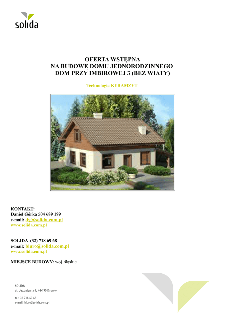 OFERTA WSTĘPNA NA BUDOWĘ DOMU JEDNORODZINNEGO DOM PRZY IMBIROWEJ 3 (BEZ WIATY) Technologia KERAMZYT KONTAKT: Daniel Górka 504 689 199 e-mail: [email protected] www.solida.com.pl SOLIDA (32) 718 69 68 e-mail: [email protected] www.solida.com.pl MIEJSCE BUDOWY: woj. śląskie POWIERZCHNIA UŻYTKOWA/PODŁÓG(WG PROJEKTU TYPOWEGO): 81,67m2/97,98m2 WARUNKI REALIZACJI W cenie budowy zostały ujęte: • prowadzenie dokumentacji budowlanej, • nadzór Kierownika Budowy, • wywóz nieczystości. Zalety naszej oferty, które mogą zadecydować o podjęciu przez Państwa decyzji o rozpoczęciu własnej inwestycji to: • • • • fachowa obsługa i doradztwo techniczne profesjonalne, sprawne i sprawdzone ekipy budowlane terminowe rozpoczęcie i zakończenie prac budowlanych na życzenie klienta, pomoc w wyborze projektu tak, aby był on zgodny z wyznaczonym budżetem na budowę domu. Podane ceny są cenami netto (należy doliczyć 8% VAT). PŁYTA FUNDAMENTOWA Zakres prac obejmuje: · wykonanie badań geotechnicznych, · wykonanie projektu zamiennego płyty fundamentowej, · wytyczenie geodezyjne budynku, · usunięcie warstwy nienośnej gruntu o grubości 30 cm z odwozem do 20 m, · wykonanie odpowiednio zagęszczonej podbudowy płyty fundamentowej z podsypki piaskowej (zgodnie z projektem płyty) w uprzednio przygotowanym wykopie, · wykonanie podkładu z chudego betonu, · wykonanie izolacji przeciwwilgociowej z papy, · wykonanie zewnętrznego krawędziowego docieplenia płyty ze styropianu EPS 70 o grub. 15 cm, · ułożenie podejść kanalizacyjnych i wyprowadzenie instalacji kanalizacyjnej poza obręb płyty (ok.1,0m), · ułożenie i wyprowadzenie instalacji powietrznej kominka poza obręb płyty (1 szt.), · ułożenie i wyprowadzenie przepustu instalacji przyłącza wody w płycie,z wyprowadzeniem instalacji poza obręb płyty (1 szt.), · ułożenie i wyprowadzenie przepustu instalacji elektrycznej i multimedialnej w płycie (1 szt.), · wbudowanie betonu za pomocą pompy, · zawibrowanie powierzchni listwą wibracyjną i wyrównanie powierzchni płyty fundamentowej; · pielęgnacja płyty poprzez zabezpieczenie folią (zależnie od warunków atmosferycznych) Oferta nie uwzględnia wykonania tarasów, schodów zewnętrznych i drenażu opaskowego. Przyjęto posadowienie płyty na gruntach zaliczanych do pierwszej kategorii geotechnicznej. Nie uwzględniono zabezpieczeń na szkody górnicze. Przyjęto 50 cm grubości podbudowy pod fundamentem, z przegłębienie po obwodzie płyty do 100 cm. W przypadku warunków gruntowych wymagających grubszej podbudowy, np. na skutek znacznego nachylenia terenu, koszty etapu mogą wzrosnąć. Koszt dodatkowej podbudowy 75zł/m3. ŚCIANY ZEWNĘTRZNE I WEWNĘTRZNE Zakres prac obejmuje: · adaptacja ścian do projektu budowlanego, · prefabrykacja ścian wraz z transportem na plac budowy, · montaż prefabrykatów, · zazbrojenie konstrukcji wraz z wypełnieniem zamków betonem C16/20, · wykonanie kosmetyki połączeń (wykonywana po zamknięciu budynku). GWARANCJA NA ŚCIANY 50 LAT STROP BETONOWY Zakres prac obejmuje: · adaptacja stropu do projektu budowlanego, · prefabrykacja płyt stropowych wraz z transportem na plac budowy, · montaż prefabrykatów. DACH WRAZ Z ORYNNOWANIEM, KOMINY SPALINOWE I WENTYLACYJNE Zakres prac obejmuje: · wykonanie konstrukcji drewnianej dachu · pokrycie połaci folią dachową, łacenie, · wykonanie przewodów spalinowych (2 sztuki – do kotła i kominka) i wentylacyjnych z systemowych kształtek kominowych SCHIEDEL i kominków wentylacyjnych DuroVent, · wykonanie czapek kominowych, · wykończenie kominów płytkami klinkierowymi ponad połacią dachu, · pokrycie dachówką cementową BRAAS, typ Celtycka w jednym z 5 podstawowych kolorów, · obróbki: wykonanie koszy, pasa nadrynnowego i opierzenia komina, · montaż ławy kominiarskiej wg projektu, · montaż wyłazu dachowego wg projektu, · orynnowanie z PCV w jednym z podstawowych kolorów oferowanych przez producenta oraz montaż rur spustowych pionowych, zakończonych na dole kolanem jednokielichowym, · wykonanie podbitek z listew drewnianych sosnowych lub świerkowych, malowanych gr. 12 mm. (wykonywane na etapie elewacji ) PRODUCENT UDZIELA 30 LETNIEJ GWARANCJI NA DACHÓWKĘ. Dach na pełnym systemie Braas (bez zamienników). Uwaga: Zakres prac nie obejmuje odprowadzenia deszczówki spod rur spustowych. SCHODY WEWNĘTRZNE Zakres prac obejmuje: · wykonanie schodów wewnętrznych żelbetowych, zatartych na szorstko. STOLARKA OKIENNA Z PCV Zakres prac obejmuje: · dostawa i montaż okien według projektu: stolarka okienna PVC firmy EUROCOLOR, w kolorze 1-str okleinowanym, model Efektiv 73 o profilu 7-komorowy lub model Global 70 o profilu 5- komorowym; drzwi tarasowe otwierane tradycyjnie. DRZWI ZEWNĘTRZNE Zakres prac obejmuje: · dostawa i montaż drzwi wejściowych PVC EUROCOLOR klasy Silver, otwierane klamką, z pełnym wyposażeniem, kolorystyka wg palety producenta (wymiary standardowe, bez doświetleń bocznych i górnych), · dostawa i montaż stalowych drzwi zewnętrznych do kotłowni Delta. ELEWACJA Zakres prac obejmuje: · ocieplenie elewacji styropianem EPS 70 0,038 o grubości 20 cm w pełnym systemie ARSANIT (przyklejenie płyt styropianowych wraz z kołkowaniem, ułożenie siatki zbrojącej oraz podkładu pod tynk), · wykonanie parapetów zewnętrznych · zabezpieczenie naroży budynku oraz obramowania okien listwami narożnikowymi, · pokrycie elewacji tynkiem akrylowym Arsanit - kasza, ziarno 1,5 mm, kolory z dopłatą do 30%, · wykończenie cokołu tynkiem mozaikowym Arsanit. Zakres prac nie obejmuje wykonania elementów sztukaterii (przypory, gzymsy, bonie, balustrady, balkony, okładziny itp.) GWARANCJA NA SYSTEM OCIEPLENIA - 7 LAT. GŁADZIE I MALOWANIE Zakres prac obejmuje: · wykonanie przecierki gładzi wewnątrz budynku oraz malowanie w kolorze białym. INSTALACJA WOD-KAN Zakres prac obejmuje: · wykonanie podejść kanaliza