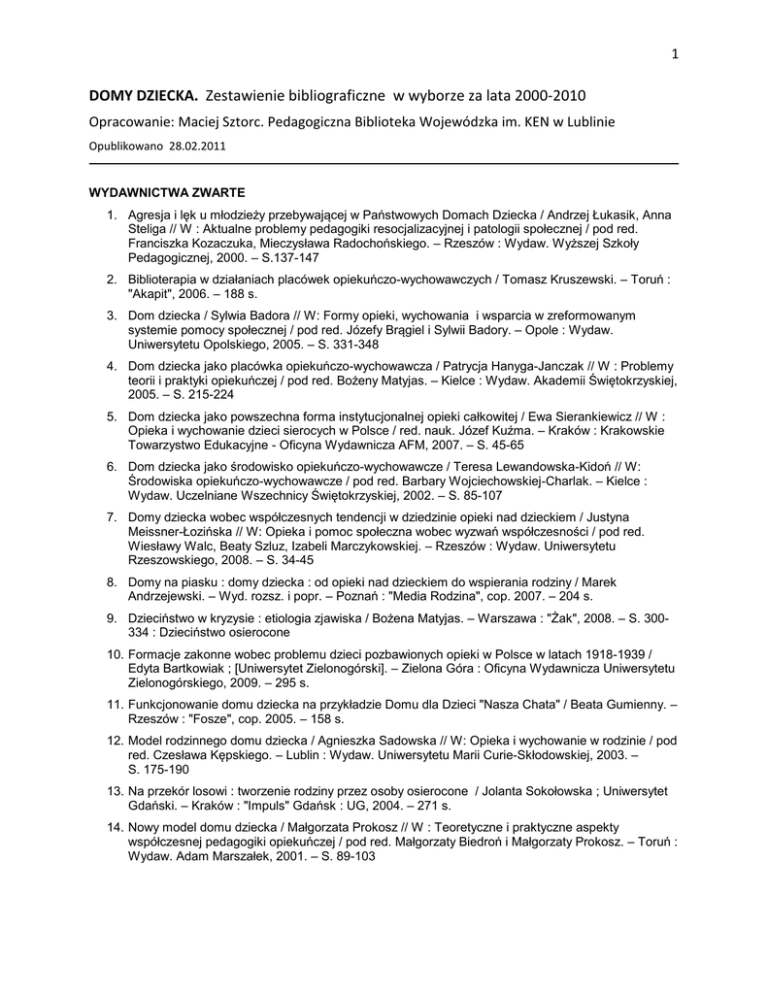 DOMY DZIECKA. Zestawienie bibliograficzne w wyborze za lata