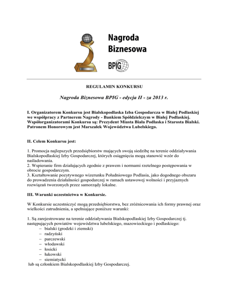 REGULAMIN KONKURSU Nagroda Biznesowa BPIG - edycja II - za 2013 r. I. Organizatorem Konkursu jest Bialskopodlaska Izba Gospodarcza w Białej Podlaskiej we współpracy z Partnerem Nagrody - Bankiem Spółdzielczym w Białej Podlaskiej. Współorganizatorami Konkursu są: Prezydent Miasta Biała Podlaska i Starosta Bialski. Patronem Honorowym jest Marszałek Województwa Lubelskiego. II. Celem Konkursu jest: 1. Promocja najlepszych przedsiębiorstw mających swoją siedzibę na terenie oddziaływania Bialskopodlaskiej Izby Gospodarczej, których osiągnięcia mogą stanowić wzór do naśladowania. 2. Wspieranie firm działających zgodnie z prawem i normami rzetelnego postępowania w obrocie gospodarczym. 3. Kształtowanie pozytywnego wizerunku Południowego Podlasia, jako dogodnego obszaru do prowadzenia działalności gospodarczej w ramach ustawowej wolności i przyjaznych rozwiązań tworzonych przez samorządy lokalne. III. Warunki uczestnictwa w Konkursie. W Konkursie uczestniczyć mogą przedsiębiorstwa, bez zróżnicowania ich formy prawnej oraz wielkości zatrudnienia, a spełniające poniższe warunki: 1. Są zarejestrowane na terenie oddziaływania Bialskopodlaskiej Izby Gospodarczej tj. następujących powiatów województwa lubelskiego, mazowieckiego i podlaskiego: bialski (grodzki i ziemski) radzyński parczewski włodawski łosicki łukowski siemiatycki lub są członkiem Bialskopodlaskiej Izby Gospodarczej. 2. Prowadzą działalność gospodarczą nie krócej niż trzy lata z wyjątkiem kategorii „Udany start”, w której uczestniczą przedsiębiorcy prowadzący działalność do dwóch lat. 3. Nie posiadają zaległości wobec organów skarbowych i ZUS oraz nie są w stanie likwidacji ani upadłości (stosowne oświadczenie). 4. Terminowo złożyły w Sekretariacie Konkursu wypełnioną deklarację wraz z ankietą i kompletem załączników dołączonych do niniejszego regulaminu. 5. Wyrażają zgodę na przeprowadzenie przez członków Kapituły wizytacji przedsiębiorstwa. IV. Sekretariat Konkursu. Sekretariat Konkursu mieści się w siedzibie Bialskopodlaskiej Izby Gospodarczej. Adres: 21-500 Biała Podlaska, ul. Warszawska 12c. Sekretariat pełni funkcje administracyjne. Dyrektor Izby sprawuje funkcję sekretarza Kapituły. V. Kapituła Konkursu. 1. Siedmioosobową Kapitułę Konkursu stanowić będą osoby o dużej wiedzy merytorycznej, cieszące się autorytetem i powszechnym zaufaniem. Członkowie Kapituły zostaną powołani przez Prezesa Bialskopodlaskiej Izby Gospodarczej spośród kandydatur wytypowanych przez: Radę BPIG 4 osoby Współorganizatorów 2 osoby Partnera 1 osoba 2. Przewodniczącym Kapituły jest Prezes BPIG a Wiceprzewodniczącym wybrany w głosowaniu jawnym członek Kapituły, przedstawiciel BPIG. 3. Posiedzenia Kapituły zwołuje pisemnie Przewodniczący lub Wiceprzewodniczący. Obrady Kapituły są protokołowane. Decyzje podejmowane są w formie uchwał zwykłą większością głosów uczestniczących w posiedzeniu. W przypadku równej ilości głosów, rozstrzygający jest głos Przewodniczącego posiedzenia. Kapituła pracuje tylko w okresie trwania konkursu. VI. Przebieg Konkursu. Konkurs ,,Nagroda Biznesowa BPIG" przebiega w trzech etapach, terminarz określony jest w punkcie VII: 1. Etap I Ogłoszenie konkursu przez Kapitułę. Wystosowanie zaproszeń do udziału w Konkursie. Przyjmowanie zgłoszeń z kompletami materiałów. 2. Etap II Weryfikacja formalna zgłoszeń. Kapituła odrzuci z Konkursu firmy, które nie spełniają kryteriów określonych w pkt. III niniejszego regulaminu. 3. ETAP III Weryfikacja merytoryczna pozostających w Konkursie zgłoszeń. Ocena punktowa. Ewentualne wizyty u wybranych wnioskodawców. Wyłonienie laureatów w poszczególnych kategoriach Konkursu. VII. Terminy organizacji Konkursu. Konkurs będzie zorganizowany w terminach: 1. Ustanowienie składu osobowego Kapituły Konkursu - do 01 marca. 2. Ogłoszenie Konkursu i zaproszenie firm do udziału - 20 marzec. 3. Przyjmowanie zgłoszeń wraz z kompletem materiałów konkursowych - do 10 maja. 4. Ocena zgłoszonych firm przez Kapitułę, wyłonienie laureatów - do 10 czerwca. 5. Uroczysta gala i wręczenie nagród - do 30 czerwca. VIII. Kategorie Konkursu. 1. „Udany start” - firma zarejestrowana nie później niż dwa lata przed terminem składania wniosków, - zgłoszenie opisowe: co robi, gdzie, jak, sukcesy, perspektywy. 2. „Innowacyjna firma - zgłoszenie opisowe: wykazać innowacyjność w działalności firmy (usługi lub produktu) lub przedstawić pojedynczy projekt innowacyjny zrealizowany w firmie. 3. „Lider przedsiębiorczości” - formularz pokazujący dynamikę rozwoju firmy w trzech ostatnich, pełnych okresach obrachunkowych: - przychody - zatrudnienie - wynik finansowy - nakłady inwestycyjne - inne czynniki ogólne 4. „Przedsiębiorca Roku” - (jedna nagroda dla osoby fizycznej - właściciel, prezes). IX. Kryteria oceny merytorycznej - Ustala Kapituła dla każdej edycji i kategorii Konkursu. X. Nagrody. Wszyscy uczestnicy zakwalifikowani do III etapu otrzymują dyplomy uczestnika. Laureaci - statuetka, dyplom, zakładka na stronie BPIG o laureatach plus na stronach laureatów linki do strony BPIG. Zatwierdzam: .............................................. Przewodniczący Kapituły ..................................................... Wiceprzewodniczący Kapituły