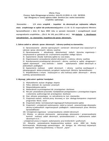 Oferta Pracy Prezesa Sądu Okręgowego w Łomży z dnia 01.12.2010 r A -110- 39/2010. Sąd Okręgowy w Łomży ogłasza nabór (konkurs )na wolne stanowisko urzędnika sądowego. Stanowisko - 1/4 etatu urzędnik - inspektor ds. obronnych po wykazaniu odbycia stażu urzędniczego w sądzie lub prokuraturze(zgodnie z § 16 i § 21 rozporządzenia Ministra Sprawiedliwości z dnia 31 lipca 2003 roku w sprawie stanowisk i szczegółowych zasad wynagradzania urzędników……(Dz.U. Nr 143, poz.1399 ze zm.) lub stażysta z docelowym zatrudnieniem na stanowisku inspektora do spraw obronnych , 1. Zakres zadań w zakresie spraw obronnych i obrony cywilnej na stanowisku: 1) Opracowywanie planów operacyjnych i zamierzeń obronnych oraz wytycznych w zakresie spraw obronnych i obrony cywilnej 2) Opracowywanie i aktualizacja dokumentacji stałych dyżurów, organizacja i utrzymywanie w gotowości do uruchomienia zespołów stałego dyżuru 3) Zapewnienie obsady kadrowej sądów na czas wojny 4) Organizowanie i prowadzenie szkoleń obronnych i z zakresu obrony cywilnej 5) Koordynowanie przedsięwzięć obronnych i obrony cywilnej w sądzie okręgowym i sądach rejonowych oraz kontrola i nadzór wykonywania zadań obronnych w jednostkach podległych 6) Zapewnienie realizacji zadań obronnych i obrony cywilnej wynikających z obowiązujących aktów prawnych, zarządzeń i wytycznych Ministra Sprawiedliwości 7) Współdziałanie z innymi instytucjami w celu realizacji zadań obronnych i obrony cywilnej, sprawozdawczość. 2. Wymogi , jakie winni spełniać kandydaci: 1) 2) 3) 4) 5) Wykształcenie wyższe drugiego stopnia Pełna zdolność do czynności prawnych Nieposzlakowana opinia Niekaralność za przestępstwo lub przestępstwo skarbowe Nie jest prowadzone przeciwko kandydatowi postępowanie o przestępstwo ścigane z oskarżenia publicznego lub przestępstwo skarbowe 6) Stan zdrowia pozwalający na zatrudnieniu na tym stanowisku 7) Znajomość metod i technik pracy biurowej, w tym obsługa komputera- znajomość programów Word, excel 8) Znajomość aktów normatywnych regulujących funkcjonowanie sądów 9) Znajomość i umiejętność wykonywania zadań w ramach powszechnego obowiązku obrony w jednostkach organizacyjnych podległych i nadzorowanych przez Ministra Sprawiedliwości 10) Umiejętność organizacji i przeprowadzania szkoleń obronnych 11) Wiedza w zakresie planowania operacyjnego, planowania i przeprowadzania kontroli realizacji zadań obronnych, sprawozdawczości z wykonywania zadań obronnych m.in. : - umiejętność pracy w mapach, wykonywania prac kreślarskich i graficznych. 12) Aktualne poświadczenie bezpieczeństwa wydane przez ABW lub Służby Kontrwywiadu Wojskowego upoważniające do dostępu do informacji niejawnych stanowiących tajemnicę państwową o klauzuli „tajne”. W sytuacji braku kandydatów spełniających wymóg posiadania poświadczenia bezpieczeństwa o klauzuli „tajne” dopuszcza się możliwość posiadania przez kandydata aktualnego poświadczenia bezpieczeństwa tylko do tajemnicy służbowej o klauzuli „poufne” z jednoczesnym złożeniem oświadczenia o wyrażeniu zgody na przeprowadzenie postępowania sprawdzającego do wiadomości stanowiących tajemnicę państwową do klauzuli „tajne”. 3.Wymagania dodatkowe: 1) Staż pracy w jednostce wojskowej na stanowisku żołnierza zawodowego lub w administracji wojskowej z posiadaniem przygotowania fachowego i predyspozycji do wykonywania zadań obronnych 2) Dobra organizacja pracy własnej, umiejętność pracy w zespole 3) Odporność na stres 4) Zdolności analityczne 4. Wymagane dokumenty 1) Podanie , życiorys z przebiegiem nauki i pracy zawodowej, kwestionariusz osobowy dla osoby ubiegającej się o zatrudnienie ( do pobrania ze strony internetowej Sądu lub osobiście w pokoju nr 21 I piętro , budynek Sądu ul. Dworna 16), 2) Kopie dokumentów potwierdzających wykształcenie, 3) Kopie dokumentów potwierdzających doświadczenie zawodowe (dodatkowo poświadczające staż pracy w jednostce wojskowej na stanowisku żołnierza zawodowego lub w administracji wojskowej) 4) Kopie dokumentów lub oświadczenie kandydata potwierdzające umiejętność obsługi komputera, 5) Oświadczenie kandydata o posiadaniu pełnej zdolności do czynności prawnych, o niekaralności za przestępstwa umyślne, oświadczenie że nie jest prowadzone postępowanie o przestępstwo ścigane z oskarżenia publicznego lub przestępstwo skarbowe; 6) Oświadczenie o wyrażeniu zgody na przetwarzanie danych osobowych do celów rekrutacji, 7) Kopia dowodu osobistego; 8) Oświadczenie o stanie zdrowia pozwalającym na wykonywanie pracy na stanowisku inspektora do spraw obronnych lub zaświadczenie lekarskie 5. Termin i miejsce składania ofert Dokumenty należy złożyć w terminie do 15 grudnia 2010 roku w siedzibie Sądu Okręgowego w Łomży ul. Dworna 16 - sekretariat Prezesa , pok. 21 , I piętro lub przesłać droga pocztową na adres Sąd Okręgowy w Łomży Odział Administracyjny ul. Dworna 16, 18-400 Łomża z dopiskiem „konkurs”. Oferty złożone po terminie (liczy się data stempla pocztowego) oraz nadesłane droga mailową nie będą rozpatrywane . dodatkowe informacje można uzyskać pod numerem telefonu 086 2154252 lub 086 2166281 wew. 254. 6. Inne informacje: Kandydaci poddani zostaną wieloetapowemu (pisemnemu i ustnemu) konkursowi – sprawdzenie wiedzy, umiejętności, predyspozycji oraz zdolności ogólnych kandydata do wykonywania obowiązków na stanowisku. Konkurs przeprowadzi Komisja Konkursowa powołana przez Prezesa Sądu. Kandydaci dopuszczeni do konkursu zostaną powiadomieni w terminie do 21 grudnia br., o terminie i miejscu przeprowadzenia konkursu poprzez umieszczenie listy kandydatów, na stronie internetowej www.lomza.so.gov.pl, zakładka komunikaty oraz na tablicy informacyjnej Sądu. Osoba wybrana w drodze konkursu ( stażysta),która wykaże się wymaganą wiedzą teoretyczną, w 