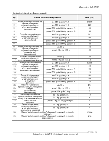 Załącznik nr 1 do SIWZ Zestawienie ilościowe korespondencji: Lp. 1. 2. 3. 4. 5. 6. 7. Rodzaj korespondencji/zwrotu Przesyłki nierejestrowane nie będące przesyłkami najszybszej kategorii w obrocie krajowym (ekonomiczne) do 350 g gabaryt A 14000 do 350 g gabaryt B 220 ponad 350 g do 1000 g gabaryt A 50 ponad 350 g do 1000 g gabaryt B 50 do 350 g gabaryt A 705 do 350 g gabaryt B 40 ponad 350 g do 1000 g gabaryt A 40 ponad 350 g do 1000 g gabaryt B 40 do 50 g 50 ponad 50 g do 100 g 50 do 50 g 20 ponad 50 g do 100 g 12 do 350 g gabaryt A 59968 do 350 g gabaryt B 50 ponad 350 g do 1000 g gabaryt A 20 ponad 350 g do 1000 g gabaryt B 20 Przesyłki rejestrowane do 350 g gabaryt A najszybszej kategorii do 350 g gabaryt B w obrocie krajowym (priorytetowe ponad 350 g do 1000 g gabaryt A polecone) Przesyłki rejestrowane do 50 g będące przesyłką najszybszej ponad 50 g do 100 g kategorii (priorytetowe) ponad 100 g do 350 g obszar Europy Paczki rejestrowane nie do 1 kg gabaryt A będące paczkami najszybszej do 1 kg gabaryt B kategorii w obrocie krajowym (ekonomiczne ponad 1 kg do 2 kg gabaryt A polecone) Paczki rejestrowane do 1 kg gabaryt A najszybszej kategorii do 1 kg gabaryt B w obrocie krajowym (priorytetowe polecone) Usługa "potwierdzenie odbioru" dla paczek i przesyłek w obrocie krajowym Usługa "potwierdzenie odbioru" dla paczek i przesyłek w obrocie zagranicznym 698 Przesyłki nierejestrowane najszybszej kategorii w obrocie krajowym (priorytetowe) 8. 9. 10. 11. 12. 13. 14. 15. 16. 17. 18. 19. 20. 21. 22. 23. 24. 25. 26. 27. 28. 29. Ilość (szt.) Przesyłki nierejestrowane nie będące przesyłkami najszybszej kategorii (ekonomiczne) obszar Europy Przesyłki nierejestrowane najszybszej kategorii (priorytetowe) obszar Europy Przesyłki rejestrowane nie będące przesyłkami najszybszej kategorii w obrocie krajowym (ekonomiczne polecone) 44 80 134 2 2 10 4 4 8 4 60000 150 __________________________________________________________________________Strona 1 z 3 Załącznik nr 1 do SIWZ - Świadczenie usług pocztowych Załącznik nr 1 do SIWZ 30. 31. 32. 33. 34. 35. Przesyłki kurierskie nadane waga przesyłki do 1 kg za pośrednictwem kuriera waga przesyłki powyżej 1 kg do 2 doręczane następnego dnia, kg od poniedziałku do piątku, z wyłączeniem dni ustawowo waga przesyłki powyżej 2 kg do 5 wolnych od pracy doręczenie kg do godz. 12:00 Usługa "potwierdzenie odbioru" dla przesyłek kurierskich w obrocie krajowym Przesyłki kurierskiezagraniczne (obszar Europy) 36. 37. 38. 39. 40. 41. 42. 43. 44. 45. 46. 47. 48. 49. 50. 51. 52. 53. 54. 55. 56. 57. 58. 59. 60. 61. Zwrot przesyłki nierejestrowanej najszybszej kategorii w obrocie krajowym (priorytetowe) Zwrot przesyłki nierejestrowanej nie będącej przesyłkami najszybszej kategorii (ekonomiczne) obszar Europy Zwrot przesyłki nierejestrowanej najszybszej kategorii (priorytetowe) obszar Europy Zwrot przesyłki rejestrowanej nie będącej przesyłkami najszybszej kategorii w obrocie krajowym (ekonomiczne polecone) Zwrot przesyłki rejestrowanej najszybszej kategorii w obrocie krajowym (priorytetowe polecone) Zwrot przesyłki rejestrowanej najszybszej kategorii (priorytetowe) obszar Europy Zwrot paczki rejestrowanej nie będącej paczką najszybszej kategorii w obrocie krajowym (ekonomiczne polecone) 2 2 2 o masie do 0,5 kg 2 o masie od 0,5 do 1 kg 2 o masie od 1 kg do 2 kg 2 Opłata za stały odbiór korespondencji (listów/paczek) od Zamawiającego - opłata miesięczna Zwrot przesyłki nierejestrowanej nie będącej przesyłkami najszybszej kategorii w obrocie krajowym (ekonomiczne) 25 24 do 350 g gabaryt A 10 do 350 g gabaryt B 1 ponad 350 g do 1000 g gabaryt A 1 ponad 350 g do 1000 g gabaryt B 1 do 350 g gabaryt A 5 do 350 g gabaryt B 1 ponad 350 g do 1000 g gabaryt A 2 do 50 g 2 ponad 50 g do 100 g 1 do 50 g 1 ponad 50 g do 100 g 1 do 350 g gabaryt A 6000 do 350 g gabaryt B 4 ponad 350 g do 1000 g gabaryt A 4 ponad 350 g do 1000 g gabaryt B 4 do 350 g gabaryt A 10 do 350 g gabaryt B 2 ponad 350 g do 1000 g gabaryt A 2 do 50 g 2 ponad 50 g do 100 g 2 ponad 100 g do 350 g 2 do 1 kg gabaryt A 2 do 1 kg gabaryt B 2 ponad 1 kg do 2 kg gabaryt A 2 __________________________________________________________________________Strona 2 z 3 Załącznik nr 1 do SIWZ - Świadczenie usług pocztowych Załącznik nr 1 do SIWZ 62. 63. 64. 65. 66. Zwrot przesyłki kurierskiej nadanej za pośrednictwem kuriera doręczane następnego dnia, od poniedziałku do piątku, z wyłączeniem dni ustawowo wolnych od pracy Zwrot przesyłki kurierskiej zagranicznej (obszar Europy) Usługa doręczania druków bezadresowych do 1 kg 2 ponad 1 kg do 2 kg 2 ponad 2 kg do 5 kg 2 o masie do 0,5 kg 2 ponad 5g do 10g 50000 __________________________________________________________________________Strona 3 z 3 Załącznik nr 1 do SIWZ - Świadczenie usług pocztowych