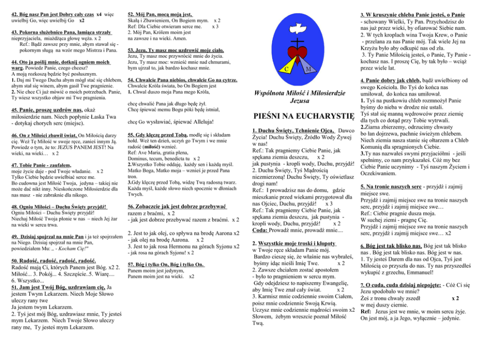 42. Bóg nasz Pan jest Dobry cały czas x4 więc uwielbij Go, więc uwielbij Go x2 43. Pokorna służebnico Pana, łamiąca strzały nieprzyjaciela, miażdżąca głowę węża. x 2 Ref.: Bądź zawsze przy mnie, abym stawał się pokornym sługą na wzór mego Mistrza i Pana. 44. Oto ja poślij mnie, dotknij ogniem moich warg. Powiedz Panie, czego chcesz? A moją rozkoszą będzie być posłusznym. 1. Daj mi Twego Ducha abym mógł stać się chlebem, abym stał się winem, abym gasił Twe pragnienie. 2. Nie chce Ci już mówić o moich potrzebach. Panie, Ty wiesz wszystko objaw mi Twe pragnienia. 52. Mój Pan, mocą moją jest, Skałą i Zbawieniem, On Bogiem mym. x 2 Ref: Dla Ciebie otwieram serce me. x3 2. Mój Pan, Królem moim jest na zawsze i na wieki. Amen. 54. Chwalcie Pana niebios, chwalcie Go na cytrze. Chwalcie Króla świata, bo On Bogiem jest 1. Chwal duszo moja Pana mego Króla, chcę chwalić Pana jak długo będę żył. Chcę śpiewać memu Bogu póki będę istniał, miłosierdzie nam. Niech popłynie Łaska Twa - dotykaj chorych serc (miejsc). chcę Go wysławiać, śpiewać Alleluja! 47. Tobie Panie - zaufałem, moje życie daje - pod Twoje władanie. x 2 Tylko Ciebie będzie uwielbiać serce me. Bo cudowna jest Miłość Twoja, jedyna – takiej nie może dać nikt inny. Nieskończone Miłosierdzie dla nas masz - nie zabraknie dla nikogo. 48. Ogniu Miłości – Duchu Święty przyjdź! Ogniu Miłości – Duchu Święty przyjdź! Niechaj Miłość Twoja płonie w nas – niech Jej żar na wieki w sercu trwa. 55. Gdy klęczę przed Tobą, modlę się i składam hołd. Weź ten dzień, uczyń go Twym i we mnie radość (miłość) wznieć. Ref: Ave Maria, gratia plena, Dominus, tecum, benedicta tu x 2 2.Wszystko Tobie oddaję, każdy sen i każdą myśl. Matko Boga, Matko moja – wznieś je przed Pana tron. 3.Gdy klęczę przed Tobą, widzę Twą radosną twarz. Każda myśl, każde słowo niech spocznie w dłoniach Twych. 56. Zobaczcie jak jest dobrze przebywać razem z braćmi, x 2 - jak jest dobrze przebywać razem z braćmi. x 2 2. Jest to jak olej, co spływa na brodę Aarona x2 49. Dzisiaj spojrzał na mnie Pan i ja też spojrzałem - jak olej na brodę Aarona. x 2 na Niego. Dzisiaj spojrzał na mnie Pan, 3. Jest to jak rosa Hermonu na górach Syjonu x2 powiedziałem Mu: ,, - Kocham Cię!'' - jak rosa na górach Syjonu! x 2 50. Radość, radość, radość, radość. Radość mają Ci, których Panem jest Bóg. x2 2. Miłość... 3. Pokój... 4. Szczęście..5. Wiarę.... 6. Wszystko... 51. Jam jest Twój Bóg, uzdrawiam cię, Ja jestem Twym Lekarzem. Niech Moje Słowo uleczy rany twe Ja jestem twym Lekarzem. 2. Tyś jest mój Bóg, uzdrawiasz mnie, Ty jesteś mym Lekarzem. Niech Twoje Słowo uleczy rany me, Ty jesteś mym Lekarzem. - schowany Wielki, Ty Pan. Przychodzisz do nas już przez wieki, by ofiarować Siebie nam. 2. W tych kroplach wina Twoja Krew, o Panie - przelana za nas Panie mój. Tak wiele Jej na Krzyżu było aby odkupić nas od zła. 3. Ty Panie Miłością jesteś, o Panie, Ty Panie kochasz nas. I proszę Cię, by tak było – wciąż przez wiele lat. 53. Jezu, Ty masz moc uzdrowić moje ciało. Jezu, Ty masz moc przywrócić mnie do życia. Jezu, Ty masz moc: wznieść mnie nad chmurami, bym ujrzał to, jak bardzo kochasz mnie. 45. Panie, proszę uzdrów nas, okaż 46. On z Miłości zbawił świat, On Miłością darzy cię. Weź Tę Miłość w swoje ręce, zanieś innym Ją. Powiedz o tym, że to: JEZUS PANEM JEST! Na wieki, na wieki… x 2 3. W kruszynie chleba Panie jesteś, o Panie 57. Bóg i tylko On, Bóg i tylko On. Panem moim jest jedynym, Panem moim jest na wieki. x2 4. Panie dobry jak chleb, bądź uwielbiony od Wspólnota Miłość i Miłosierdzie Jezusa PIEŚNI NA EUCHARYSTIĘ 1. Duchu Święty, Tchnienie Ojca, Dawco Życia! Duchu Święty, Źródło Wody Żywej w nas! Ref.: Tak pragniemy Ciebie Panie, jak spękana ziemia deszczu, x2 jak pustynia - kropli wody, Duchu, przyjdź! 2. Duchu Święty, Tyś Mądrością niezmierzoną! Duchu Święty, Ty oświetlasz drogi nam! Ref.: I prowadzisz nas do domu, gdzie mieszkanie przed wiekami przygotował dla nas Ojciec, Duchu, przyjdź! x3 Ref.: Tak pragniemy Ciebie Panie, jak spękana ziemia deszczu, jak pustynia kropli wody, Duchu, przyjdź! x2 Coda: Prowadź mnie, prowadź mnie.... 2. Wszystkie moje troski i kłopoty w Twoje ręce składam Panie mój. Bardzo cieszę się, że właśnie nas wybrałeś, byśmy idąc nieśli Imię Twe. x2 2. Zawsze chciałem zostać apostołem - było to pragnieniem w sercu mym. Gdy odejdziesz to napiszemy Ewangelię, aby Imię Twe znał cały świat. x2 3. Karmisz mnie codziennie swoim Ciałem, poisz mnie codziennie Swoją Krwią. Uczysz mnie codziennie mądrości swoim x2 Słowem, żebym wreszcie poznał Miłość Twą. swego Kościoła. Bo Tyś do końca nas umiłował, do końca nas umiłował. 1. Tyś na pustkowiu chleb rozmnożył Panie byśmy do nieba w drodze nie ustali. Tyś stał się manną wędrowców przez ziemię dla tych co dotąd przy Tobie wytrwali. 2.Ziarna zbierzemy, odrzucimy chwasty bo łan dojrzewa, pachnie świeżym chlebem. Niech ziemia nasza stanie się ołtarzem a Chleb Komunią dla spragnionych Ciebie. 3.Ty nas nazwałeś swymi przyjaciółmi - jeśli spełnimy, co nam przykazałeś. Cóż my bez Ciebie Panie uczynimy - Tyś naszym Życiem i Oczekiwaniem. 5. Na tronie naszych serc - przyjdź i zajmij miejsce swe. Przyjdź i zajmij miejsce swe na tronie naszych serc, przyjdź i zajmij miejsce swe… Ref.: Ciebie pragnie dusza moja. W suchej ziemi - pragnę Cię. Przyjdź i zajmij miejsce swe na tronie naszych serc, przyjdź i zajmij miejsce swe… x2 6. Bóg jest tak blisko nas, Bóg jest tak blisko nas . Bóg jest tak blisko nas. Bóg jest w nas. 1. Ty jesteś Darem dla nas od Ojca, Tyś jest Miłością co przyszła do nas. Ty nas przyszedłeś wykupić z grzechu, Emmanuel! 7. O cuda, cuda dzisiaj niepojęte: - Cóż Ci się 