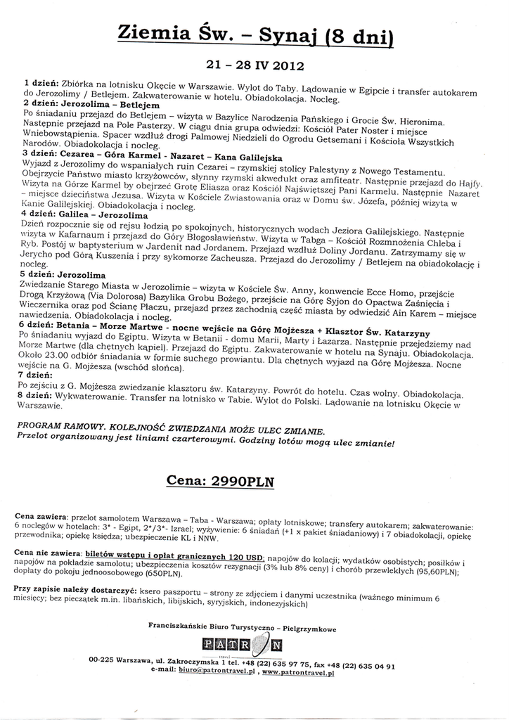 Z i e m i a Sw. - S y n a j (8 dni) 21 - 28 IV 2 0 1 2 1 d z i e n : Z b i o r k a na l o t n i s k u Okecie vv Warszawie. Wylot do Taby. Ladowanie w Egipcie i transfer a u t o k a r e m do Jerozolimy / Betlejem. Zakwaterovvanie w h o t e l u . Obiadokolacja. Nocleg. 2 dzien: Jerozolima - Betlejem Po s n i a d a n i u przejazd do Betlejem - w i z y t a w Bazylice Narodzenia Panskiego i Grocie Sw. H i e r o n i m a . Nastepnie przejazd n a Pole Pasterzy. W ciagu d n i a g r u p a odwiedzi: Kosciol Pater Noster i miejsce Wniebowstapienia. Spacer w z d l u z d r o g i Palmowej Niedzieli do O g r o d u G e t s e m a n i i Kosciola Wszystkich Narodow. Obiadokolacja i nocleg. 3 d z i e n : C e z a r e a - Gora K a r m e l - Nazaret - K a n a G a l i l e j s k a Wyjazd z Jerozolimy do w s p a n i a l y c h r u i n Cezarei - rzymskiej stolicy Palestyny z Nowego T e s t a m e n t u . Obejrzycie Paristwo m i a s t o krzyzowcow, s l y n n y r z y m s k i a k w e d u k t oraz a m f i t e a t r . Nastepnie przejazd do Hajfy. Wizyta n a Gorze K a r m e l by obejrzec Grote Eliasza oraz Kosciol Najswietszej Pani K a r m e l u . Nastepnie Nazaret - miejsce dzieciristwa Jezusa. W i z y t a w Kosciele Zwiastowania oraz w D o m u sw. Jozefa, pozniej wizyta w Kanie Galilejskiej. Obiadokolacja i nocleg. 4 dzien: Galilea - J e r o z o l i m a Dzieri rozpocznie sie od rejsu l o d z i a po spokojnj'ch, h i s t o r y c z n y c h w o d a c h Je z iora Galilejskiego. Nastepnie wizyta w K a f a r n a u m i przejazd do Gory Blogoslawieiistw. Wizyta w Tabga - Kosciol Rozmnozenia Chleba i Ryb. Postoj w b a p t y s t e r i u m w J a r d e n i t n a d J o r d a n e m . Przejazd w z d l u z D o l i n y J o r d a n u . Z a t r z y m a m y sie w Jerycho pod Gora K u s z e n i a i przy sykomorze Zacheusza. Przejazd do J e r o z o l i m y / Betlejem n a obiadokolacje i nocleg. 5 dzien: J e r o z o l i m a Zwiedzanie Starego M i a s t a w J e r o z o l i m i e - wizyta w Kosciele Sw. A n n y , k o n w e n c i e Ecce H o m o , przejscie Droga. Krzyzowa. (Via Dolorosa) B a z y l i k a G r o b u Bozego, przejscie n a Gore Syjon do O p a c t w a Zasniecia i Wieczernika oraz pod Sciane Placzu, przejazd przez zachodnia. CZQSC m i a s t a by odwiedzic A i n Karem - miejsce nawiedzenia. Obiadokolacja i nocleg. 6 dzien: B e t a n i a - Morze Martwe - n o c n e wejscie na Gore Mojzesza + K l a s z t o r Sw. K a t a r z y n y Po s n i a d a n i u wyjazd do E g i p t u . W i z y t a w B e t a n i i - d o m u M a r i i , M a r t y i Lazarza. Nastepnie przejedziemy n a d Morze Martwe (dla c h e t n y c h kapiel). Przejazd do E g i p t u . Z a k w a t e r o w a n i e w h o t e l u n a S y n a j u . Obiadokolacja. Okoio 23.00 odbior s n i a d a n i a w f o r m i e suchego p r o w i a n t u . Dla c h e t n y c h wyjazd n a Gore Mojzesza. Nocne wejscie n a G. Mojzesza (wschod sloiica). 7 dzien: Po zejsciu z G. Mojzesza zwiedzanie k l a s z t o r u sw. Katarzyny. Powrot do h o t e l u . Czas w o l n y . Obiadokolacja. 8 dzien: Wykwaterowanie. T r a n s f e r n a l o t n i s k o w Tabie. Wylot do Polski. L a d o w a n i e n a l o t n i s k u Okecie w Warszawie. PROGRAM RAMOWY. Przelot organizowany KOLEJNO&C jest liniami ZWIEDZANIA czarterowymi. MOZE ULEC ZMIANIE. Godziny lotow mogq ulec zmianie! Cena: 2990PLN Cena zawiera: przelot s a m o l o t e m W a r s z a w a - T a b a - Warszawa; o p l a t y l o t n i s k o w e ; t r a n s f e r y a u t o k a r e m ; zakwaterowanie: 6 noclegow w h o t e l a c h : 3* - Egipt, 2 * / 3 * - Izrael; wyzywienie: 6 s n i a d a r i (+1 x p a k i e t s n i a d a n i o w y ) i 7 obiadokolacji, opieke przewodnika; opieke ksiedza; u b e z p i e c z e n i e KL i NNW. Cena nie zawiera: biletow wstepu i oplat granicznych 120 USD: napojow do kolacji; v ^ d a t k o w osobistych; posilkow i napojow n a pokladzie s a m o l o t u ; u b e z p i e c z e n i a kosztow rez^'gnacji (3% l u b 8 % ceny) i c h o r o b p r z e w l e k l y c h (95,60PLN); doplaty do p o k o j u jednoosobowego (650PLN). Przy zapisie nalezy dostarczyc: k s e r o p a s z p o r t u - s t r o n y ze zdjeciem i d a n y m i u c z e s t n i k a (waznego m i n i m u m 6 miesiecy; bez piecz^tek m . i n . l i b a i i s k i c h , l i b i j s k i c h , S } i y j s k i c h , indonezyjskich) r F r a n c i s z k a n s k i e Biuro T u r y s t y c z n o - Pielgrzymkowe 0 0 - 2 2 5 W a r s z a w a , u l . Z a k r o c z y m s k a 1 t e l . +48 (22) 6 3 5 9 7 7 5 , fax +48 (22) 6 3 5 0 4 9 1 e - m a i l : biurofejpatrontravel.pl , w w w . p a t r o n t r a v e l . p l