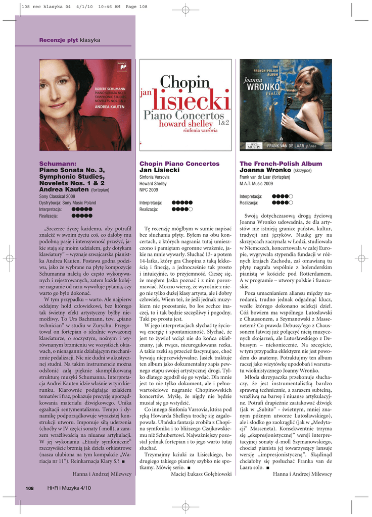 108 rec klasyka 04 4/1/10 10:46 AM Page 108 Recenzje p∏yt klasyka Schumann: Piano Sonata No. 3, Symphonic Studies, Novelets Nos. 1 & 2 Andrea Kauten (fortepian) Sony Classical 2009 Dystrybucja: Sony Music Poland Interpretacja: ≤≤≤≤≤ Realizacja: ≤≤≤≤≤ „Szczerze ˝ycz´ ka˝demu, aby potrafi∏ znaleêç w swoim ˝yciu coÊ, co da∏oby mu podobnà pasj´ i intensywnoÊç prze˝yç, jakie stajà si´ moim udzia∏em, gdy dotykam klawiatury” – wyznaje szwajcarska pianistka Andrea Kauten. Postawa godna podziwu, jako ˝e wybrane na p∏yt´ kompozycje Schumanna nale˝à do cz´sto wykonywanych i rejestrowanych, zatem ka˝de kolejne nagranie od razu wywo∏uje pytania, czy warto go by∏o dokonaç. W tym przypadku – warto. Ale najpierw oddajmy ho∏d cz∏owiekowi, bez którego tak Êwietny efekt artystyczny by∏by niemo˝liwy. To Urs Bachmann, tzw. „piano technician” w studiu w Zurychu. Przygotowa∏ on fortepian o idealnie wywa˝onej klawiaturze, o soczystym, noÊnym i wyrównanym brzmieniu we wszystkich oktawach, o nienagannie dzia∏ajàcym mechanizmie pedalizacji. Nic nie dudni w akustycznej studni. Na takim instrumencie mo˝na ods∏oniç ca∏à pi´knie skomplikowanà struktur´ muzyki Schumanna. Interpretacja Andrei Kauten idzie w∏aÊnie w tym kierunku. Klarownie podà˝ajàc szlakiem tematów i fraz, pokazuje precyzj´ uporzàdkowania materia∏u dêwi´kowego. Unika egzaltacji sentymentalizmu. Tempo i dynamik´ podporzàdkowuje wyrazistej konstrukcji utworu. Imponuje si∏à uderzenia (choçby w IV cz´Êci sonaty f-moll), a zarazem wra˝liwoÊcià na niuanse artykulacji. W jej wykonaniu „Etiudy symfoniczne” rzeczywiÊcie brzmià jak dzie∏a orkiestrowe (nasza ulubiona na tym kompakcie „Wariacja nr 11”). Reinkarnacja Klary S.? ≤ Hanna i Andrzej Milewscy 108 Hi•Fi i Muzyka 4/10 Chopin Piano Concertos Jan Lisiecki The French-Polish Album Joanna Wronko (skrzypce) Sinfonia Varsovia Howard Shelley NIFC 2009 Frank van de Laar (fortepian) M.A.T. Music 2009 Interpretacja: Realizacja: ≤≤≤≤≤ ≤≤≤≤≥ T´ recenzj´ móg∏bym w sumie napisaç bez s∏uchania p∏yty. By∏em na obu koncertach, z których nagrania tutaj umieszczono i pami´tam ogromne wra˝enie, jakie na mnie wywar∏y. S∏uchaç 13- a potem 14-latka, który gra Chopina z takà lekkoÊcià i finezjà, a jednoczeÊnie tak prosto i intuicyjnie, to przyjemnoÊç. Ciesz´ si´, ˝e mog∏em JaÊka poznaç i z nim porozmawiaç. Mocno wierz´, ˝e wyroÊnie z niego nie tylko du˝ej klasy artysta, ale i dobry cz∏owiek. Wiem te˝, ˝e jeÊli jednak muzykiem nie pozostanie, bo los zechce inaczej, to i tak b´dzie szcz´Êliwy i pogodny. Taki po prostu jest. W jego interpretacjach s∏ychaç t´ ˝yciowà energi´ i spontanicznoÊç. S∏ychaç, ˝e jest to ˝ywio∏ wcià˝ nie do koƒca okie∏znany, jak rwàca, nieuregulowana rzeka. A takie rzeki sà przecie˝ fascynujàce, choç bywajà nieprzewidywalne. Jasiek traktuje ten album jako dokumentalny zapis pewnego etapu swojej artystycznej drogi. Tylko dlatego zgodzi∏ si´ go wydaç. Dla mnie jest to nie tylko dokument, ale i pe∏nowartoÊciowe nagranie Chopinowskich koncertów. MyÊl´, ˝e nigdy nie b´dzie musia∏ si´ go wstydziç. Co innego Sinfonia Varsovia, która pod r´kà Howarda Shelleya troch´ si´ zagalopowa∏a. U∏aƒska fantazja zrobi∏a z Chopina symfonika i to bli˝szego Czajkowskiemu ni˝ Schubertowi. Najwa˝niejszy pozosta∏ jednak fortepian i to jego warto tutaj s∏uchaç. Trzymajmy kciuki za Lisieckiego, bo drugiego takiego pianisty szybko nie spotkamy. Mówi´ serio. ≤ Maciej ¸ukasz Go∏´biowski Interpretacja: Realizacja: ≤≤≤≤≥ ≤≤≤≤≥ Swojà dotychczasowà drogà ˝yciowà Joanna Wronko udowadnia, ˝e dla artystów nie istniejà granice paƒstw, kultur, tradycji ani j´zyków. Nauk´ gry na skrzypcach zaczyna∏a w ¸odzi, studiowa∏a w Niemczech, koncertowa∏a w ca∏ej Europie, wygrywa∏a stypendia fundacji w ró˝nych krajach Zachodu, zaÊ omawianà tu p∏yt´ nagra∏a wspólnie z holenderskim pianistà w koÊciele pod Rotterdamem. A w programie – utwory polskie i francuskie. Poza umacnianiem aliansu mi´dzy narodami, trudno jednak odgadnàç klucz, wedle którego dokonano selekcji dzie∏. Có˝ bowiem ma wspólnego Lutos∏awski z Chaussonem, a Szymanowski z Massenetem? Co prawda Debussy’ego z Chaussonem ∏atwiej ju˝ po∏àczyç nicià muzycznych skojarzeƒ, ale Lutos∏awskiego z Debussym – niekoniecznie. Na szcz´Êcie, w tym przypadku eklektyzm nie jest powodem do anatemy. Potraktujmy ten album raczej jako wizytówk´ upodobaƒ i warsztatu wiolinistycznego Joanny Wronko. M∏oda skrzypaczka przekonuje s∏uchaczy, ˝e jest instrumentalistkà bardzo sprawnà technicznie, a zarazem subtelnà, wra˝liwà na barw´ i niuanse artykulacyjne. Potrafi drapie˝nie zaatakowaç dêwi´k (jak w „Subito” - Êwietnym, mniej znanym póênym utworze Lutos∏awskiego), ale i s∏odko go zaokràgliç (jak w „Medytacji” Masseneta). Konsekwentnie trzyma si´ „ekspresjonistycznej” wersji interpretacyjnej sonaty d-moll Szymanowskiego, chocia˝ pianista jej towarzyszàcy lansuje wersj´ „impresjonistycznà”. Skàdinàd chcia∏oby si´ pos∏uchaç Franka van de Laara solo. ≤ Hanna i Andrzej Milewscy