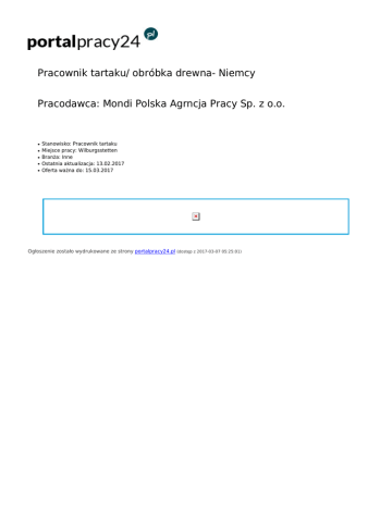 Pracownik tartaku/ obróbka drewna- Niemcy Pracodawca: Mondi Polska Agrncja Pracy Sp. z o.o. ● ● ● ● ● Stanowisko: Pracownik tartaku Miejsce pracy: Wilburgsstetten Branża: Inne Ostatnia aktualizacja: 13.02.2017 Oferta ważna do: 15.03.2017 Ogłoszenie zostało wydrukowane ze strony portalpracy24.pl (dostęp z 2017-03-07 05:25:01)