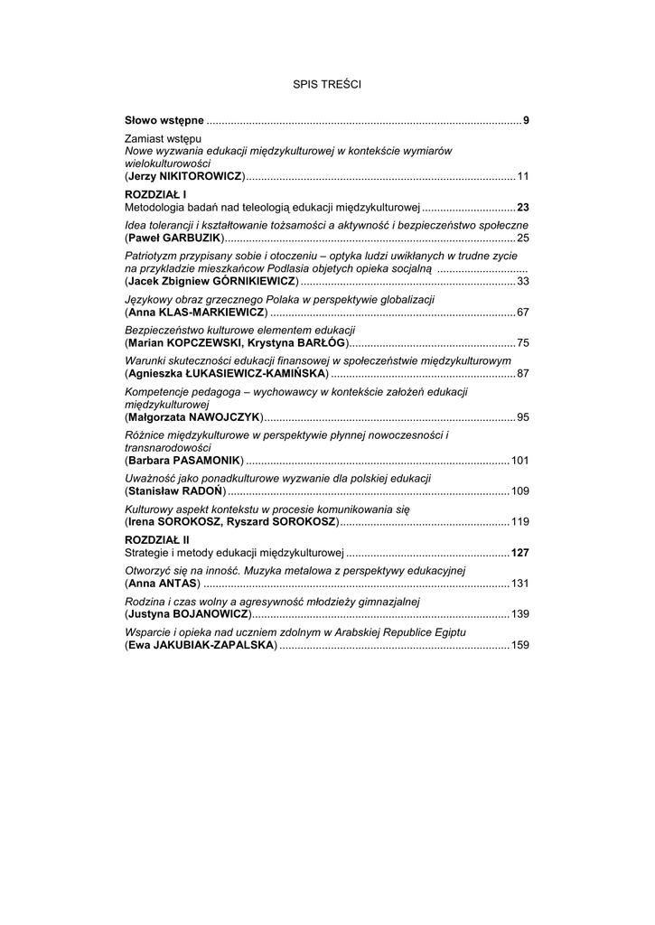 SPIS TREŚCI Słowo wstępne ........................................................................................................ 9 Zamiast wstępu Nowe wyzwania edukacji międzykulturowej w kontekście wymiarów wielokulturowości (Jerzy NIKITOROWICZ) ......................................................................................... 11 ROZDZIAŁ I Metodologia badań nad teleologią edukacji międzykulturowej ............................... 23 Idea tolerancji i kształtowanie tożsamości a aktywność i bezpieczeństwo społeczne (Paweł GARBUZIK) ................................................................................................ 25 Patriotyzm przypisany sobie i otoczeniu – optyka ludzi uwikłanych w trudne zycie na przykladzie mieszkańcow Podlasia objetych opieka socjalną .............................. (Jacek Zbigniew GÓRNIKIEWICZ) ....................................................................... 33 Językowy obraz grzecznego Polaka w perspektywie globalizacji (Anna KLAS-MARKIEWICZ) ................................................................................. 67 Bezpieczeństwo kulturowe elementem edukacji (Marian KOPCZEWSKI, Krystyna BARŁÓG)....................................................... 75 Warunki skuteczności edukacji finansowej w społeczeństwie międzykulturowym (Agnieszka ŁUKASIEWICZ-KAMIŃSKA) ............................................................. 87 Kompetencje pedagoga – wychowawcy w kontekście założeń edukacji międzykulturowej (Małgorzata NAWOJCZYK) ................................................................................... 95 Różnice międzykulturowe w perspektywie płynnej nowoczesności i transnarodowości (Barbara PASAMONIK) ....................................................................................... 101 Uważność jako ponadkulturowe wyzwanie dla polskiej edukacji (Stanisław RADOŃ) ............................................................................................. 109 Kulturowy aspekt kontekstu w procesie komunikowania się (Irena SOROKOSZ, Ryszard SOROKOSZ) ........................................................ 119 ROZDZIAŁ II Strategie i metody edukacji międzykulturowej ...................................................... 127 Otworzyć się na inność. Muzyka metalowa z perspektywy edukacyjnej (Anna ANTAS) ..................................................................................................... 131 Rodzina i czas wolny a agresywność młodzieży gimnazjalnej (Justyna BOJANOWICZ)..................................................................................... 139 Wsparcie i opieka nad uczniem zdolnym w Arabskiej Republice Egiptu (Ewa JAKUBIAK-ZAPALSKA) ............................................................................ 159 Starotestamentalny tekst jako dydaktyczne dyskursy tożsamości w kontekście wielokulturowym (Renata JASNOS) ................................................................................................ 195 Ocena wiedzy kobiet na temat czynników ryzyka i profilaktyki osteoporozy (Izabela KORABIEWSKA, Monika LEWANDOWSKA, Monika POLAK, Dariusz BIAŁOSZEWSKI) ................................................................................................. 207 Kultura czasu wolnego studentów pedagogiki (Krzysztof KRUSZKO). ........................................................................................ 223 Edukacja teatralna a edukacja międzykulturowa wspólnym obszarem działań w globalizującym się świecie (Dariusz POLESZAK) .......................................................................................... 237 Rodzina polska na emigracji w wielokulturowym społeczeństwie świata – aspekt aksjologiczny (Ryszard SKRZYPNIAK) ..................................................................................... 251 Rozwój edukacji i oświaty rolniczej w Polsce - ujęcie historyczne (Nina STĘPNICKA) .............................................................................................. 265 ROZDZIAŁ III Media w procesie edukacji międzykulturowej ....................................................... 273 Potrzeba tolerancji w środowiskach multikulturowych - bajkoterapia jako metoda wspierająca (Dorota BEŁTKIEWICZ)....................................................................................... 275 Mentoring rówieśniczy w edukacji międzykulturowej (Agata BUTAREWICZ)......................................................................................... 285 Zadania współczesnej edukacji w dobie dynamicznego rozwoju cyberprzestrzeni (Sławomir ISKIERKA, Janusz KRZEMIŃSKI, Zbigniew WEŻGOWIEC) .......... 295 Wielokulturowość wczesnej edukacji medialnej w dobie globalizacji (Joanna JUSZCZYK-RYGAŁŁO) ........................................................................ 303 Założenia i realizacje edukacji międzykulturowej w polskim systemie oświaty (Marian KOPCZEWSKI, Lidia PAWELEC) ......................................................... 311 Medycyna niekonwencjonalna czy metody wspomagające leczenia? (Janina KSIĄŻEK) ................................................................................................ 323 Technologie mobilne w edukacji – zastosowanie telefonii komórkowej (Paweł MATUSZCZYK) ........................................................................................ 329 Zastosowania edukacyjne machinimy oraz blogów (Urszula ŚWIERCZYŃSKA-KACZOR) ................................................................ 337 Riziká extrémneho relativizmu v prostredí multikulturality a výzvy pre výchovu (Katarína VANČÍKOVÁ) ....................................................................................... 347 ROZDZIAŁ IV Edukacja międzykulturowa a problemy międzynarodowe .................................... 357 Edukacja międzykulturowa w programach Leonardo Da Vinci (Edyta BOCHNIA) ..................................................