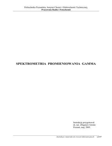 Politechnika Poznańska, Instytut Chemii i Elektrochemii Technicznej, Pracownia Radio i Fotochemii SPEKTROMETRIA PROMIENIOWANIA GAMMA Instrukcję przygotował: dr, inż. Zbigniew Górski Poznań, maj, 2005. Instrukcje i materiały do ćwiczeń laboratoryjnych s.1/17 Politechnika Poznańska, Instytut Chemii i Elektrochemii Technicznej, Pracownia Radio i Fotochemii ` 1. Podstawy teoretyczne. Promieniowanie gama jest promieniowaniem elektromagnetycznym emitowanym przez wzbudzone jądra atomowe przy przejściu z wyższego do niższego stanu energetycznego. Promieniowanie to często towarzyszy (jest efektem wtórnym) przemianom jądrowym (α, β , β+, ...). Promieniowanie to jest promieniowaniem charakterystycznym, to znaczy że jego widmo energetyczne ma naturę dyskretną, ściśle zależną od rodzaju zmian energetycznych zachodzących w jądrze. Aby rozważyć procesy jądrowe zachodzące w jądrze wygodnie jest posłużyć się grafami ilustrującymi zmiany rozmieszczenia nukleonów w studniach potencjału jądrowego według modelu budowy jądra (np. zdegenerowanego gazu Fermiego). Jeżeli dyskusji poddamy przemiany w jądrze posiadającym nadmiar liczby protonów nad liczbą neutronów to przykładowy graf rozmieszczenia nukleonów może wyglądać jak przedstawiony na rysunku 1. Obszar jądra E l Studnia potencjału dla protonów l Studnia potencjału dla neutronów Rys. 1. Schemat rozmieszczenia protonów i neutronów w jądrze atomu posiadającego nadmiar liczby protonów w stosunku do liczby neutronów Instrukcje i materiały do ćwiczeń laboratoryjnych s.2/17 Politechnika Poznańska, Instytut Chemii i Elektrochemii Technicznej, Pracownia Radio i Fotochemii ` Jądro o takim rozmieszczeniu nukleonów powinno ulegać przemianie β+ Zrównoważenie enegretyczne będzie procesem wieloetapowym. W pierwszym etapie (Rys.2), proton ulegnie zmianie w neutron i zostanie umieszczony na równoważnym poziomie energetycznym w studni potencjału jądrowego neutronów (przemianę tą ilustruje niebieska strzałka). Obszar jądra E γ e+ e- γ l Studnia potencjału dla protonów ∆E1=hν1 l Studnia potencjału dla neutronów Rys. 2. Schemat ilustrujący przesunięcia nukleonów pomiędzy studniami potencjału jądrowego w jądrze, emisji cząstki β+ i anihilacji. Etap pierwszy dochodzenia do równowagi energetycznej jądra. Efektem tej przemiany jest powstanie i wyrzucenie poza obszar jądra cząstki e+ (β+), która ulega anihilacji w reakcji z elektronem z powłok elektronowych atomu. Powstaną tu dwa kwanty promieniowania γ (anihilacyjnego). Promieniowanie to nie powstaje w jądrze i jako takie nie będzie poddawane dalszej dyskusji. Ponieważ neutron znajduje się na wysokim poziomie energetycznym, a w przedstawionym na schemacie jądrze znajdują się nie obsadzone poziomy energetyczne o niższej energii, neutron ten obsadzi najniższy dostępny poziom pozbywając się Instrukcje i materiały do ćwiczeń laboratoryjnych s.3/17 Politechnika Poznańska, Instytut Chemii i Elektrochemii Technicznej, Pracownia Radio i Fotochemii ` nadmiaru energii (∆E1) w postaci kwantu promieniowania γ1. Po zakończeniu procesów zachodzących w pierwszym etapie dochodzenia do równowagi energetycznej jądra nukleony będą rozmieszczone w nim jak na rysunku 3. Obszar jądra E l Studnia potencjału dla protonów l Studnia potencjału dla neutronów Rys. 3. Schemat rozmieszczenia protonów i neutronów w jądrze atomu po przejściu pierwszego nadmiarowego protonu ze studni protonów do studni neutronów i wyemitowaniu pierwszego kwantu promieniowania γ Jeżeli w studni potencjału dla neutronów istnieje wolny (nie obsadzony) poziom energetyczny o energii niższej niż energia protonów o najwyższych energiach znajdujących się w studni potencjału dla protonów będziemy obserwowali kolejne etapy dochodzenia do równowagi energetycznej, przez emisję kolejnych cząstek β+ i emisję kolejnych kwantów γ (rys 4-7). Zaprezentowany sposób analizy przemian zachodzących w jądrze (niebieskie opisy i strzałki) i związanych z nimi procesów zachodzących poza jądrem (na powłokach elektronowych atomu) jest sposobem uproszczonym (wynikające z zastosowania stosunkowo prostego modelu budowy jądra), nie pokazującym pełni zjawisk i przemian zachodzących w obiektach rzeczywistych, pozwala jednak na wyjaśnienie mechanizmu emisji promieniowania γ i jego Instrukcje i materiały do ćwiczeń laboratoryjnych s.4/17 Politechnika Poznańska, Instytut Chemii i Elektrochemii Technicznej, Pracownia Radio i Fotochemii ` energii. Wybrany do analizy przypadek jądra ulegającego rozpadowi β+ został wybrany celowo by pokazać inny charakter, wynikający z innego miejsca generacji w przestrzeni i innego mechanizmu powstawania promieniowania γjądrowego (o energiach ∆E1, ∆E2, ∆E3) i promieniowania γanihilacyjnego. Obszar jądra E γ e+ e- γ l Studnia potencjału dla protonów ∆E2=hν2 l Studnia potencjału dla neutronów Rys. 4. Schemat ilustrujący przesunięcia nukleonów pomiędzy studniami potencjału jądrowego w jądrze, emisji cząstki β+ i anihilacji. Etap drugi dochodzenia do równowagi energetycznej jądra. Instrukcje i materiały do ćwiczeń laboratoryjnych s.5/17 Politechnika Poznańska, Instytut Chemii i Elektrochemii Technicznej, Pracownia Radio i Fotochemii ` Obszar jądra E l Studnia potencjału dla protonów l Studnia potencjału dla neutronów Rys. 5. Schemat rozmieszczenia protonów i neutronów w jądrze atomu po przejściu drugiego nadmiarowego protonu ze studni protonów do studni neutronów i wyemitowaniu drugiego kwantu promieniowania γ Instrukcje i materiały do ćwiczeń laboratoryjnych s.6/17 Politechnika Poznańska, Instytut Chemii i Elektrochemii Technicznej, Pracownia Radio i Fotochemii ` Obszar jądra E γ e+ e- γ l Studnia potencjału dla protonów ∆E3=hν3 l Studnia potencjału dla neutronów Rys. 6. Schemat ilustrujący przesunięcia nukleonów pomiędzy studniami p