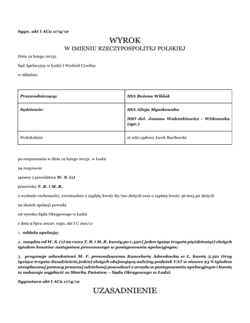 Sygn. akt I ACa 1174/12 WYROK W IMIENIU RZECZYPOSPOLITEJ POLSKIEJ Dnia 19 lutego 2013r. Sąd Apelacyjny w Łodzi I Wydział Cywilny w składzie: Przewodniczący: SSA Bożena Wiklak Sędziowie: SSA Alicja Myszkowska SSO del. Joanna Walentkiewicz - Witkowska (spr.) Protokolant: st.sekr.sądowy Jacek Raciborski po rozpoznaniu w dniu 19 lutego 2013r. w Łodzi na rozprawie sprawy z powództwa W. S. (1) przeciwko T. R. i M. R. o wydanie ruchomości, ewentualnie o zapłatę kwoty 85.790 złotych oraz o zapłatę kwoty 36.603,30 złotych na skutek apelacji powoda od wyroku Sądu Okręgowego w Łodzi z dnia 9 lipca 2012r. sygn. akt I C 290/11 1. oddala apelację; 2. zasądza od W. S. (1) na rzecz T. R. i M. R. kwoty po 1.350 ( jeden tysiąc trzysta pięćdziesiąt) złotych tytułem kosztów zastępstwa procesowego w postępowaniu apelacyjnym; 3. przyznaje adwokatowi M. F. prowadzącemu Kancelarię Adwokacką w Ł. kwotę 3.321 (trzy tysiące trzysta dwadzieścia jeden) złotych obejmującą należny podatek VAT w stawce 23 % tytułem nieopłaconej pomocy prawnej udzielonej powodowi z urzędu w postępowaniu apelacyjnym i kwotę te nakazuje wypłacić ze Skarbu Państwa – Sądu Okręgowego w Łodzi. Sygnatura akt I ACa 1174/12 UZASADNIENIE Sąd Okręgowy w Łodzi wyrokiem wydanym w dniu 9 lipca 2012 r. w sprawie oznaczonej sygnaturą akt I C 290/11 oddalił powództwo W. S. (1) przeciwko T. R. i M. R. o wydanie ruchomości lub zapłatę kwoty 85.790 złotych, o zapłatę kwoty 36.603,30 zł. oraz nakazał wypłacić od Skarbu Państwa – Sądu Okręgowego w Łodzi na rzecz adwokata M. F. kwotę 4.428 zł tytułem kosztów pomocy prawnej udzielonej powodowi z urzędu (wyrok k. 345). Powyższe rozstrzygniecie zapadło w oparciu o następujące najistotniejsze ustalenia faktyczne Sądu I instancji : Lokal mieszkalny położony w K. przy ul. (...) należał do rodziców pozwanej T. R. - S. i W. S. (2). Po śmierci ojca pozwanej w dniu (...)roku mieszkanie było niezamieszkałe, gdyż matka pozwanej przebywała w domu pomocy społecznej. Z tego względu pozwana, która na stałe zamieszkuje w Kuwejcie, chciała mieszkanie sprzedać. Poprosiła zamieszkałą w K. znajomą W. M., aby zamieściła w prasie ogłoszenie z ofertą sprzedaży mieszkania oraz pokazywała je potencjalnym kupcom. Na ogłoszenie, pod koniec 2006 roku odpowiedział powód, który po obejrzeniu mieszkania wyraził zamiar jego nabycia. W. M. oznajmiła powodowi, że wstępnie wskazywana cena mieszkania wynosi 90.000 złotych oraz że właścicielka przebywa za granicą. Dała mu także numer telefonu do syna pozwanej M. R., który zamieszkuje w W.. Powód spotkał się M. R. i przekazał mu 10.000 złotych na poczet ceny mieszkania. W tym samym dniu pozwany wręczył powodowi klucze do mieszkania. Powód i pozwany w biurze J. K. (1) podpisali oświadczenie, w którym pozwany potwierdził przyjęcie 10.000 zł na poczet ceny mieszkania, którą ustalono na kwotę 85.000 zł. Do ceny tej strony wliczyły meble i sprzęt w postaci pralki – 300zł, kuchni gazowej 300 zł, 2 wersalek – 600 zł i regału 500 zł. Na wypadek niezawarcia umowy przez kupującego wręczona kwota miała przepaść, a przy rezygnacji przez sprzedającego miała być zwrócona w podwójnej wysokości . Pozwana wróciła do Polski na początku 2007 r. i telefonicznie poinformowała powoda, że mieszkanie stanowiło własność jej rodziców oraz że pozostają do uregulowania kwestie formalne. Oświadczyła też, że syn działał bez porozumienia z nią co do wysokości ceny sprzedaży, co powoduje wadę prawną dokumentu z grudnia. Wyraziła jednak chęć kontynuowania rozmów na temat sprzedaży mieszkania . Dnia 2 lutego 2007 r. pozwana złożyła w Sądzie Rejonowym w Kutnie wniosek o stwierdzenie nabycia spadku pod swoim ojcu zmarłym (...)r. W dniu 28 marca 2007 r. wydane zostało postanowienie stwierdzające, że pozwana na podstawie testamentu nabyła w całości spadek po S. S. (2) Przed objęciem posiadanie spornego mieszkania powód wraz z żoną chorą na stwardnienie rozsiane zamieszkiwał w G.. Dom został sprzedany, a rzeczy w styczniu 2007 r. przewiezione do nowego mieszkania w K.. Przed wprowadzeniem się do mieszkania powoda z żoną powód na swój koszt wymienił szafę w przedpokoju oraz zlecił ułożenie paneli w pokojach . Po przyjeździe do Polski pozwana wielokrotnie próbowała skontaktować się z powodem w celu omówienia szczegółów sprzedaży mieszkania, powód jedynie raz telefonował do pozwanej oświadczając, że w związku z chorobą żony jest zajęty, ale nadal jest zainteresowany kupnem mieszkania. Poprosił o przygotowanie dokumentów, ale do spotkania ostatecznie nie doszło . Matka pozwanej W. S. (2) zmarła (...)r., a postanowieniem z dnia 18 maja 2007 r. Sąd Rejonowy w Kutnie w sprawie I Ns 270/07 stwierdził, że spadek po zmarłej na podstawie testamentu nabyła pozwana. W związku z pogorszeniem stanu zdrowia żony powód na przełomie maja i czerwca 2007r wyjechał z nią na leczenie do Anglii, nie planując konkretnej daty powrotu do Polski . Po załatwieniu spraw spadkowych pozwana, próbując skontaktować się z powodem udała się wraz z synem do mieszkania w K., jednak nikogo tam nie zastała. Następnie oboje pojechali na adres podany na oświadczeniu o przyjęciu zadatku, jednak tam dowiedzieli się, że powód wyprowadził się stamtąd. Wtedy udali się do J. K. (1), który poinformował ich, że powód wyjechał zagranicę. Zobowiązał się, iż sam skontaktuje się z powodem. Poinformował również, że opiekuje się mieszkaniem i opłaca za nie czynsz, co zaskoczyło pozwaną, która udała się do siedziby Towarzystwa (...) Sp. z o.o. w K., aby zastrzec by nie przyjmowano opłat za mieszkanie od osób trzecich. Dowiedziała się tam również, że powód zawarł we własnym imieniu umowę o dostarczanie energii elektrycznej do mieszkania. Pozwana zmieniła umowę . J. K. (1) opłacał czy