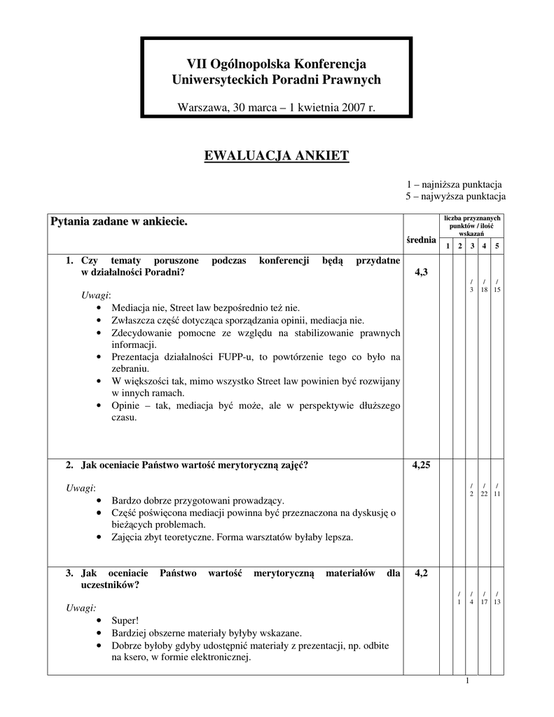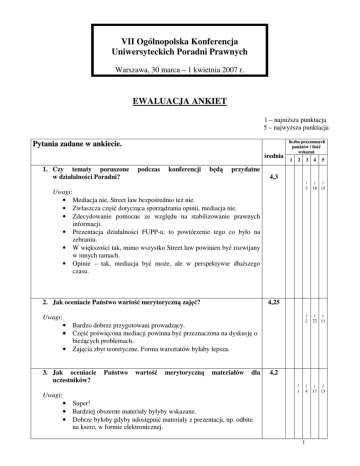 VII Ogólnopolska Konferencja Uniwersyteckich Poradni Prawnych Warszawa, 30 marca – 1 kwietnia 2007 r. EWALUACJA ANKIET 1 – najniższa punktacja 5 – najwyższa punktacja Pytania zadane w ankiecie. średnia 1. Czy tematy poruszone w działalności Poradni? podczas konferencji będą liczba przyznanych punktów / ilość wskazań 1 2 Bardzo dobrze przygotowani prowadzący. Część poświęcona mediacji powinna być przeznaczona na dyskusję o bieżących problemach. Zajęcia zbyt teoretyczne. Forma warsztatów byłaby lepsza. Uwagi: • • • Państwo / 3 / / 18 15 / 2 / / 22 11 / 4 / / 17 13 4,25 Uwagi: 3. Jak oceniacie uczestników? 5 4,3 2. Jak oceniacie Państwo wartość merytoryczną zajęć? • 4 przydatne Uwagi: • Mediacja nie, Street law bezpośrednio też nie. • Zwłaszcza część dotycząca sporządzania opinii, mediacja nie. • Zdecydowanie pomocne ze względu na stabilizowanie prawnych informacji. • Prezentacja działalności FUPP-u, to powtórzenie tego co było na zebraniu. • W większości tak, mimo wszystko Street law powinien być rozwijany w innych ramach. • Opinie – tak, mediacja być może, ale w perspektywie dłuższego czasu. • • 3 wartość merytoryczną materiałów dla 4,2 / 1 Super! Bardziej obszerne materiały byłyby wskazane. Dobrze byłoby gdyby udostępnić materiały z prezentacji, np. odbite na ksero, w formie elektronicznej. 1 4. Jak oceniacie Państwo szkolenie z zakresu sporządzania opinii prawnej? 4,2 / 3 / / 16 16 / 3 / 8 / / 13 11 / 1 / 2 / 8 / 2 / 2 / / 13 17 Uwagi: • • • • • • Rewelacja! Rzeczowe uwagi. W przyszłości warto dodać kazusy. Brak przedstawienia przez uczestników konferencji swoich wzorów opinii prawnych. Prawidłowy wstęp do dalszej dyskusji, świetnie, że nie narzucano żadnego sposobu wykonania opinii. Kompetentni panowie. ☺ 5. Jak oceniacie Państwo szkolenie z zakresu mediacji w klinikach prawa? Uwagi: • • • • • • 3,8 Niestety nic ciekawego. Temat minął się z realizacją. Zabrakło szkolenia z mediacji i przełożenia wrażeń z pobytu z USA na konkretny pomysł. Merytorycznie bardzo dobrze. Lepsze są szkolenia warsztatowe. Zbyt dużo informacji teoretycznych. 6. Jak oceniacie Państwo prezentację i dyskusję na temat „Prawa na co dzień”? 4,1 Uwagi: • • • Brawo! Dr Płatek super! Bardzo dobra prezentacja „Łazarski”. 7. Jaka jest Państwa opinia o stronie organizacyjnej konferencji? Uwagi: • • • • • • • • • / 11 Daleko hotel od szkoły. Rewelacyjne materiały dodatkowe. Super sala konferencyjna i pyszne ciastka. ☺ Jak na warunki Warszawy było świetnie, oceną zaniża nieporozumienie z hotelem. Super naprawdę extra! Konferencja powinna być dwudniowa. Średnia i jest to eufemizm. Sprawna organizacja. Organizatorzy właściwie dbali o komfort uczestników. Malutkie pokoje w hotelu ale ogólnie organizacja bardzo dobra. 4,2 / 2 2 8. Jak oceniacie Państwo organizację czasu wolnego uczestników? Uwagi: • • • • • • • • 3,5 Brakowało zwiedzania miasta. Zabrakło strony turystycznej. Bardzo mało czasu na przemieszczanie się z - do hotelu. Świetna Folk Gospoda. Brak integracji podczas imprezy integracyjnej. Rewelacja! Tak naprawdę czasu wolnego nie było ale jeśli chodzi o imprezy – kolacje to ok. Warszawa to trudne miasto żeby „dopieścić wszystkich” uczestników bo jest bardzo duże, jest super, styl bardzo interaktywny, tak trzymać! • • • • Miejsce ok. – co do formy brakowało mi dyskusji. Więcej szkoleń warsztatowych. Dobrze byłoby gdyby studenci byli bardziej zaangażowani w logistykę np. dojazdy. Street law nie należy bezpośrednio do zagadnień SPP. Konferencja za długa ze względu na oszczędność powinna trwać 2 dni. Centralne miejsce naszego kraju – każdy ma w miarę taki sam dojazd. Wybór miejsca i formy pozwalał na swobodną realizację założeń konferencji. 10. Jakie oceniacie Państwo działalność FUPP? Uwagi: • • • • • • / 1 / 9 / 8 / 1 / 7 / / 13 14 / 3 / / 13 16 3,8 Przydatna fundacja, zarówno dla studentów, opiekunów jak i potencjalnych klientów. Brak informacji o szkoleniach, konferencjach w działalności FUPP. Zbyt mały udział w grantach. Niezwykle pozytywnie. Dziękujemy za pomoc i zaangażowanie. Podobają mi się tylko kryteria regrantingu , ilość podziału środków jest dla mnie niejasna. 11. Który z tematów konferencji był Państwa zdaniem najciekawszy? • • • • • Dotyczący zasad przygotowania opinii prawnych. Mediacje. Sprawy precedensowe. Street law. Litygacja strategiczna. / 11 4,2 9. Jak oceniacie Państwo miejsce i formę organizacji konferencji? Uwagi: • • • / 3 13 wskazań 10 wskazań 7 wskazań 3 wskazania 1 wskazanie 3 12. Jaki temat powinna poruszać kolejna konferencja? • • • • • • • • • • • • • • • • • • • Kontynuacja zasad sporządzania opinii prawnych. Problematyka etyki. Przygotowanie studentów do pracy w poradni (m.in. w kontekście sporządzania opinii i pism procesowych; socjotechnika rozmowy studenta z klientem). Mediacja. Psychologia w poradnictwie. Pozyskiwanie funduszy – pisanie rozliczanie projektów. Kwestie związane z funkcjonowaniem Akademii Iuris. Sformułowanie kodeksu etycznego dla studentów poradni. Metodyka nauczania klinicznego. Ocenianie studentów w klinice. Ćwiczenia z negocjacji. Street law. Symulacje. Dotyczący ujednolicenia mechanizmów działania UPP w skali ogólnokrajowej. Rola opiekunów w poradni. Sprawy precedensowe. Nawiązanie współpracy z kancelariami i sądami. Powtórzenie szkolenia z Łodzi dla trenerów. Kontrola jakości. 8 wskazań 5 wskazań 4 wskazania 4 wskazania 2 wskazania 2 wskazania 2 wskazania W ewaluacji wzięło udział 36 ankiet. 4