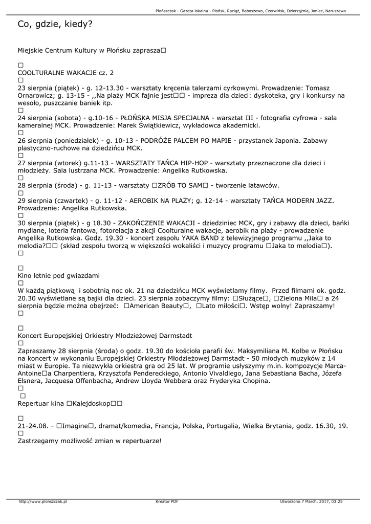 Płońszczak - Gazeta lokalna - Płońsk, Raciąż, Baboszewo, Czerwińsk, Dzierzążnia, Joniec, Naruszewo Co, gdzie, kiedy? Miejskie Centrum Kultury w Płońsku zaprasza COOLTURALNE WAKACJE cz. 2 23 sierpnia (piątek) - g. 12-13.30 - warsztaty kręcenia talerzami cyrkowymi. Prowadzenie: Tomasz Ornarowicz; g. 13-15 - ,,Na plaży MCK fajnie jest - impreza dla dzieci: dyskoteka, gry i konkursy na wesoło, puszczanie baniek itp. 24 sierpnia (sobota) - g.10-16 - PŁOŃSKA MISJA SPECJALNA - warsztat III - fotografia cyfrowa - sala kameralnej MCK. Prowadzenie: Marek Świątkiewicz, wykładowca akademicki. 26 sierpnia (poniedziałek) - g. 10-13 - PODRÓŻE PALCEM PO MAPIE - przystanek Japonia. Zabawy plastyczno-ruchowe na dziedzińcu MCK. 27 sierpnia (wtorek) g.11-13 - WARSZTATY TAŃCA HIP-HOP - warsztaty przeznaczone dla dzieci i młodzieży. Sala lustrzana MCK. Prowadzenie: Angelika Rutkowska. 28 sierpnia (środa) - g. 11-13 - warsztaty ZRÓB TO SAM - tworzenie latawców. 29 sierpnia (czwartek) - g. 11-12 - AEROBIK NA PLAŻY; g. 12-14 - warsztaty TAŃCA MODERN JAZZ. Prowadzenie: Angelika Rutkowska. 30 sierpnia (piątek) - g 18.30 - ZAKOŃCZENIE WAKACJI - dziedziniec MCK, gry i zabawy dla dzieci, bańki mydlane, loteria fantowa, fotorelacja z akcji Coolturalne wakacje, aerobik na plaży - prowadzenie Angelika Rutkowska. Godz. 19.30 - koncert zespołu YAKA BAND z telewizyjnego programu ,,Jaka to melodia? (skład zespołu tworzą w większości wokaliści i muzycy programu Jaka to melodia). Kino letnie pod gwiazdami W każdą piątkową i sobotnią noc ok. 21 na dziedzińcu MCK wyświetlamy filmy. Przed filmami ok. godz. 20.30 wyświetlane są bajki dla dzieci. 23 sierpnia zobaczymy filmy: Służące, Zielona Mila a 24 sierpnia będzie można obejrzeć: American Beauty, Lato miłości. Wstęp wolny! Zapraszamy! Koncert Europejskiej Orkiestry Młodzieżowej Darmstadt Zapraszamy 28 sierpnia (środa) o godz. 19.30 do kościoła parafii św. Maksymiliana M. Kolbe w Płońsku na koncert w wykonaniu Europejskiej Orkiestry Młodzieżowej Darmstadt - 50 młodych muzyków z 14 miast w Europie. Ta niezwykła orkiestra gra od 25 lat. W programie usłyszymy m.in. kompozycje MarcaAntoinea Charpentiera, Krzysztofa Pendereckiego, Antonio Vivaldiego, Jana Sebastiana Bacha, Józefa Elsnera, Jacquesa Offenbacha, Andrew Lloyda Webbera oraz Fryderyka Chopina. Repertuar kina Kalejdoskop 21-24.08. - Imagine, dramat/komedia, Francja, Polska, Portugalia, Wielka Brytania, godz. 16.30, 19. Zastrzegamy możliwość zmian w repertuarze! http://www.plonszczak.pl Kreator PDF Utworzono 7 March, 2017, 03:25
