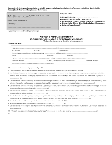 Załącznik nr 1 do Regulaminu ustalania wysokości, przyznawania i wypłacania świadczeń pomocy materialnej dla studentów Wyższej Szkoły Finansów i Zarządzania w Białymstoku Nr wniosku: ………………… Rok akademicki: 201…/201… Data wpłynięcia: …../…../201…r. Podpis osoby przyjmującej:……………………………………... Adnotacje:……………………………………….............................. Białystok, dnia ………………………………………. Dziekan Wydziału ………………………………….. Wyższej Szkoły Finansów i Zarządzania w Białymstoku/Wyższej Szkoły Finansów i Zarządzania w Białymstoku, Filia w Ełku/Wydziału Zamiejscowego w Ostrowi Mazowieckiej* ……………………………………………………………..................... wypełnia pracownik Biura Stypendialnego WNIOSEK O PRZYZNANIE STYPENDIUM SOCJALNEGO/SOCJALNEGO W ZWIĘKSZONEJ WYSOKOŚCI* * Tylko dla studentów studiów stacjonarnych I Dane studenta Nazwisko...........................................................................................Imię................................................................ Nr albumu................................. Nr PESEL …………………………….. Obywatelstwo: …………………………. Adres stałego zameldowania: kod pocztowy ......................... miejscowość....................................................... ulica .......................................................................... nr domu .............................. nr lokalu ............................. Adres e-mail: …………………………………................….. telefon: ………………………………………………… Kierunek studiów .................................................... Studia I / Studia II stopnia* Rok studiów .......................... Semestr studiów ........................................ Studia stacjonarne/niestacjonarne* II Do wniosku dołączam następujące załączniki: 1. Oświadczenie o niepobieraniu świadczeń pomocy materialnej na więcej niż jednym kierunku studiów. 2. Zaświadczenia z urzędu skarbowego o wysokości przychodów i dochodów uzyskanych przez wszystkich pełnoletnich członków rodziny jeżeli dochody podlegają opodatkowaniu podatkiem dochodowym od osób fizycznych na zasadach ogólnych ....................... szt. 3. Oświadczenia członków rodziny o wysokości uzyskanego dochodu w roku kalendarzowym poprzedzającym okres zasiłkowy, jeżeli członkowie rodziny rozliczają się na podstawie przepisów o zryczałtowanym podatku dochodowym - ......................szt. 4. Oświadczenia członków rodziny o wysokości uzyskanego w roku kalendarzowym poprzedzającym okres zasiłkowy innego dochodu niepodlegającego opodatkowaniu - ....................... szt. 5. Oświadczenia członków rodzin o wysokości odprowadzonych składek na ubezpieczenie zdrowotne w roku kalendarzowym poprzedzającym okres zasiłkowy - ……………….. szt. 6. Zaświadczenie właściwego organu/organów gminy lub nakaz płatniczy o wielkości gospodarstwa rolnego wyrażonych w hektarach przeliczeniowych ogólnej powierzchni w roku kalendarzowym poprzedzającym okres zasiłkowy - ..................... szt. 7. Zaświadczenie ze szkół o uczących się dzieciach i rodzeństwie w wieku 7 – 26 lat - ....................... szt. 8. Akty urodzenia dzieci i rodzeństwa (dotyczy dzieci do lat 7) - ....................... szt. 9. Oświadczenie studenta (-tki) do stypendium w zwiększonej wysokości o zamieszkiwaniu w domu studenckim lub w innym obiekcie niż dom studencki. 10. Wniosek o uwzględnienie dochodu uzyskanego/utraconego w dochodzie rodziny ..........................................................szt. 11. ............................................................................................................................................................................................................................. III Dochody Dochody członków rodziny studenta osiągnięte w roku kalendarzowym poprzedzającym okres zasiłkowy wypełnia pracownik Biura Stypendialnego Dochody netto (zł) L.p. Imię i nazwisko (wszyscy członkowie gospodarstwa domowego 1. Stopień pokrewieństwa wnioskodawca 2. 3. 4. 5. 6. 7. 8. 9. Razem Data urodzenia Miejsce zatrudnienia lub nazwa szkoły/uczelni Opodatkowane podatkiem dochodowym na zasadach ogólnych1 Opodatkowane zryczałtowanym podatkiem dochodowym Inny dochód, niepodlegający opodatkowaniu Dochód ogółem netto (zł) Łączna kwota alimentów świadczonych na rzecz innych osób oraz opłat poniesionych z tytułu przebywania członka rodziny w instytucji zapewniającej całodobowe utrzymanie w roku ………….. wyniosła ........................... zł ............ gr. Dochód rodziny po odliczeniu zobowiązań wynosi: roczny .............. zł ...........gr, miesięczny ......................... zł ........... gr. Dochód utracony w roku …………….. wyniósł: ..................... zł ............. gr miesięcznie. Dochód uzyskany w roku …………….. wyniósł: ..................... zł ............. gr miesięcznie. Miesięczny dochód rodziny po odliczeniu utraconego dochodu/doliczeniu uzyskanego dochodu wynosi .............. zł ....... gr. Miesięczny dochód rodziny w przeliczeniu na osobę wynosi ............................. zł ........................ gr. wypełnia pracownik Biura Stypendialnego IV Oświadczenie studenta: 1. Znajduję się w trudnej sytuacji materialnej. 2. Zapoznałem (-am) się z Regulaminem ustalania wysokości, przyznawania i wypłacania świadczeń pomocy materialnej dla studentów Wyższej Szkoły Finansów i Zarządzania w Białymstoku. 3. Dochody osiągane w roku podatkowym poprzedzającym rok akademicki były uzyskiwane przez 12 miesięcy TAK/NIE* 4. Świadomy odpowiedzialności dyscyplinarnej i karnej za podanie niezgodnych z prawdą oświ