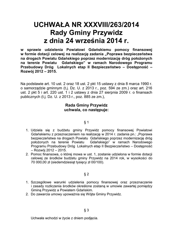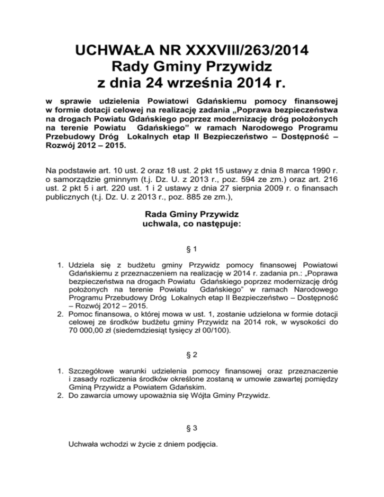UCHWAŁA NR XXXVIII/263/2014 Rady Gminy Przywidz z dnia 24 września 2014 r. w sprawie udzielenia Powiatowi Gdańskiemu pomocy finansowej w formie dotacji celowej na realizację zadania „Poprawa bezpieczeństwa na drogach Powiatu Gdańskiego poprzez modernizację dróg położonych na terenie Powiatu Gdańskiego” w ramach Narodowego Programu Przebudowy Dróg Lokalnych etap II Bezpieczeństwo – Dostępność – Rozwój 2012 – 2015. Na podstawie art. 10 ust. 2 oraz 18 ust. 2 pkt 15 ustawy z dnia 8 marca 1990 r. o samorządzie gminnym (t.j. Dz. U. z 2013 r., poz. 594 ze zm.) oraz art. 216 ust. 2 pkt 5 i art. 220 ust. 1 i 2 ustawy z dnia 27 sierpnia 2009 r. o finansach publicznych (t.j. Dz. U. z 2013 r., poz. 885 ze zm.), Rada Gminy Przywidz uchwala, co następuje: §1 1. Udziela się z budżetu gminy Przywidz pomocy finansowej Powiatowi Gdańskiemu z przeznaczeniem na realizację w 2014 r. zadania pn.: „Poprawa bezpieczeństwa na drogach Powiatu Gdańskiego poprzez modernizację dróg położonych na terenie Powiatu Gdańskiego” w ramach Narodowego Programu Przebudowy Dróg Lokalnych etap II Bezpieczeństwo – Dostępność – Rozwój 2012 – 2015. 2. Pomoc finansowa, o której mowa w ust. 1, zostanie udzielona w formie dotacji celowej ze środków budżetu gminy Przywidz na 2014 rok, w wysokości do 70 000,00 zł (siedemdziesiąt tysięcy zł 00/100). §2 1. Szczegółowe warunki udzielenia pomocy finansowej oraz przeznaczenie i zasady rozliczenia środków określone zostaną w umowie zawartej pomiędzy Gminą Przywidz a Powiatem Gdańskim. 2. Do zawarcia umowy upoważnia się Wójta Gminy Przywidz. §3 Uchwała wchodzi w życie z dniem podjęcia.