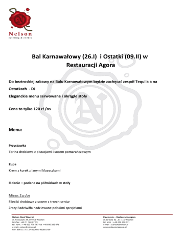 Bal Karnawałowy (26.I) i Ostatki (09.II) w Restauracji Agora Do beztroskiej zabawy na Balu Karnawałowym będzie zachęcać zespół Tequila a na Ostatkach - DJ Eleganckie menu serwowane i okrągłe stoły Cena to tylko 120 zł /os Menu: Przystawka Terina drobiowa z pistacjami i sosem pomarańczowym Zupa Krem z kurek z lanymi kluseczkami II danie – podane na półmiskach w stoły Mięsa: 2 p /os Fileciki drobiowe z sosem z trzech serów Zrazy Radziwiłła nadziewane polskimi specjałami Nelson Józef Nawrot ul. Kościuszki 34, 50-012 Wrocław tel./fax: +48 71 368 07 99 tel. kom.: +48 602 770 787 lub +48 606 200 071 e-mail: [email protected] NIP: 898 11 75 127 REGON: 932801709 Kawiarnia – Restauracja Agora ul.Serbska 5a , 51-111 Wrocław tel. kom : +48 606 200 071 e-mail : [email protected] www.restauracjaagora.pl Dodatki: 200 g /os Talarki ziemniaczane po staropolsku Zestaw 3 surówek Deser: Sernik domowy Przekąski zimne podane do stołu po obedzie: Zestaw mięs : Karczek pieczony Schab ze śliwką Szynka wiejska Sosy do mięs w dekoracyjnych miseczkach - (chrzan, ćwikła, żurawina) Delikatesy stołu: Tymbaliki drobiowe Rulony szynkowe z musem chrzanowym / pieczarkowym ½ Jajka po carsku z kawiorem ½ Jajka z musem szynkowym Pomidorki wiśniowe przekładane listkami bazylii Mini grzanki z łososiem wędzonym i crem-resh Bar sałatkowy: Sałatka jarzynowa Sałatka cesar z grzankami Owoce południowe garnirowane Nelson Józef Nawrot ul. Kościuszki 34, 50-012 Wrocław tel./fax: +48 71 368 07 99 tel. kom.: +48 602 770 787 lub +48 606 200 071 e-mail: [email protected] NIP: 898 11 75 127 REGON: 932801709 Kawiarnia – Restauracja Agora ul.Serbska 5a , 51-111 Wrocław tel. kom : +48 606 200 071 e-mail : [email protected] www.restauracjaagora.pl Dania gorące podawane kolejno o 24.00 i 1.00 w nocy Ragout wieprzowy z grzybkami Barszczyk czysty do picia Bar z napojami : Kawa i herbata - bez limitu Soki owocowe - 1 l /os Serdecznie zapraszamy! Zespół Restauracji Agora Tel: 606 2000 71 ; www.restauracjaagora.pl Nelson Józef Nawrot ul. Kościuszki 34, 50-012 Wrocław tel./fax: +48 71 368 07 99 tel. kom.: +48 602 770 787 lub +48 606 200 071 e-mail: [email protected] NIP: 898 11 75 127 REGON: 932801709 Kawiarnia – Restauracja Agora ul.Serbska 5a , 51-111 Wrocław tel. kom : +48 606 200 071 e-mail : [email protected] www.restauracjaagora.pl