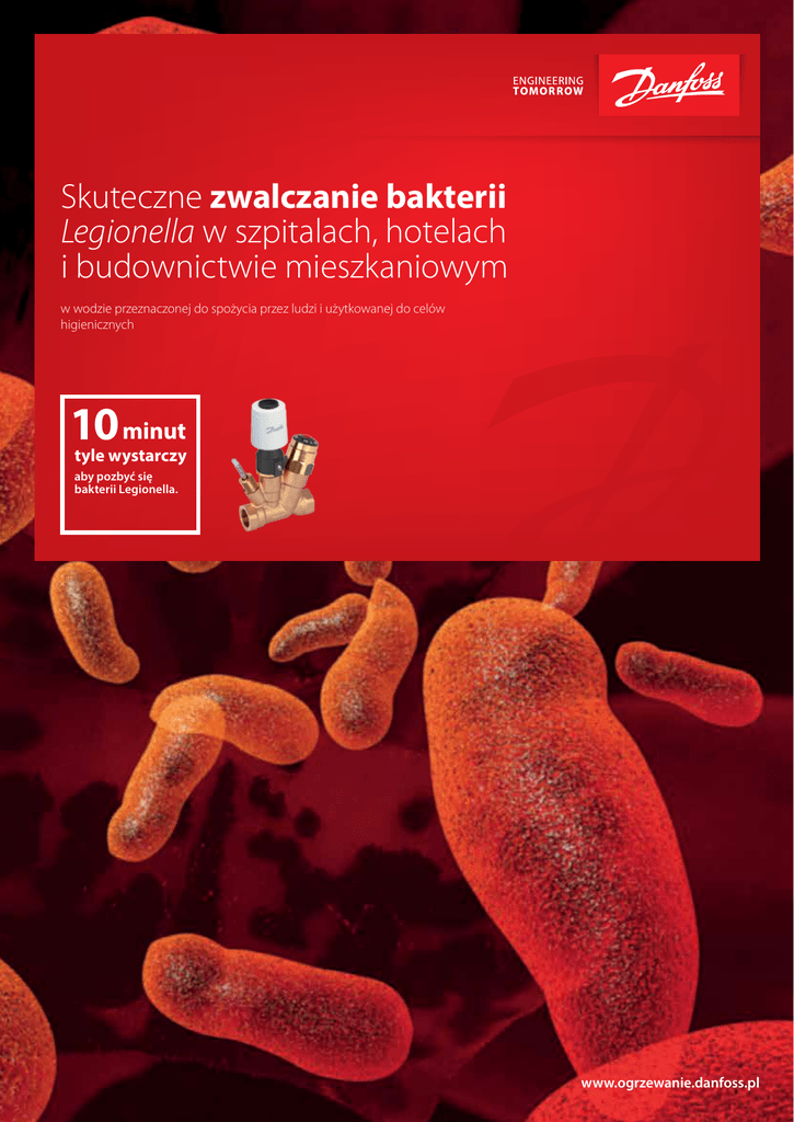 Skuteczne zwalczanie bakterii Legionella w szpitalach, hotelach i budownictwie mieszkaniowym w wodzie przeznaczonej do spożycia przez ludzi i użytkowanej do celów higienicznych 10 minut tyle wystarczy aby pozbyć się bakterii Legionella. www.ogrzewanie.danfoss.pl Co to jest Legionella? Jak walczyć z bakterią Legionella? Każdego roku ponad 4000 osób umiera na legionellozę. Eksperci w tej dziedzinie oceniają, że najważniejszym źródłem bakterii Legionella są instalacje wodne, a więc w tym również instalacje wody pitnej w budynkach. Niezależnie od stopnia przygotowania wody przez jej dostawcę, na drodze do odbiorcy poziom środków dezynfekujących może ulec zmniejszeniu, a na powierzchni wewnętrznej rurociągów może występować biofilm. To może spowodować wytworzenie się warunków korzystnych dla rozwoju bakterii, która staje się śmiertelnym zagrożeniem dla ludzi. Legionella pneumophila jest jednym ze szczepów dużej rodziny bakterii Legionellaceae. Znanych jest obecnie co najmniej 47 gatunków bakterii typu Legionella. Legionelloza wywoływana jest przez wdychanie aerozolu wody z bakteriami w powietrzu. Rzadziej choroba wywoływana jest zachłyśnięciem się wodą zakażoną bakteriami. Okres inkubacji legionellozy, czyli czas między dostaniem się bakterii do organizmu a powstaniem pierwszych objawów wynosi zwykle od 2 do 10 dni, lecz może czasami wynosić nawet 21 dni. Jednym z miejsc zagrożonych występowaniem bakterii jest instalacja ciepłej wody użytkowej w budynkach użyteczności publicznej, mieszkalnych i komercyjnych. Głównymi czynnikami sprzyjającymi rozwojowi bakterii są zastoiska wody w instalacji oraz niewłaściwa tempe- ratura: wzrost ilości bakterii następuje pomiędzy 20°C a 46°C. Optymalna temperatura do namnażania się bakterii Legionella pneumophila to 37°C. Przy wyższych temperaturach stopień namnażania tych mikroorganizmów zmniejsza się, a przy temperaturze 46°C ustaje. Bakteria może przeżyć w wyższych tempe- raturach, ale czas przetrwania spada od kilku godzin przy 50°C do kliku minut przy 60°C. Przy temperaturze 70°C bakteria ginie natychmiast. Poniżej 37°C stopień namnażania spada również i jest nieznaczący poniżej 20°C. Bakteria może przeżyć w stanie uśpienia przy dużo niższych temperaturach i powrócić do namnażania po pojawieniu się bardziej sprzyjających warunków. Proste rozwiązanie Metoda przegrzewu instalacji ciepłej wody użytkowej opracowana Obraz mikroskopowy bakterii Legionella przez firmę Danfoss opiera się na wykorzystaniu wielofunkcyjnego termostatycznego zaworu cyrkulacyjnego MTCV, rozbudowanego o napęd termiczny z czujnikiem temperatury oraz o sterownik CCR2, który zarządza automatycznym procesem dezynfekcji. Chociaż zastosowanie samych zaworów MTCV już ogranicza możliwość rozwoju bakterii, to uzupełnienie systemu o kolejne elementy daje użytkownikowi możliwość wykonania dezynfekcji termicznej. Proces wymaga temperatury 70°C – 80°C, ale także odpowiedniego czasu i dlatego, w celu precyzyjnej kontroli tego parametru, zalecane jest zastosowanie sterownika CCR2. Wymieńmy te spośród wielu jego funkcji, które są ważne ze względu na projektowanie i użytkowanie systemu. Są to: ciągły pomiar temperatur i możliwość wykonania nastaw na zaworach MTCV, a także ustawienie czasu przegrzewu dla wybranej temperatury. Jedną z ważniejszych funkcji jest również automatyczny wybór sposobu dokonania przegrzewu na podstawie rozpoznanej przez sterownik CCR2 charakterystyki instalacji. Taka opcja wydatnie zmniejsza energochłonność sterownika i czas trwania przegrzewu oraz wydłuża okres eksploatacji instalacji, ponieważ ograniczone zostaje powstawanie osadów i zmniejszona szybkość postępowania korozji, szczególnie niebezpiecznej dla rur stalowych ocynkowanych. Rejestracja temperatur odbywa się z zadaną częstotliwością: od 10 sekund d o 4 godzin, a następnie jest zapisywana na karcie pamięci SD. Dane mogą być przetwarzane w arkuszu kalkulacyjnym (Excel) i prezentowane w formie wykresów. Sterownik jako regulator procesu dezynfekcji umożliwia przeprowadzenie automatycznego przegrzewu instalacji ciepłej wody użytkowej w optymalnie krótkim czasie, przy jednoczesnej kontroli przeprowadzanego procesu. Rejestrator montowany jest w typowej obudowie elektrycznej naściennej, wyposażonej w listwę typu DIN. Zasilany jest napięciem 24 V prądu stałego. Może być montowany w rozdzielniach ciepła, czy też w węzłach cieplnych. Sygnał pomiaru temperatury przekazywany jest z czujników temperatury typu PT1000 umieszczonych w zaworach MTCV lub innych wybranych miejscach instalacji. W celu zapewnienia stałej temperatury wody dostarczanej mieszkańcom na odejściach do punktów czerpalnych powinny być także zamontowane termostatyczne zawory mieszające TVM-W. Pozwalają one zabezpieczyć punkty poboru przed napływem wody o nadmiernej temperaturze podczas dezynfekcji termicznej i powodują, że instalacja ciepłej wody użytkowej jest bezpieczna dla użytkownika także podczas trwającego procesu przegrzewu. Istnieje kilka metod zwalczania chorobotwórczych bakterii Legionella w instalacjach wodociągowych. Zaliczyć do nich można chlorowanie, jodowanie lub ozonowanie wody, poddawanie jej promieniowaniu ultrafioletowemu oraz dezynfekcja termiczna. Ostatnia z wymienionych metod jest bardzo skuteczna, najłatwiejsza do realizacji i zarazem najtańsza. Polega ona na okresowym podgrzewaniu wody w instalacji ciepłej wody użytkowej do lub powyżej temperatury dezynfekcji i utrzymywaniu jej przez odpowiedni czas. Metoda ta jest ujęta jako proponowana w Rozporządzeniu Ministra Infrastruktury dotyczącym warunków technicznych, jakim powinny odpowiadać budynki. Paragraf 120 wspomnianego rozporządzenia mówi, że instalacja ciepłej wody użytkowej powinna umożliwiać przeprowadzenie okresowej dezynfekcji termicznej przy temperaturze w