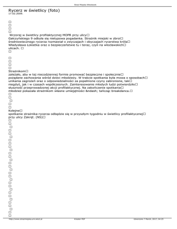 Straż Miejska Włocławek Rycerz w świetlicy (foto) 17.02.2009. Wczoraj w świetlicy profilaktycznej MOPR przy ulicy Gałczyńskiego 9 odbyła się nietypowa pogadanka. Strażnik miejski w zbroi średniowiecznego rycerza rozmawiał o zwyczajach i obyczajach rycerstwa króla Władysława Łokietka oraz o bezpieczeństwie tu i teraz, czyli na włocławskich ulicach. Strażnikom zależało, aby w tej niecodziennej formie promować bezpieczne i społecznie pożądane zachowania wśród dzieci młodzieży. W trakcie spotkania była mowa o sposobach unikania zagrożeń oraz o odpowiedzialności za popełnione czyny zabronione, tak niegdyś, jak i w czasach współczesnych. Zainteresowanie młodych ludzi potwierdziło słuszność przeprowadzonej akcji profilaktycznej. Na zakończenie spotkania młodzież pokazała strażnikom własne umiejętności – tańcząc breakdanca. Kolejne spotkanie strażnika-rycerza odbędzie się w przyszłym tygodniu w świetlicy profilaktycznej przy ulicy Zakręt. (NS) http://www.strazmiejska.um.wlocl.pl Kreator PDF Utworzono 7 March, 2017, 04:25 Straż Miejska Włocławek http://www.strazmiejska.um.wlocl.pl Kreator PDF Utworzono 7 March, 2017, 04:25