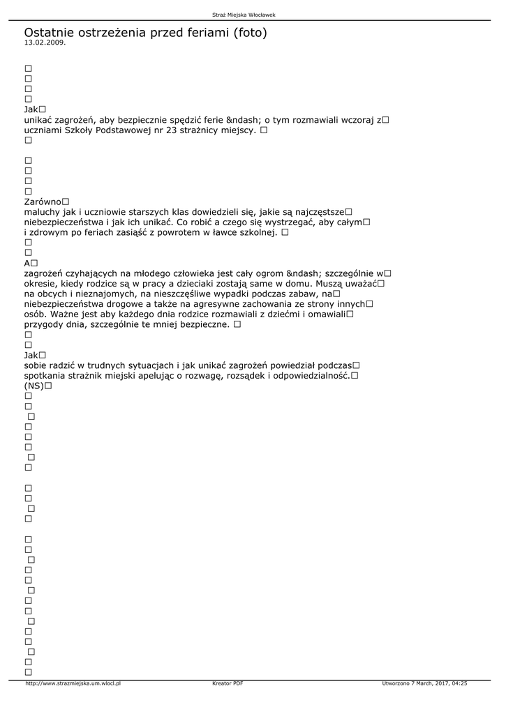 Straż Miejska Włocławek Ostatnie ostrzeżenia przed feriami (foto) 13.02.2009. Jak unikać zagrożeń, aby bezpiecznie spędzić ferie – o tym rozmawiali wczoraj z uczniami Szkoły Podstawowej nr 23 strażnicy miejscy. Zarówno maluchy jak i uczniowie starszych klas dowiedzieli się, jakie są najczęstsze niebezpieczeństwa i jak ich unikać. Co robić a czego się wystrzegać, aby całym i zdrowym po feriach zasiąść z powrotem w ławce szkolnej. A zagrożeń czyhających na młodego człowieka jest cały ogrom – szczególnie w okresie, kiedy rodzice są w pracy a dzieciaki zostają same w domu. Muszą uważać na obcych i nieznajomych, na nieszczęśliwe wypadki podczas zabaw, na niebezpieczeństwa drogowe a także na agresywne zachowania ze strony innych osób. Ważne jest aby każdego dnia rodzice rozmawiali z dziećmi i omawiali przygody dnia, szczególnie te mniej bezpieczne. Jak sobie radzić w trudnych sytuacjach i jak unikać zagrożeń powiedział podczas spotkania strażnik miejski apelując o rozwagę, rozsądek i odpowiedzialność. (NS) http://www.strazmiejska.um.wlocl.pl Kreator PDF Utworzono 7 March, 2017, 04:25 Straż Miejska Włocławek http://www.strazmiejska.um.wlocl.pl Kreator PDF Utworzono 7 March, 2017, 04:25 Straż Miejska Włocławek http://www.strazmiejska.um.wlocl.pl Kreator PDF Utworzono 7 March, 2017, 04:25 Straż Miejska Włocławek http://www.strazmiejska.um.wlocl.pl Kreator PDF Utworzono 7 March, 2017, 04:25