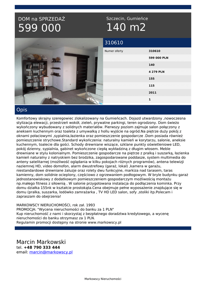 DOM na SPRZEDAŻ 599 000 Szczecin, Gumieńce 140 m2 310610 Numer oferty 310610 599 000 PLN 140 4 279 PLN 155 115 2011 1 Opis Komfortowy skrajny szeregowiec zlokalizowany na Gumieńcach. Dojazd utwardzony ,nowoczesna stylizacja elewacji, przestrzeń wokół, zieleń, prywatne parkingi, teren ogrodzony. Dom świeżo wykończony wybudowany z solidnych materiałów. Pierwszy poziom zajmuje salon połączony z aneksem kuchennym oraz toaleta z umywalką z hollu wyjście na ogród.Na piętrze duży pokój z oknami połaciowymi ,sypialnia,łazienka oraz pomieszczenie gospodarcze .Dom posiada również pomieszczenie strychowe.Standard wykończenia: naturalny kamień w korytarzu, salonie, aneksie kuchennym, toalecie dla gości. Schody drewniane wiszące, szklane punkty oświetleniowe LED, pokój dzienny, sypialnia, gabinet wykończone ciepłą wykładziną z długim włosem. Meble drewniane w stylu kolonialnym. Pomieszczenie gospodarcze na piętrze z pralką i suszarką, łazienka kamień naturalny z natryskiem bez brodzika, zagospodarowane poddasze, system multimedia do anteny satelitarnej (możliwość oglądania w kilku pokojach różnych programów), antena telewizji naziemnej HD, video domofon, alarm dwustrefowy (garaż, lokal) ,kamera w garażu, niestandardowe drewniane żaluzje oraz rolety dwu funkcyjne, markiza nad tarasem, taras kamienny, dom solidnie ocieplony, częściowo z ogrzewaniem podłogowym. W bryle budynku garaż jednostanowiskowy z dodatkowym pomieszczeniem gospodarczym możliwością montażu np.małego fitness z siłownią . W salonie przygotowana instalacja do podłączenia kominka. Przy domu działka 155nk w kształcie prostokąta.Cena obejmuje pełne wyposażenie znajdujące się w domu (pralka, suszarka, lodówko zamrażarka , TV HD LED salon, sofy ,stoliki itp.Polecam i zapraszam do obejrzenia! MARKOWSCY NIERUCHOMOŚCI, rok zał. 1993 PROMOCJA: "Wycena nieruchomości do banku za 1 PLN" Kup nieruchomość z nami i skorzystaj z bezpłatnego doradztwa kredytowego, a wycenę nieruchomości do banku otrzymasz za 1 PLN. Regulamin promocji dostępny na stronie www.markowscy.pl Marcin Markowski tel. +48 790 333 444 email: [email protected] Markowscy Nieruchomości Powered by TCPDF (www.tcpdf.org)