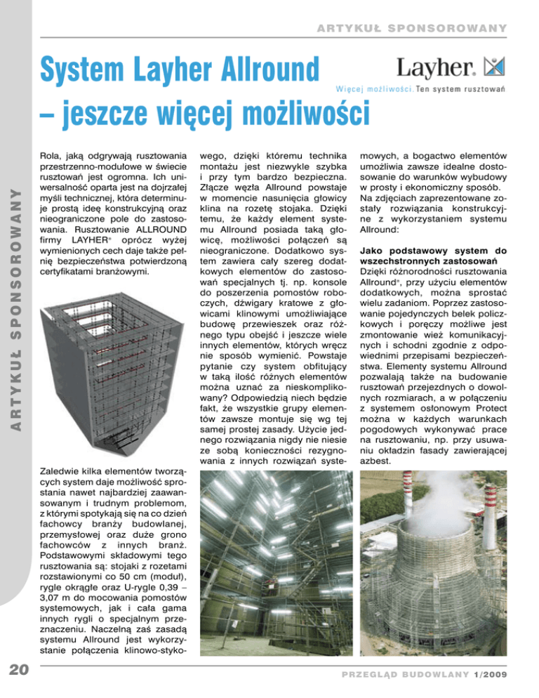 ARTYKUŁ S PON S OROWANY A R T Y K U Ł S P ON S O R OWANY System Layher Allround – jeszcze więcej możliwości Rola, jaką odgrywają rusztowania przestrzenno-modułowe w świecie rusztowań jest ogromna. Ich uniwersalność oparta jest na dojrzałej myśli technicznej, która determinuje prostą ideę konstrukcyjną oraz nieograniczone pole do zastosowania. Rusztowanie ALLROUND firmy LAYHER® oprócz wyżej wymienionych cech daje także pełnię bezpieczeństwa potwierdzoną certyfikatami branżowymi. Zaledwie kilka elementów tworzących system daje możliwość sprostania nawet najbardziej zaawansowanym i trudnym problemom, z którymi spotykają się na co dzień fachowcy branży budowlanej, przemysłowej oraz duże grono fachowców z innych branż. Podstawowymi składowymi tego rusztowania są: stojaki z rozetami rozstawionymi co 50 cm (moduł), rygle okrągłe oraz U-rygle 0,39 – 3,07 m do mocowania pomostów systemowych, jak i cała gama innych rygli o specjalnym przeznaczeniu. Naczelną zaś zasadą systemu Allround jest wykorzystanie połączenia klinowo-styko- 20 wego, dzięki któremu technika montażu jest niezwykle szybka i przy tym bardzo bezpieczna. Złącze węzła Allround powstaje w momencie nasunięcia głowicy klina na rozetę stojaka. Dzięki temu, że każdy element systemu Allround posiada taką głowicę, możliwości połączeń są nieograniczone. Dodatkowo system zawiera cały szereg dodatkowych elementów do zastosowań specjalnych tj. np. konsole do poszerzenia pomostów roboczych, dźwigary kratowe z głowicami klinowymi umożliwiające budowę przewieszek oraz różnego typu obejść i jeszcze wiele innych elementów, których wręcz nie sposób wymienić. Powstaje pytanie czy system obfitujący w taką ilość różnych elementów można uznać za nieskomplikowany? Odpowiedzią niech będzie fakt, że wszystkie grupy elementów zawsze montuje się wg tej samej prostej zasady. Użycie jednego rozwiązania nigdy nie niesie ze sobą konieczności rezygnowania z innych rozwiązań syste- mowych, a bogactwo elementów umożliwia zawsze idealne dostosowanie do warunków wybudowy w prosty i ekonomiczny sposób. Na zdjęciach zaprezentowane zostały rozwiązania konstrukcyjne z wykorzystaniem systemu Allround: Jako podstawowy system do wszechstronnych zastosowań Dzięki różnorodności rusztowania Allround®, przy użyciu elementów dodatkowych, można sprostać wielu zadaniom. Poprzez zastosowanie pojedynczych belek policzkowych i poręczy możliwe jest zmontowanie wież komunikacyjnych i schodni zgodnie z odpowiednimi przepisami bezpieczeństwa. Elementy systemu Allround pozwalają także na budowanie rusztowań przejezdnych o dowolnych rozmiarach, a w połączeniu z systemem osłonowym Protect można w każdych warunkach pogodowych wykonywać prace na rusztowaniu, np. przy usuwaniu okładzin fasady zawierającej azbest. PRz eg l Ąd bu d owl any 1/2009 12 061,90 zł 272,25 zł 48 950,26 zł od 1104,88 zł