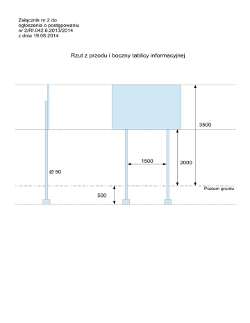 Załącznik nr 2 do ogłoszenia o postępowaniu nr 2/Rf.042.6.2013/2014 z dnia 19.08.2014 Rzut z przodu i boczny tablicy informacyjnej 3500 1500 2000 Ø 50 Poziom gruntu 500